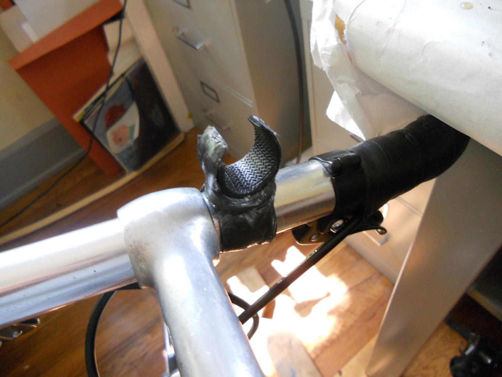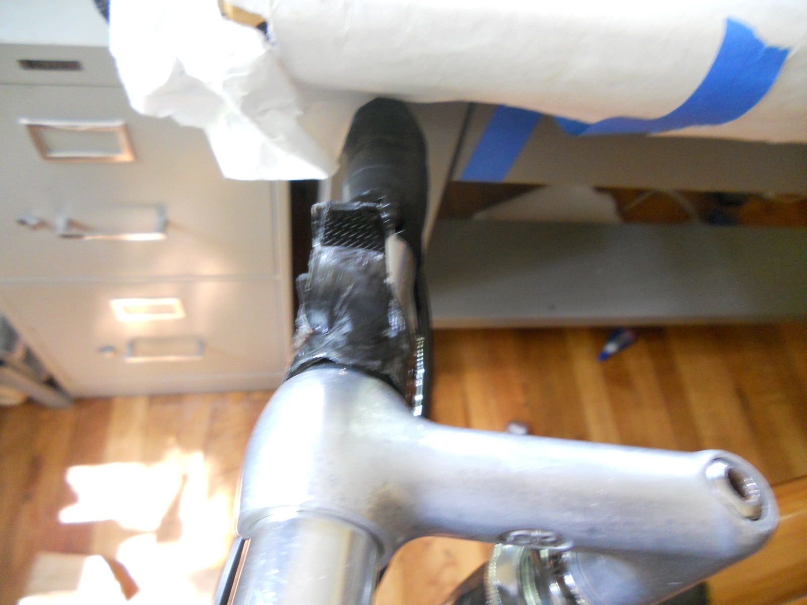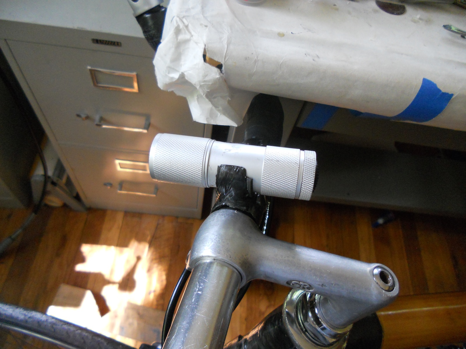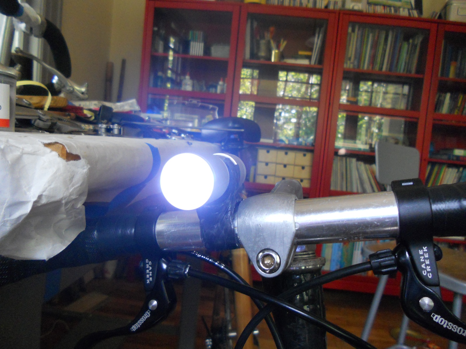 This handlebar mounted light holder holds a cheap 9 LED flashlight, and clips onto any bike handlebars. I built this carbon fiber holder out of the same carbon tow and epoxy I used for my bamboo bike frame. When layered thinly, the composite is flexible enough so that the holder can clip on and off the handlebars and light without needing any screws. I lined the holder with some handlebar tape so that it would grip the light and the handlebars. The entire holder weighs only a few grams, and can easily be switched between bikes.