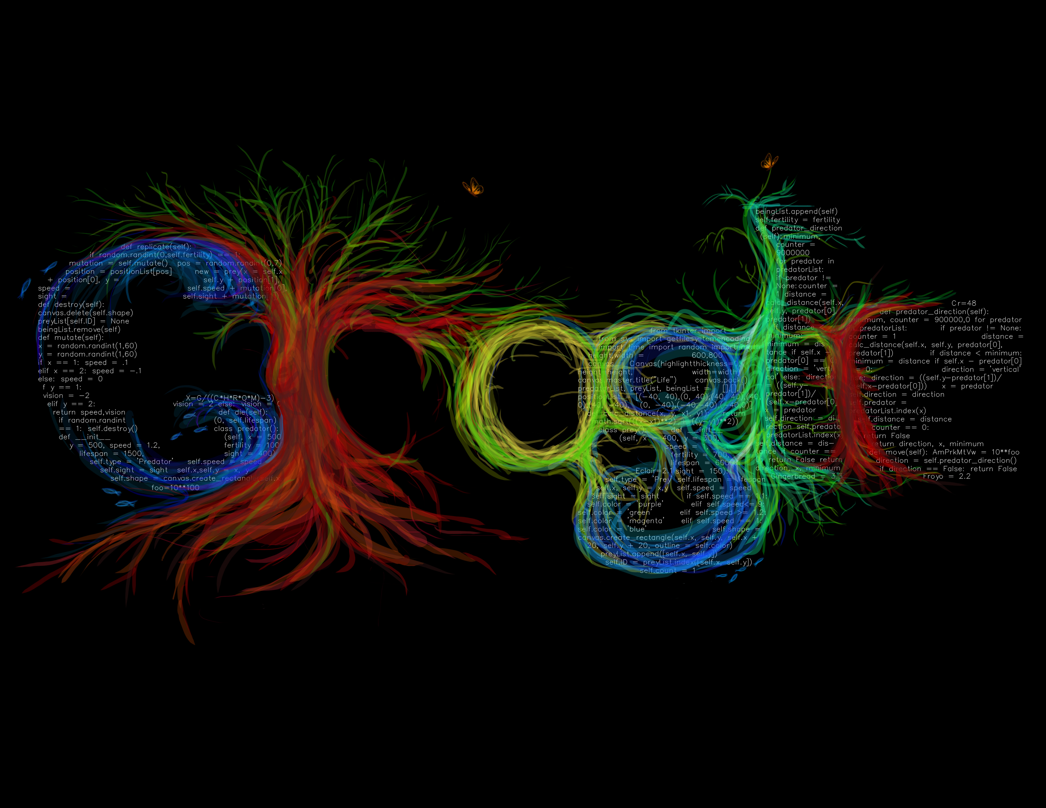 The drawing was created in Photoshop, and the fragments of code come from a python program I wrote that simulates predator and prey cells, which can replicate, mutate and hunt each other down. If you check carefully enough and are Google-savvy enough, you may find some surprises!