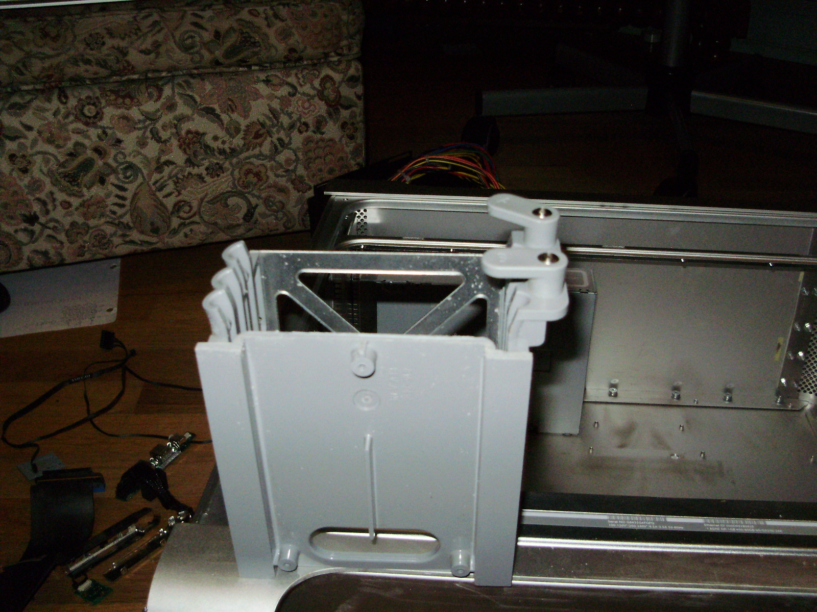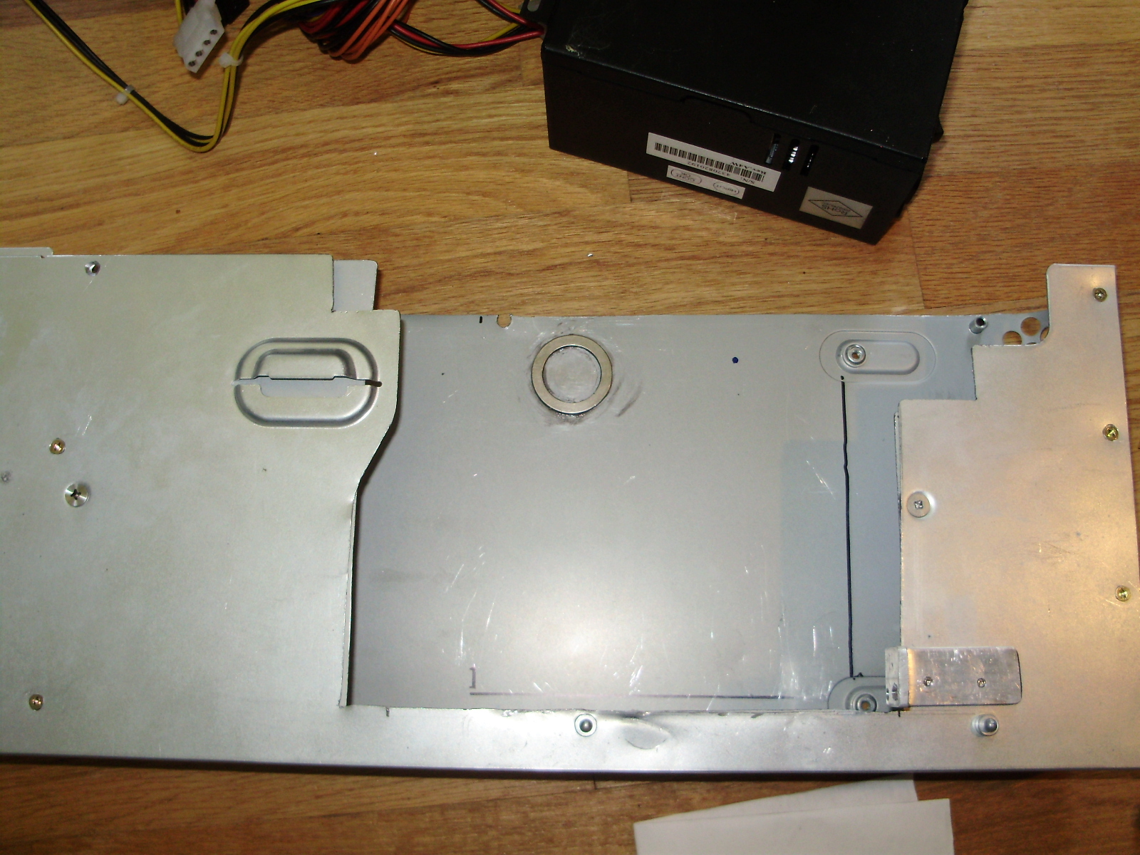 Because the stock G5 PSU is much longer and shorter than an ATX one, mounting the power supply was one of the most difficult parts of this project. Also, the front fans and the CPU cover both mount to the bottom divider, which is screwed directly into the stock power supply. To fit an ATX one but keep the bottom divider, I cut a hole in both the divider and the casing of the original power supply. I then added an aluminum bracket which the PSU can be screwed to on one side using a thumb screw. The other side of the power supply is fixed down with a neodymium magnet I glued to the bottom of the stock PSU. If you happen to have to glue a strong magnet, remember not to used JB Weld, as it has steel in it. The glue is attracted to the magnet, so it flows around the magnet and tries to coat the outside of the magnet evenly.