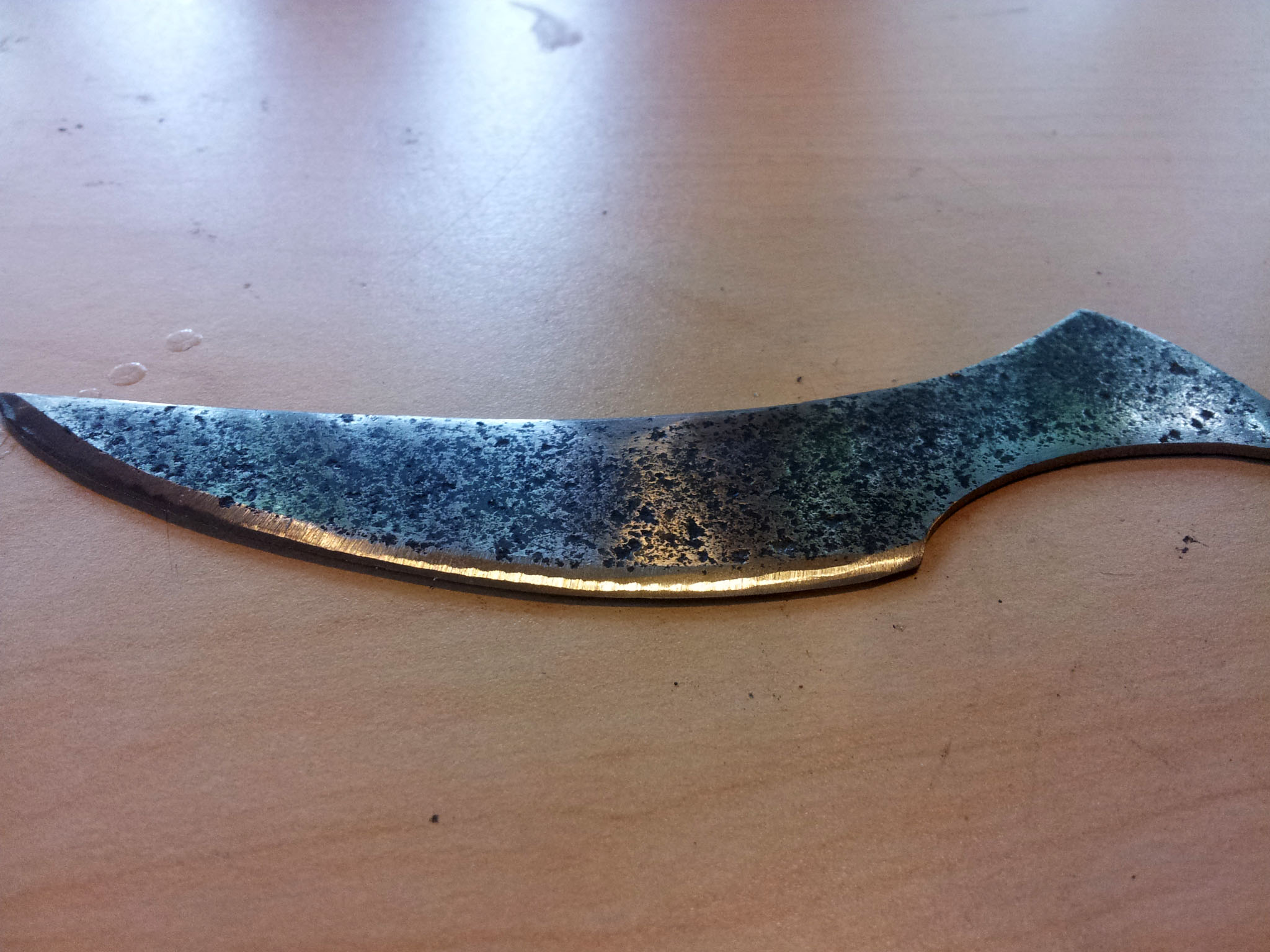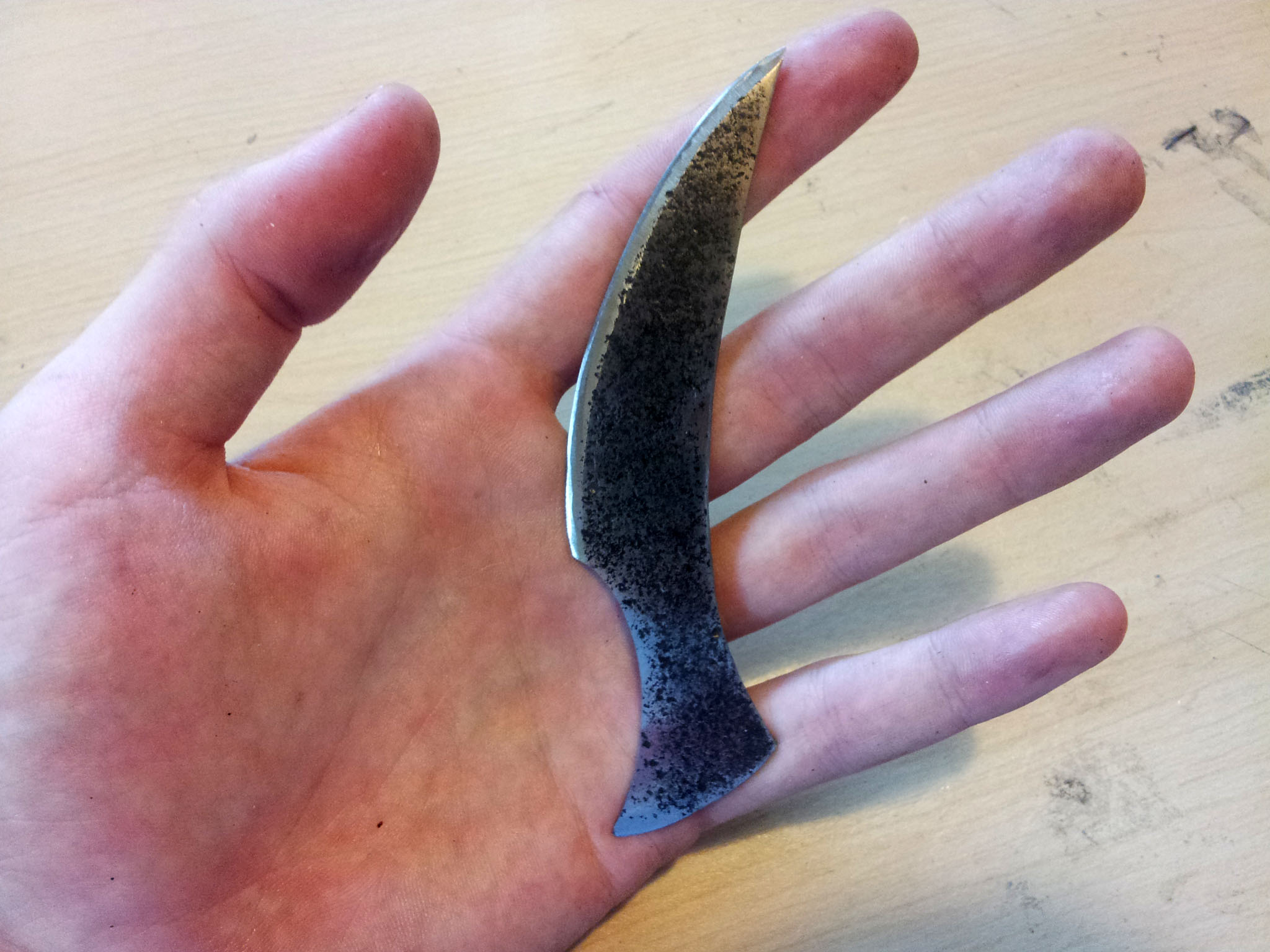 In a little bit of extra time I had, I ground this useless but nicely shaped knife blade out of a scrap of rusted tool steel lying around the shop. Once the rust was ground away, it left a nice pitted surface finish.
