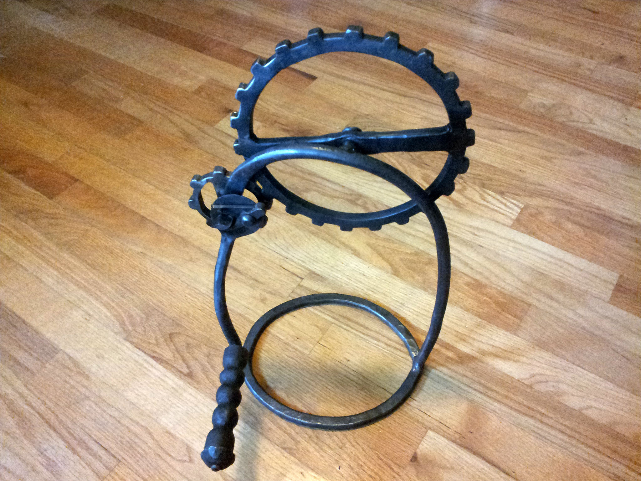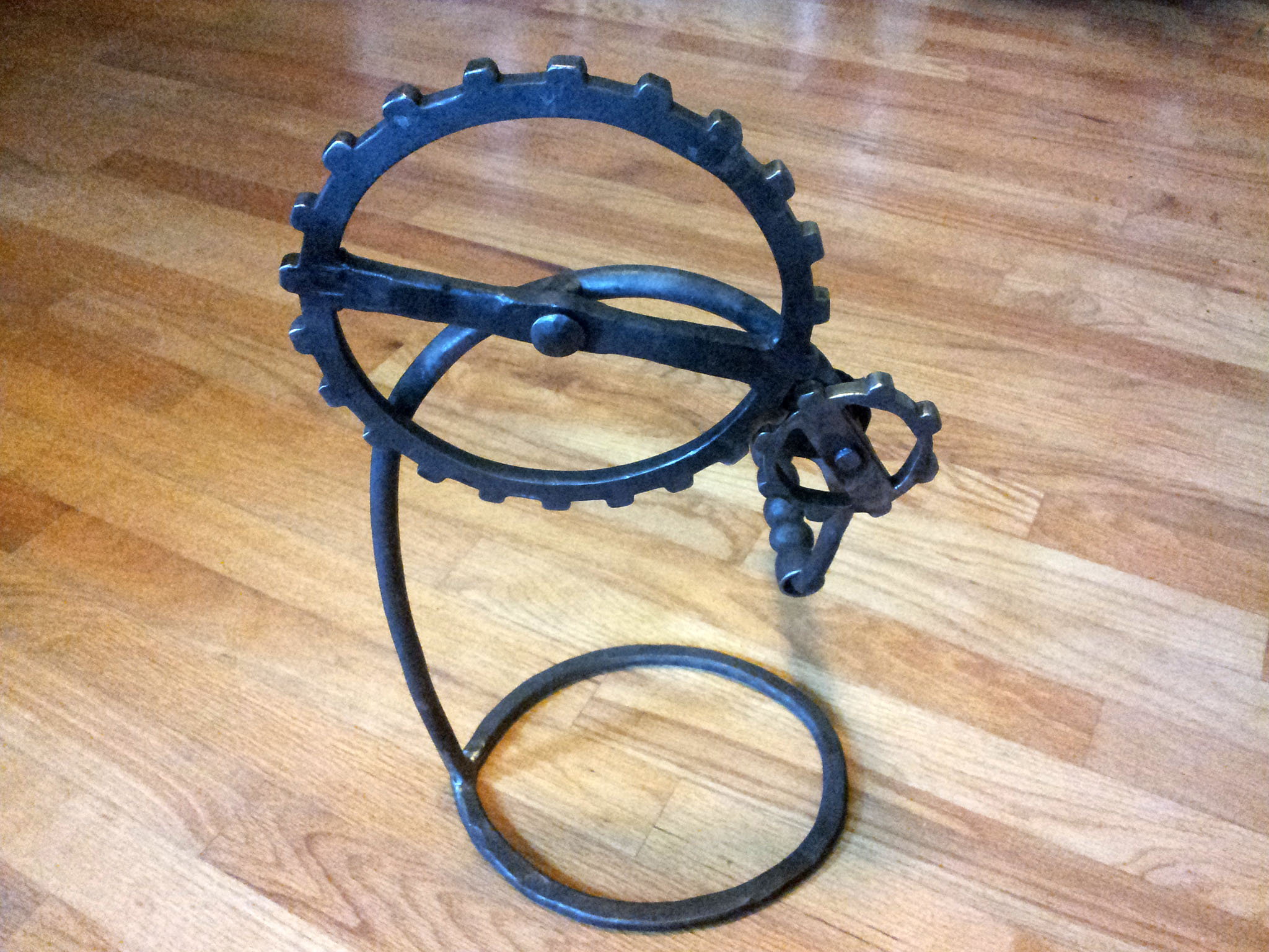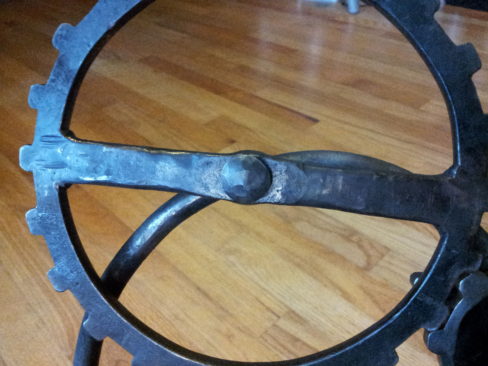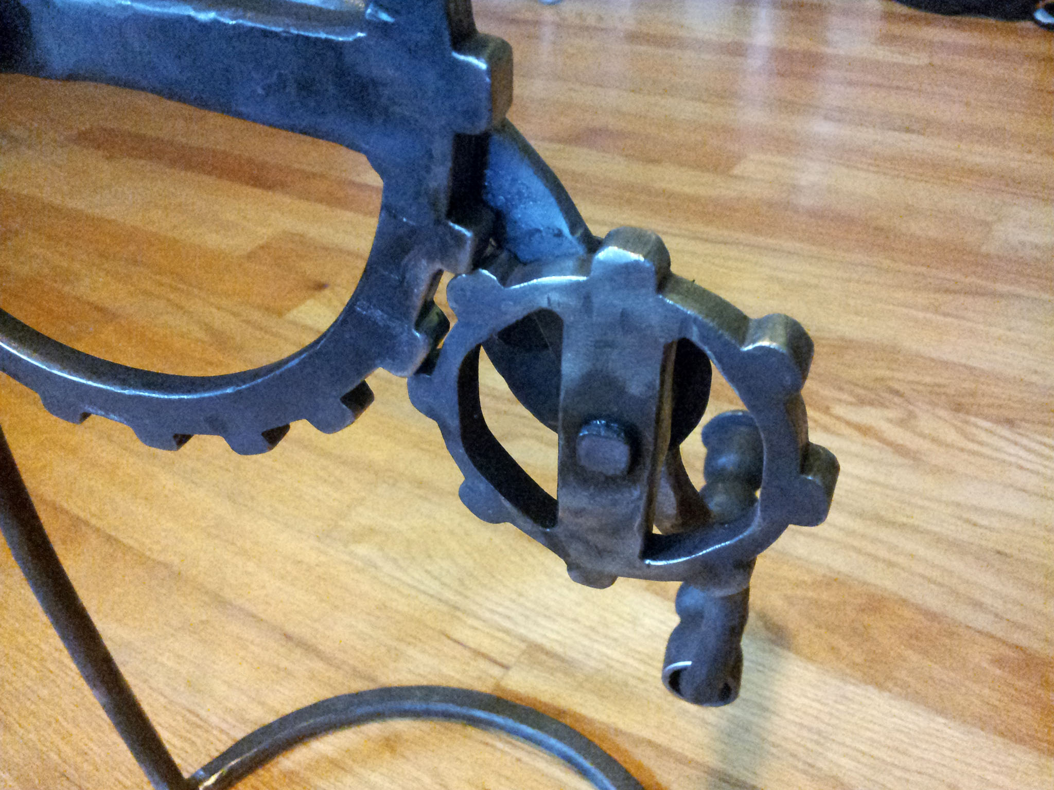 Here's the frist gear I made. I ended up not using it, because the teeth stretched too far apart when I bent the gear into a circle. For the small gear I ended up using, I halved difference between the outer and inner diameters of the gear (minus the teeth), so that the metal would stretch less when I bent it. The edges were smoothed and given a worn look by wire brushing them with an angle grinder.