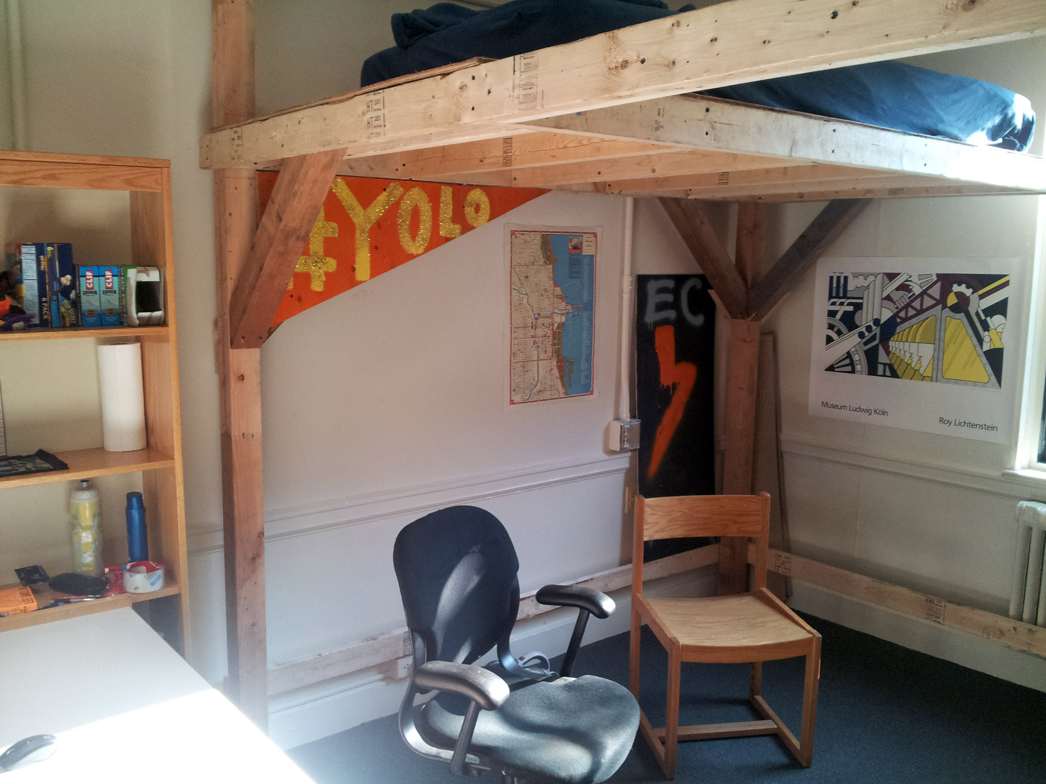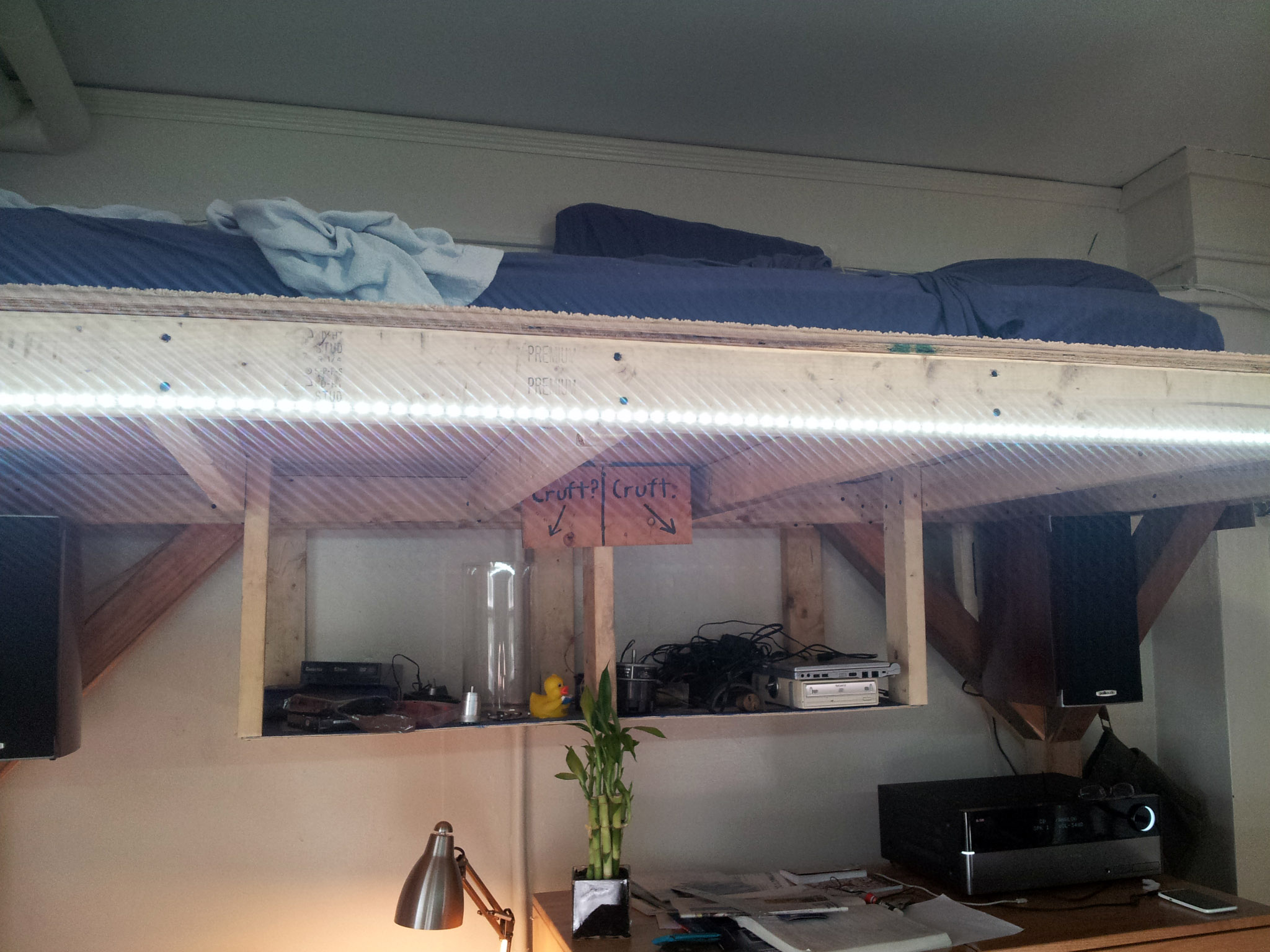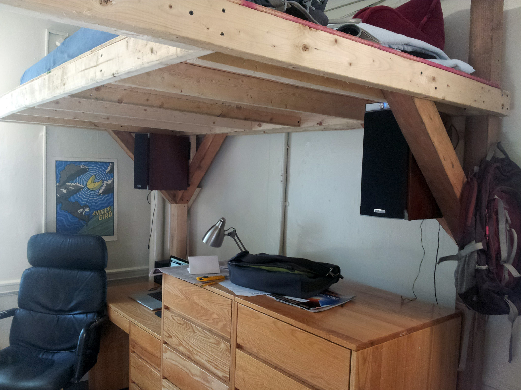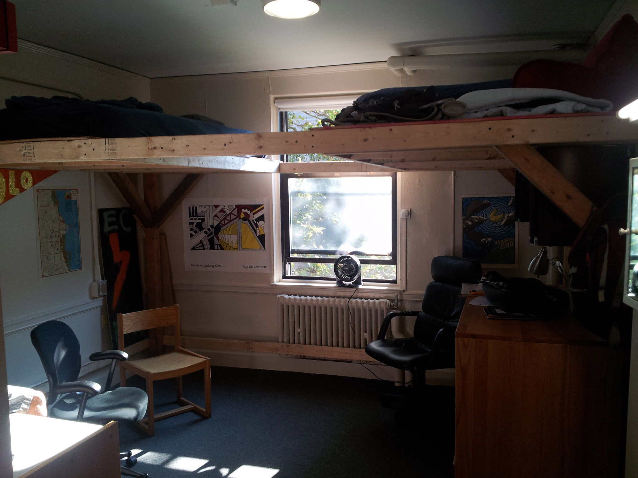 Using wood left over from the REX shenanigans in the East Campus courtyard, my roommate and I built a double loft in our room. We put up the loft in record time - we only had to sleep in our institute-provided beds for a total of one night before we could sleep in the loft. The design we used was based on another loft down the hall. It spans the entire room, so there are no supports in the middle of the floor, and it is tall enough to walk under without having to duck. It also includes integrated speaker mounts, a cruft shelf, and LED strip lighting.