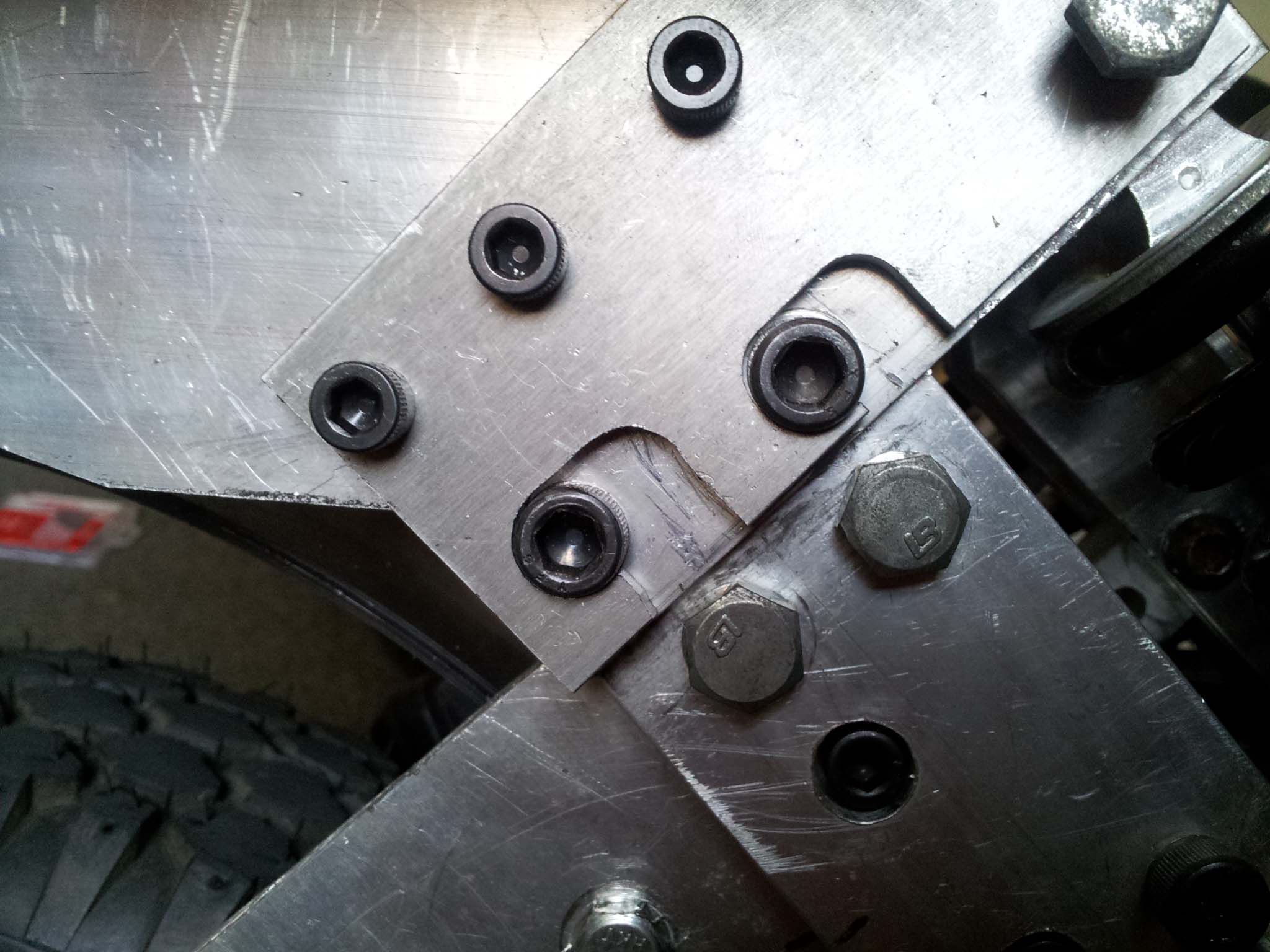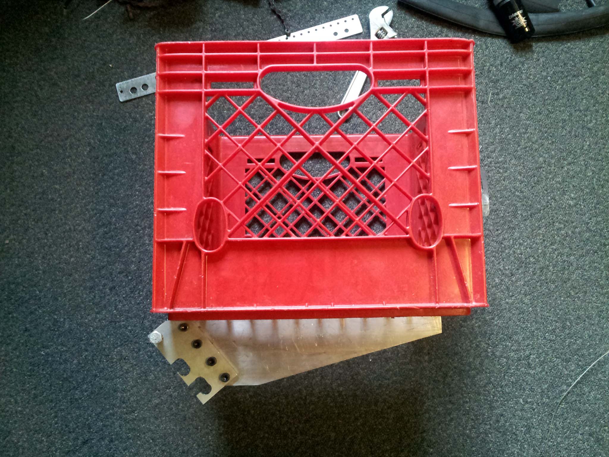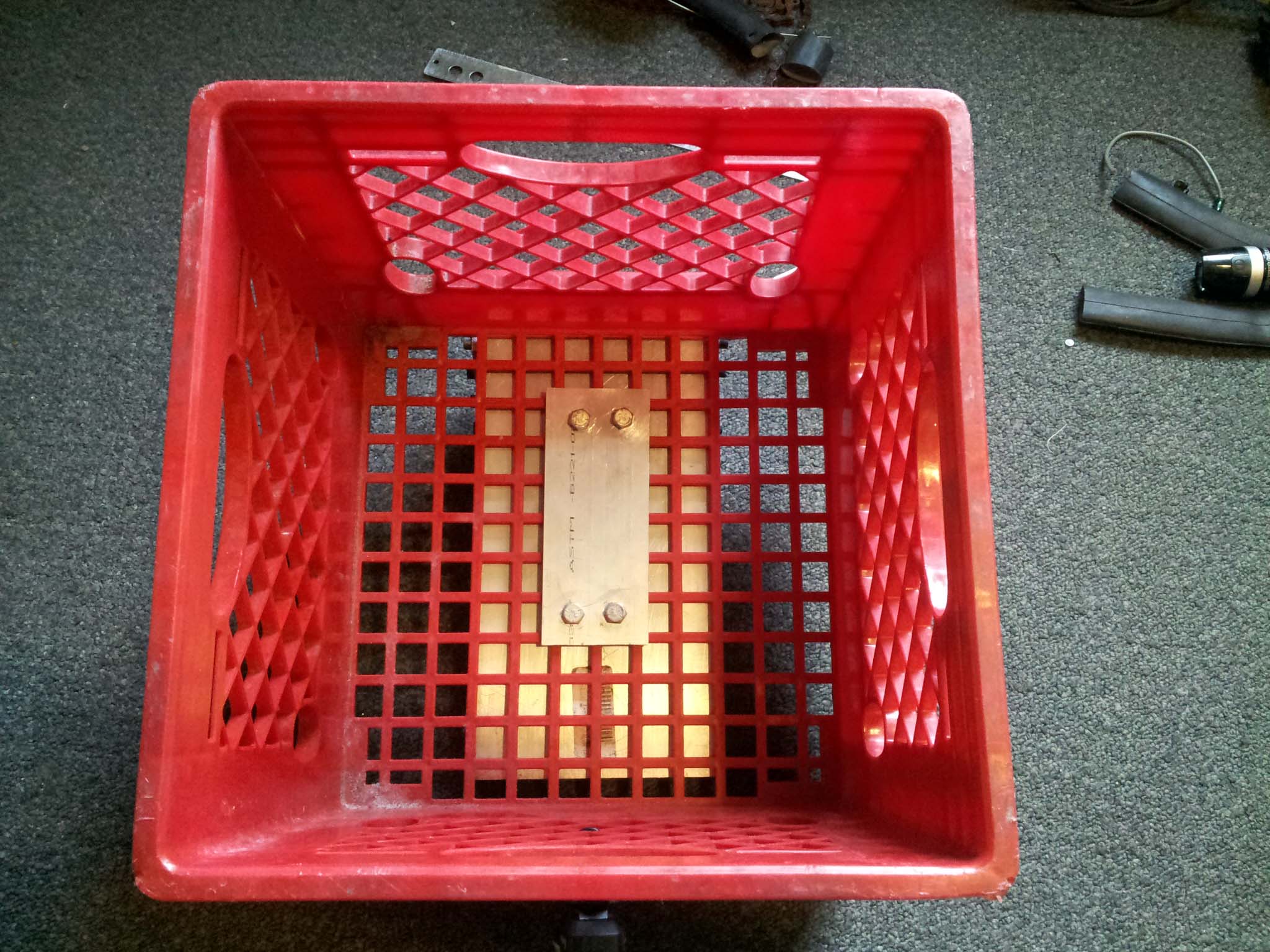 The crate is clamped to the rest of the structure by an aluminum plate and four bolts: