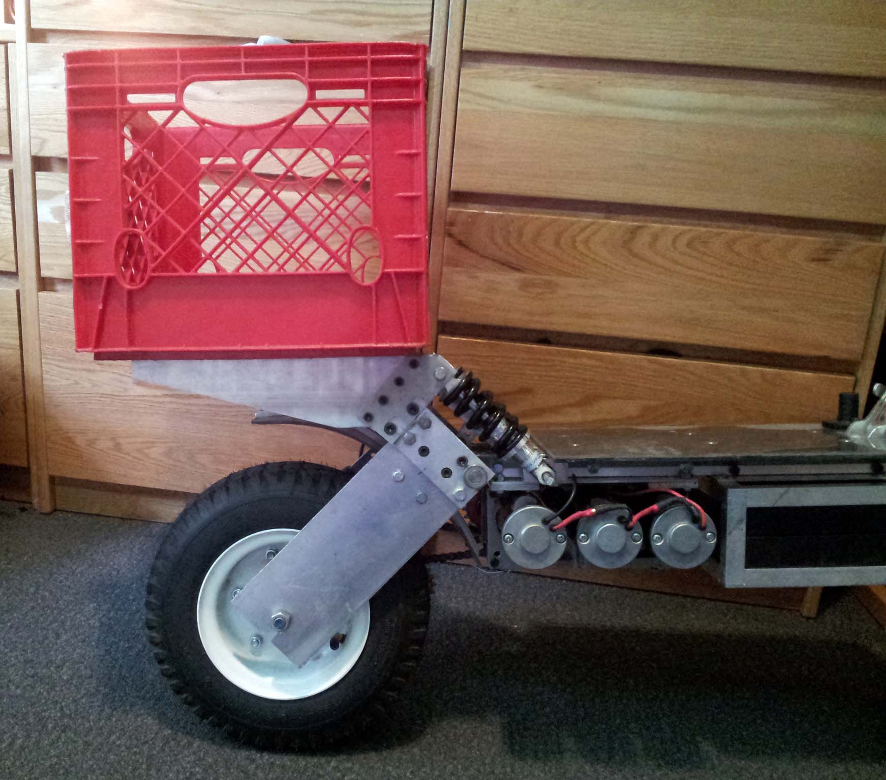 In an effort to make the scooter into a semi-useful vehicle, I built a set of attachments for it. The first step was to make a fender for the rear wheel. In the event of me riding through water, based on the angle between the back of the scooter frame and the top of the rear wheel, water flung off the back wheel could easily end up somewhere between the back of my shirt to the back of my head.