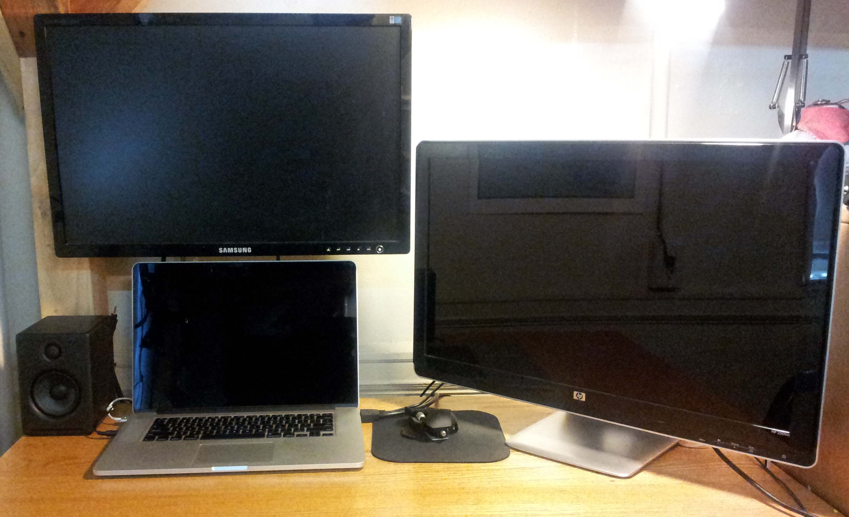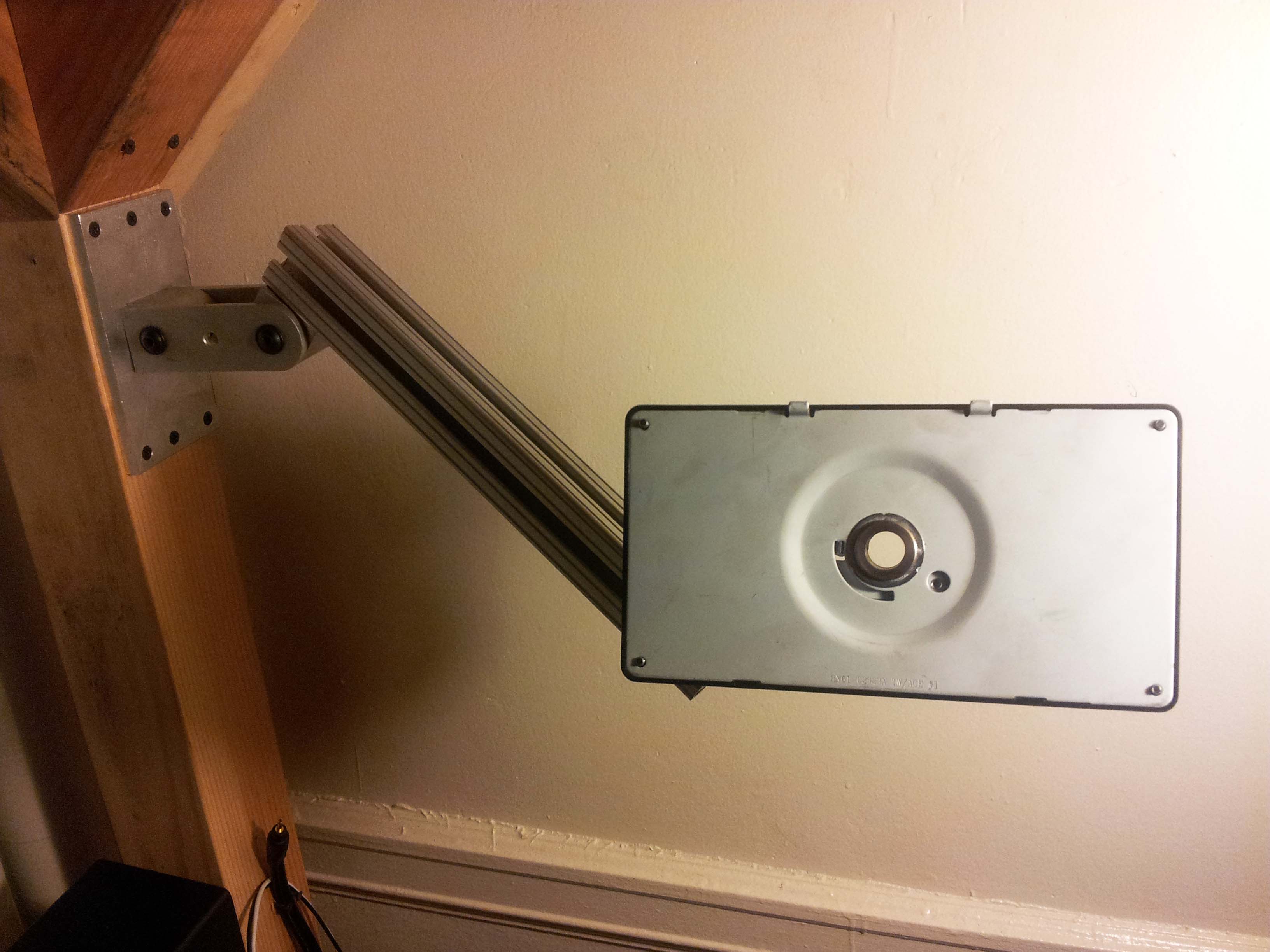 By a combination of luck and keeping a close eye on the reuse mailing list, I have acquired a pair of nice, large computer monitors: A 24" 1920 x 1200 SyncMaster 245BW and a 25" 1920 x 1080 HP 2509m. Both screens were easily repaired by replacing dead capacitors on their power supply and inverter boards. Due to the small size of the stock dorm room desks, the two monitors plus my laptop could not actually fit on my desk with space left for anything else, so I built a monitor arm that bolts to my loft out of some 80/20 extrusion.