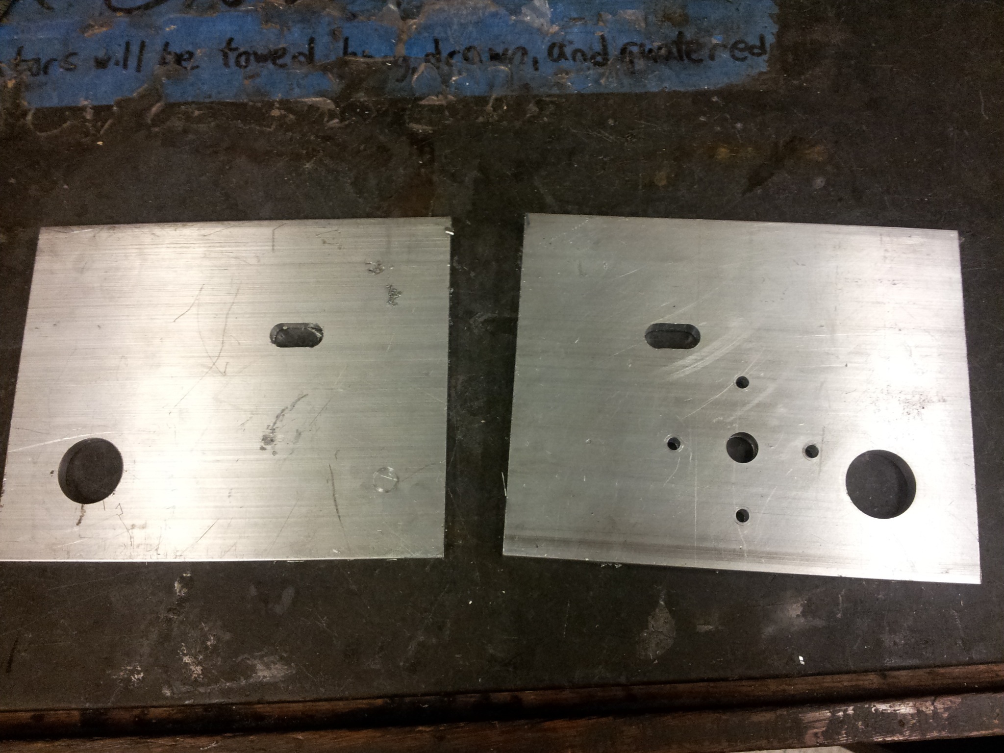 On to different things. Here are the two plates that support most of the drivetrain components. Since I don't (yet) have access to all the nice things on campus, these were made on the mill.