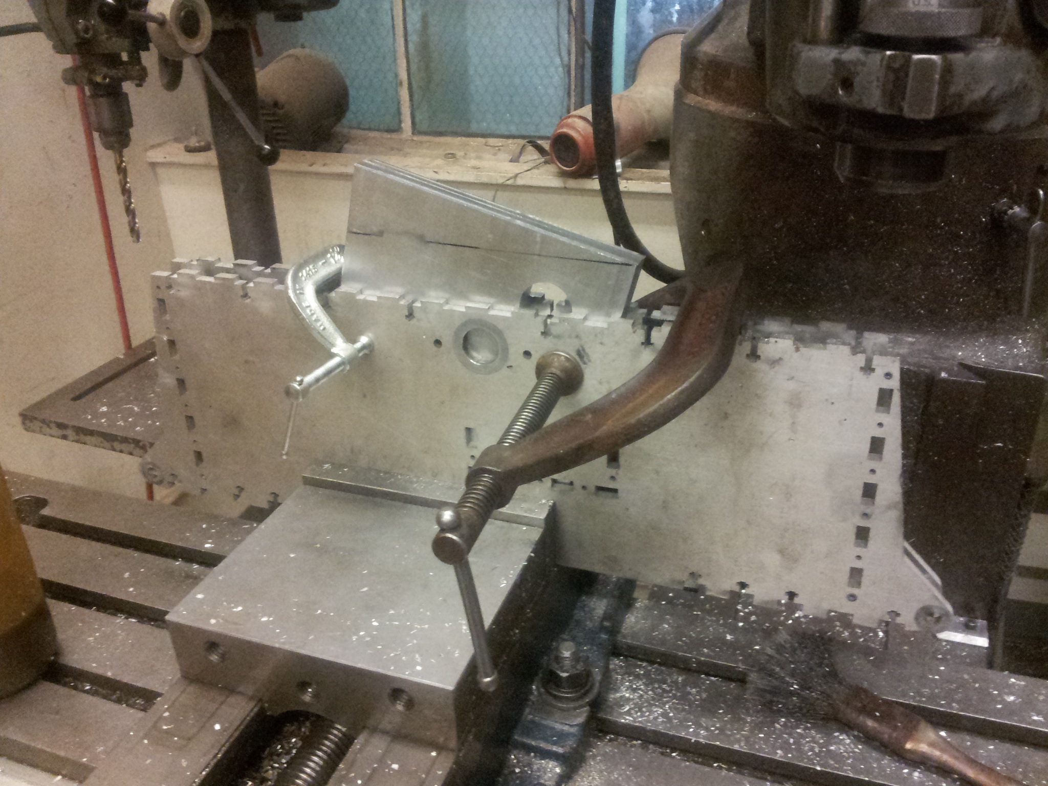 To angle the plates, I did some ninja-clamping in the mill using the old side panels from LandBearShark to prevent the plates from chattering too much. Since the bandsaw was not cooperating at the time, I just milled off all the material above the line.