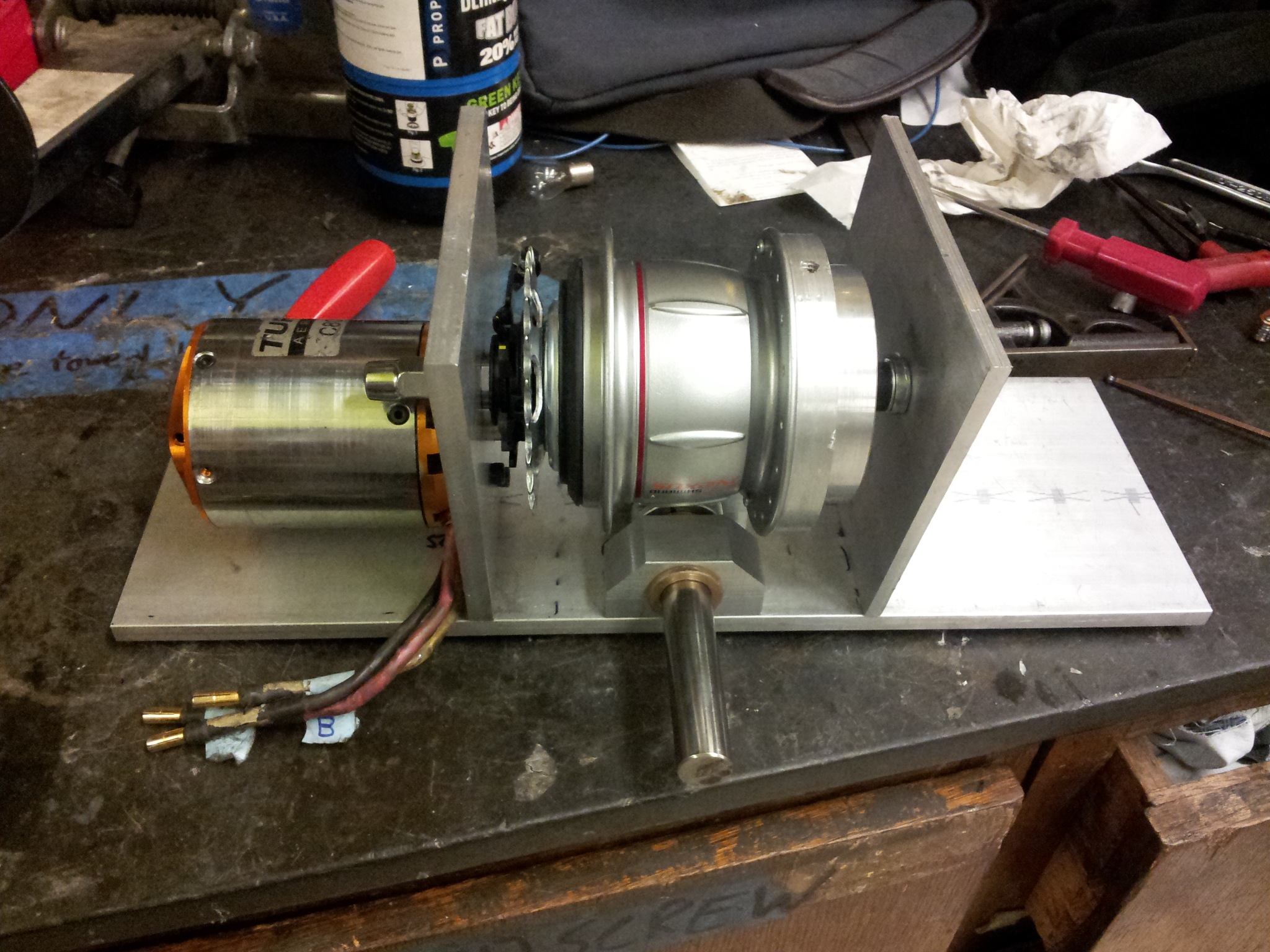 Here are the hub and the motor bolted to the two drivetrain-supporting plates: