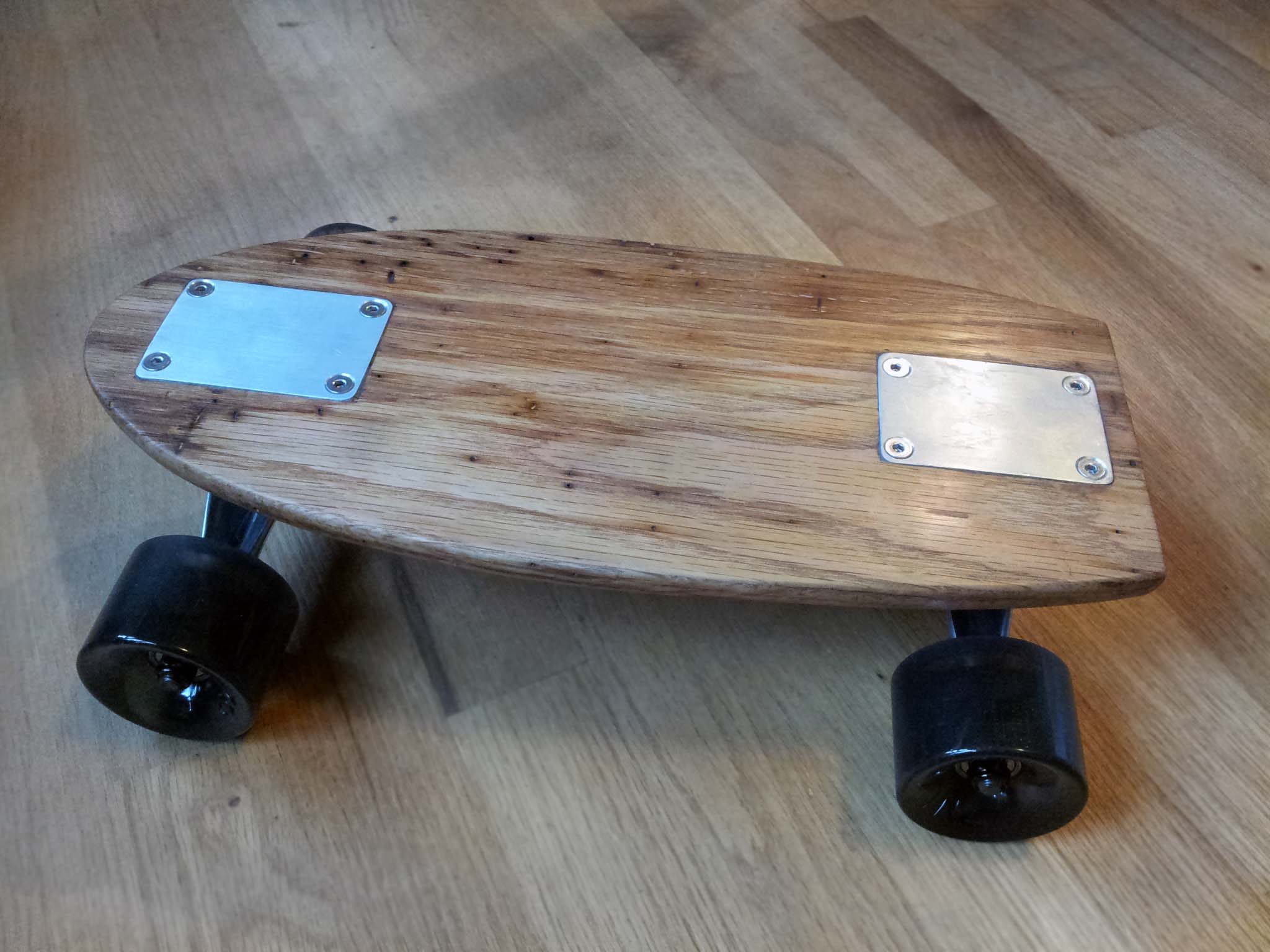 PocketBoard is a 14.5" long skateboard designed to be the opposite of my electric scooter: It is a small, simple and reliable vehicle for going short distances quickly. At roughly 5% the weight of the scooter and some small fraction of the volume, I can easily store it in a backpack or even my laptop bag when I'm not riding it. It has a solid oak deck with inlayed aluminum plates, and (what I assume to be) standard skateboard trucks, along with some soft 60mm diameter wheels.