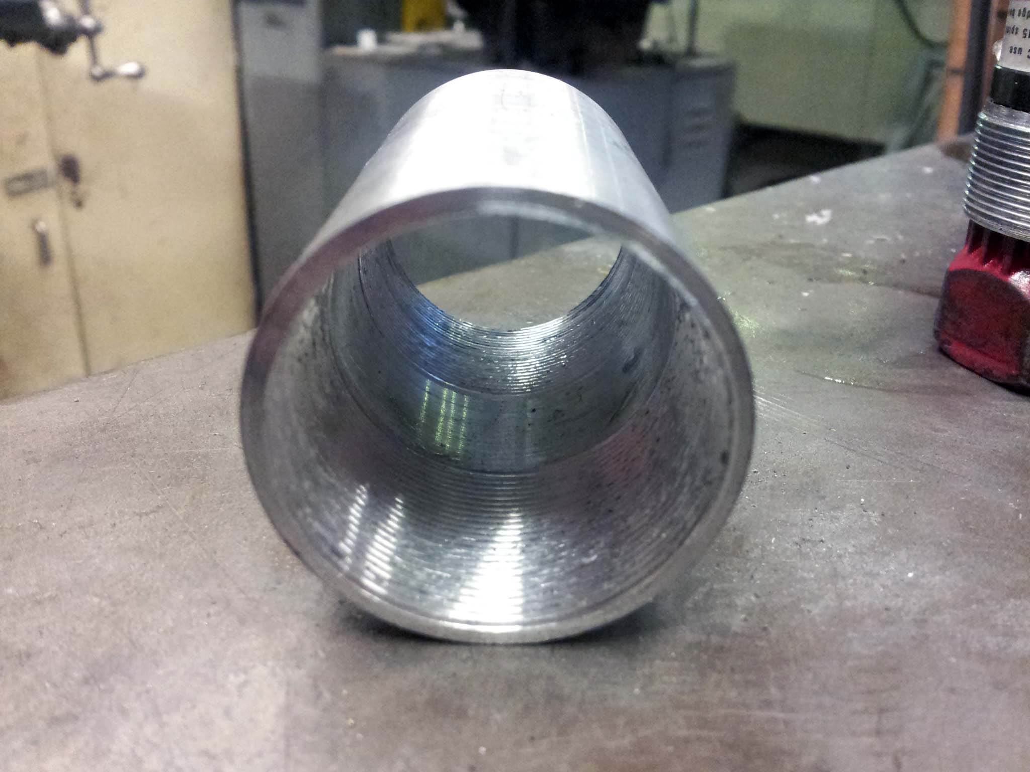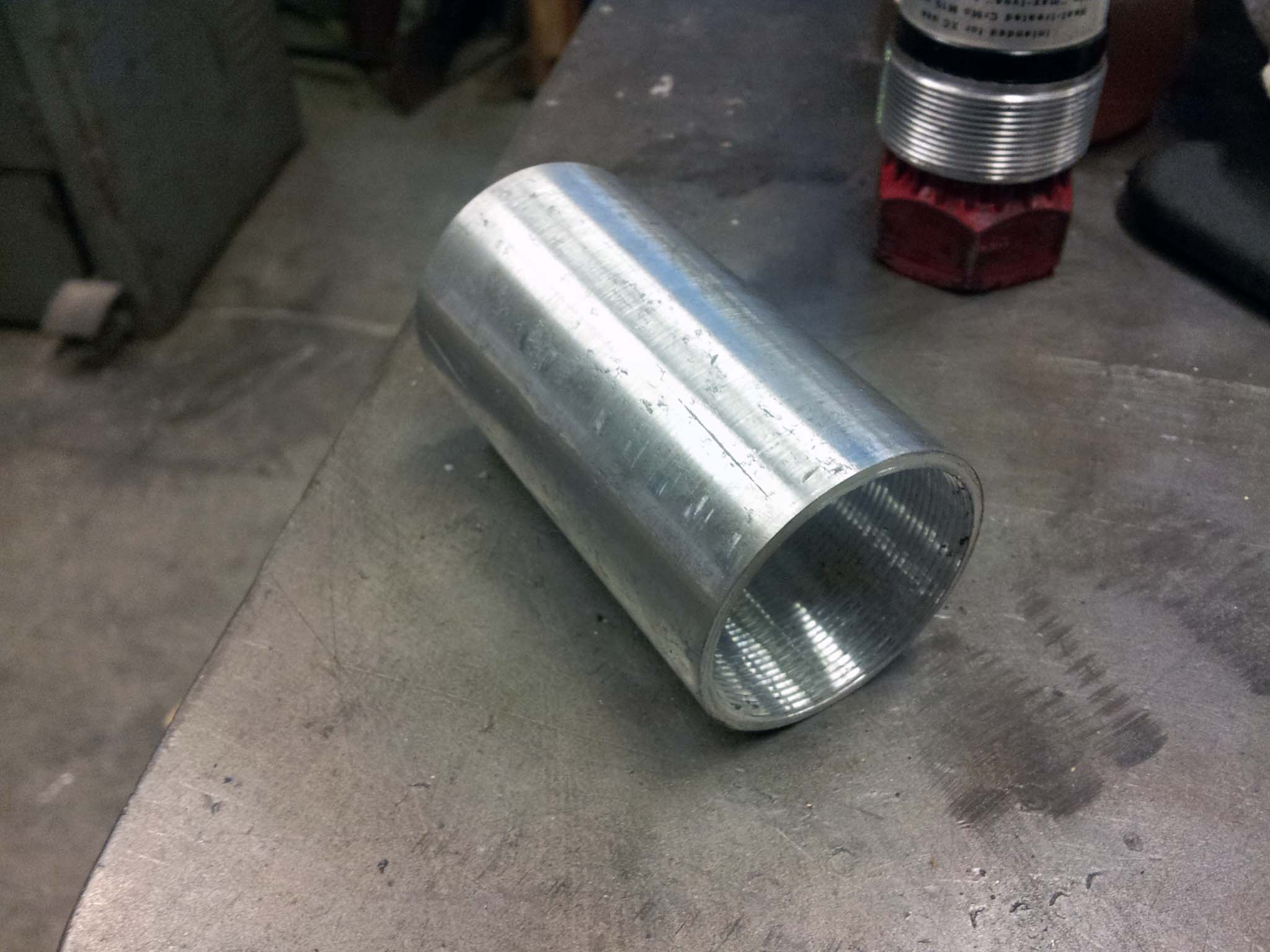 Rather than deconstructing an old aluminum frame for the head tube, bottom bracket shell, and dropouts, I will be making my own. I learned how to make threads on the lathe, and made my own BB shell out of some aluminum tubing. It is much thinner than one you would find on an all-aluminum bike, but since it will be wrapped in a few layers of fiber-reinforced-epoxy-composites it should be fine. All the aluminum parts of the frame will be coated first in a layer of fiberglass composite before any carbon fiber, to prevent galvanic corrosion.