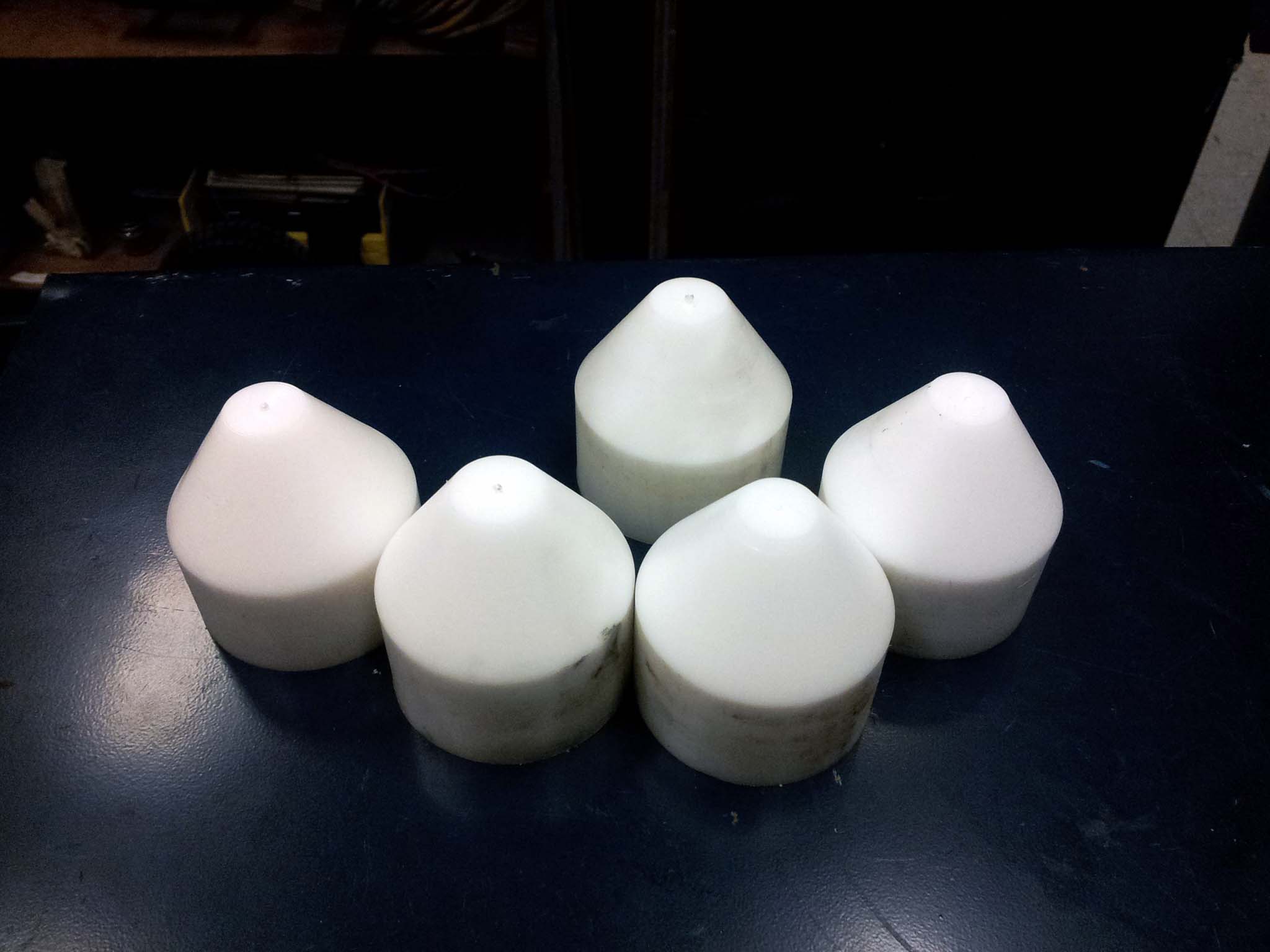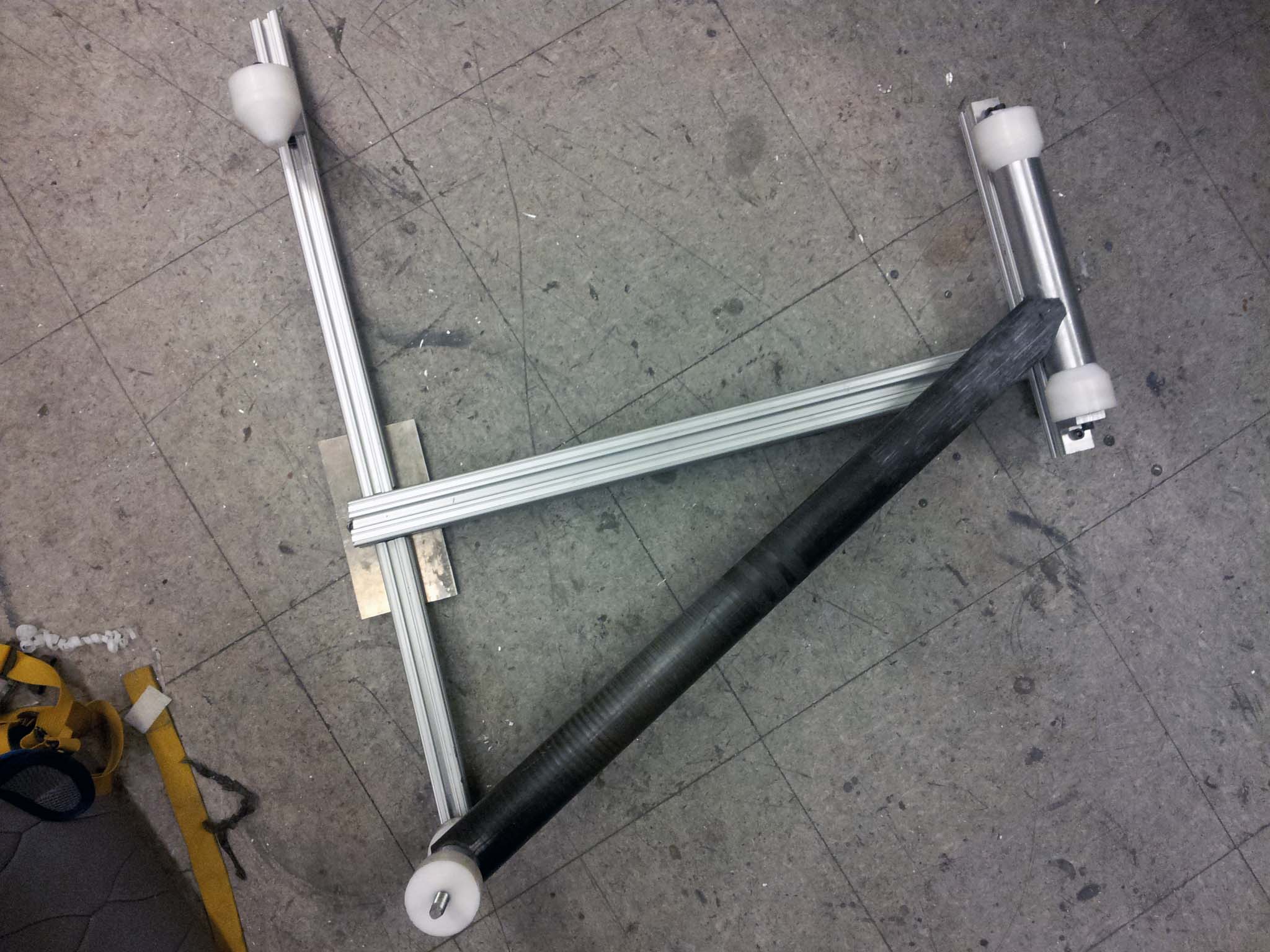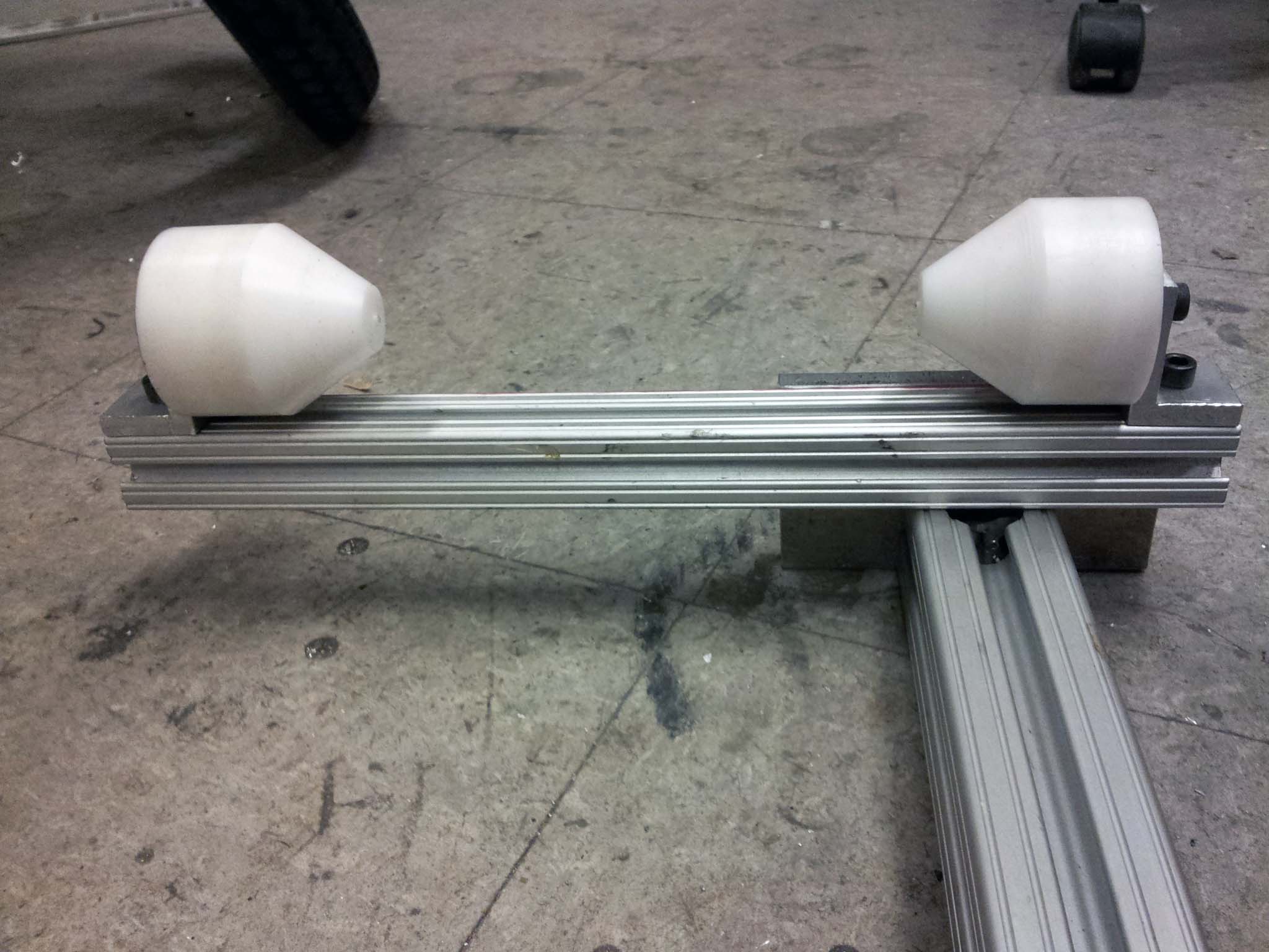 Unlike my bamboo bicycle build, this time around I do not have a donor bicycle I can use as a jig. I built my own jig using some 80-20 extrusion, nylon rod, and aluminum plate I could scavenge. I turned the nylon rod into 5 cones. These cones will fit into the ends of the frame's tubes, holding them precisely centered.