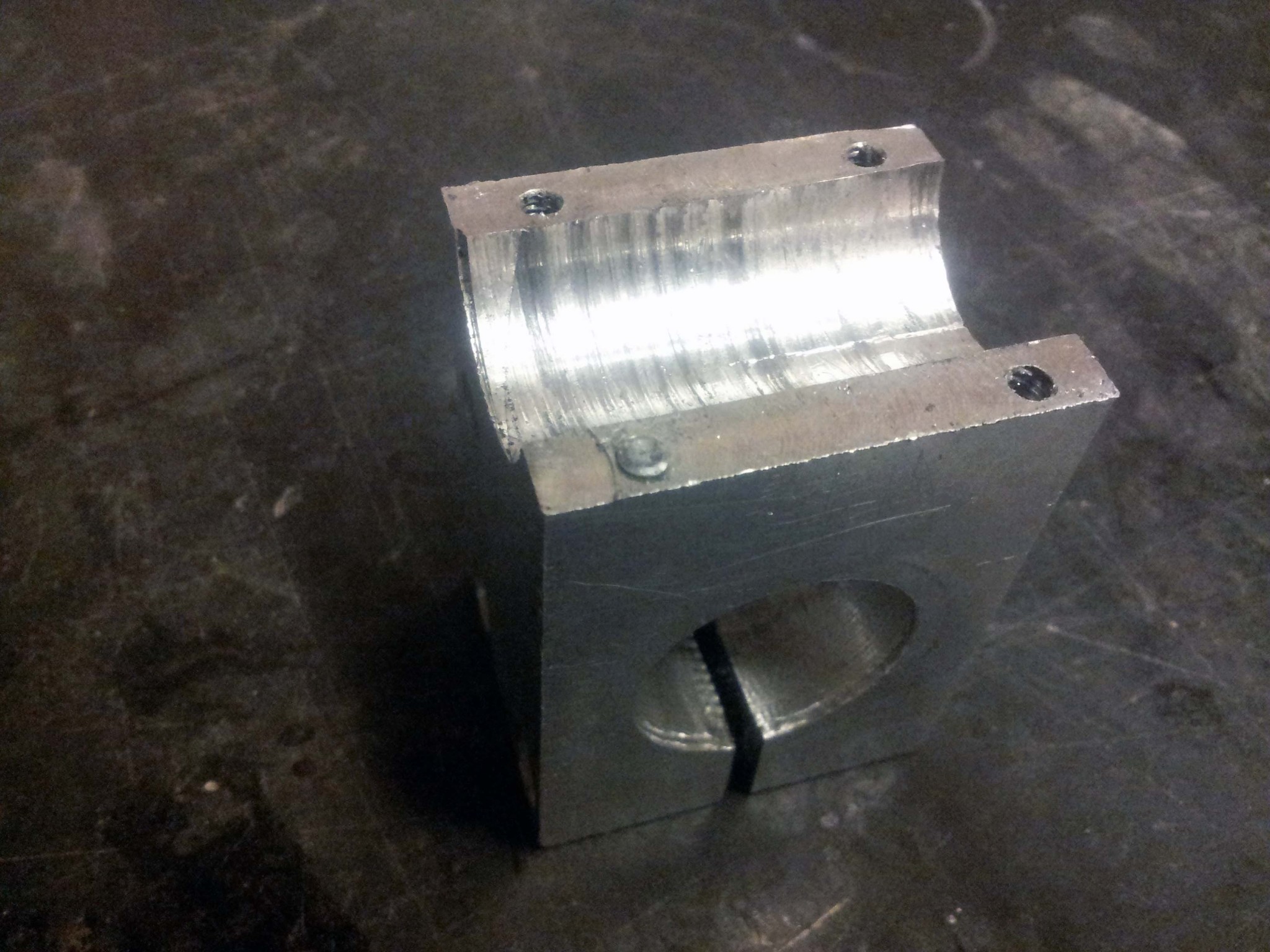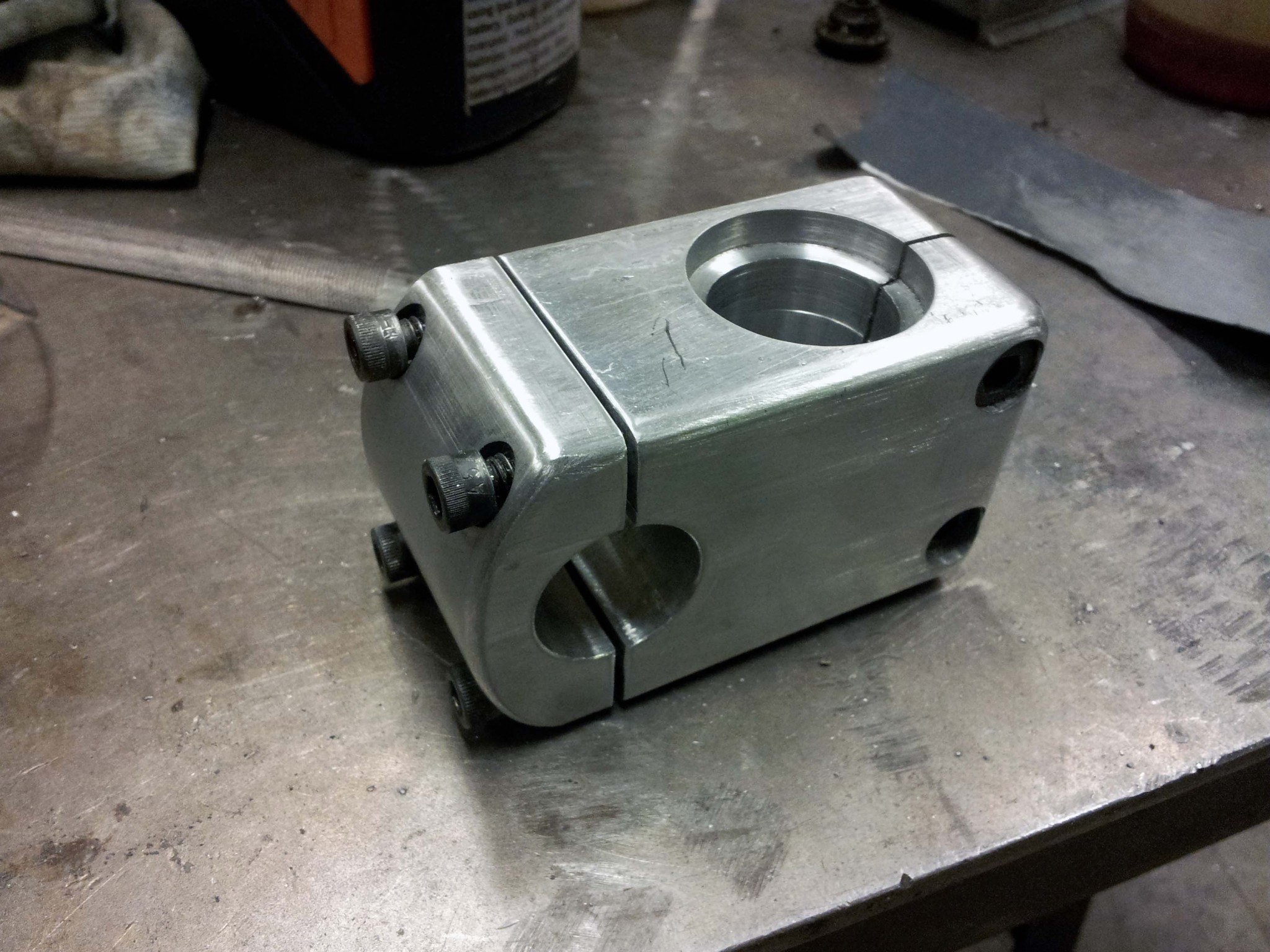 Before doing any thorough testing, I remade the stem, which I broke just before TechFair. The original stem was made from a block of aluminum that was a little bit too small. I had to use thinner bolts than I would have liked to, and they were the super-shady kind of bolt MITERS probably purchased by clicking "sort by lowest price." The fit around the handlebars was never ideal, so I had to crank the bolts especially tight to stop the bars from rotating. I overtightened one of the shady bolts, and sheared it off inside the stem. I may have been able to remove the left over bolt-stump, but the failure was a good excuse to make a new and better stem.