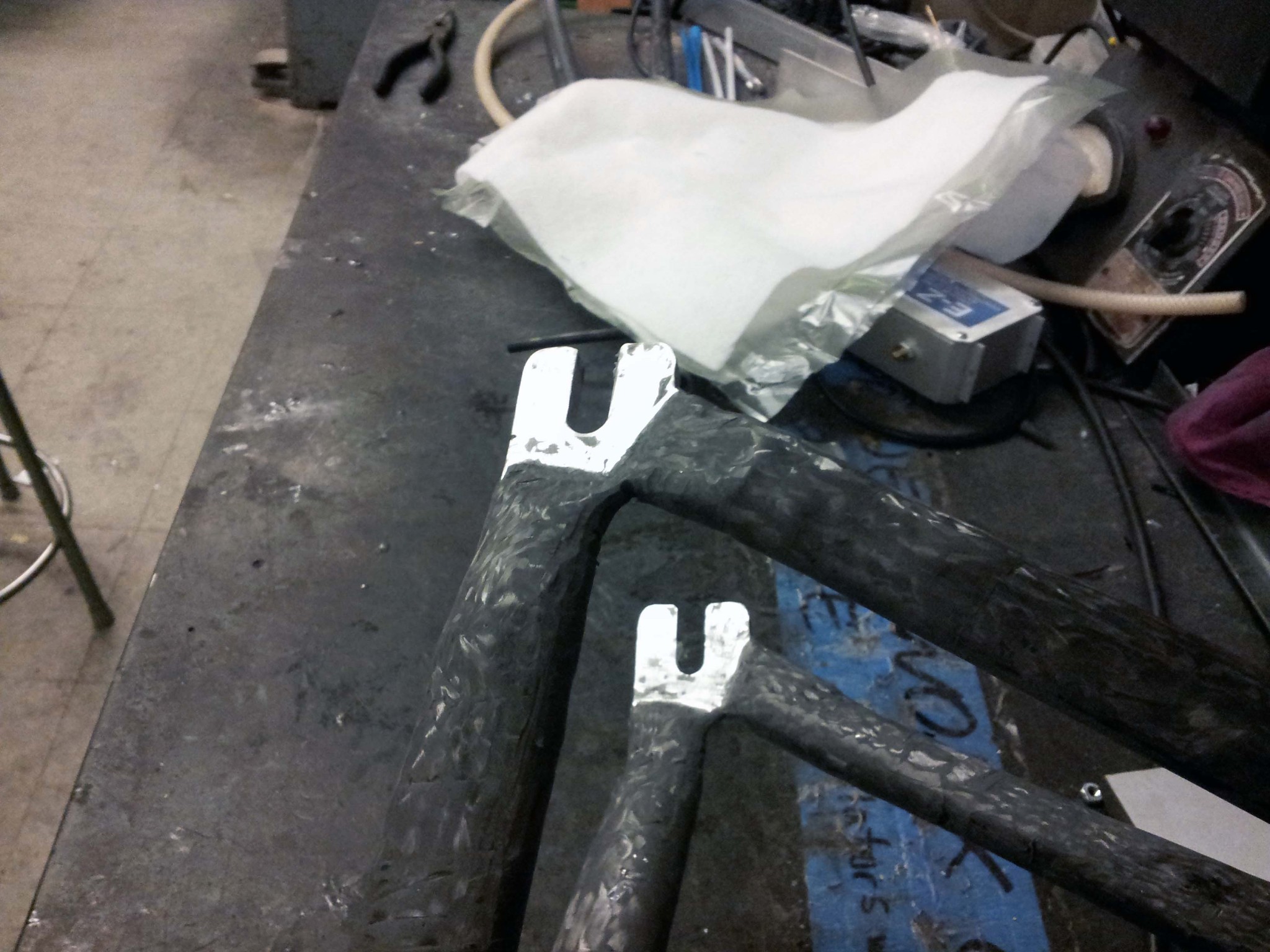 I made the seatstays using pretty much the same process as I did for the chainstays, but with carbon fiber cloth instead of bundles of tow. I plan on adding an aluminum insert for the rear brake to clamp into.
