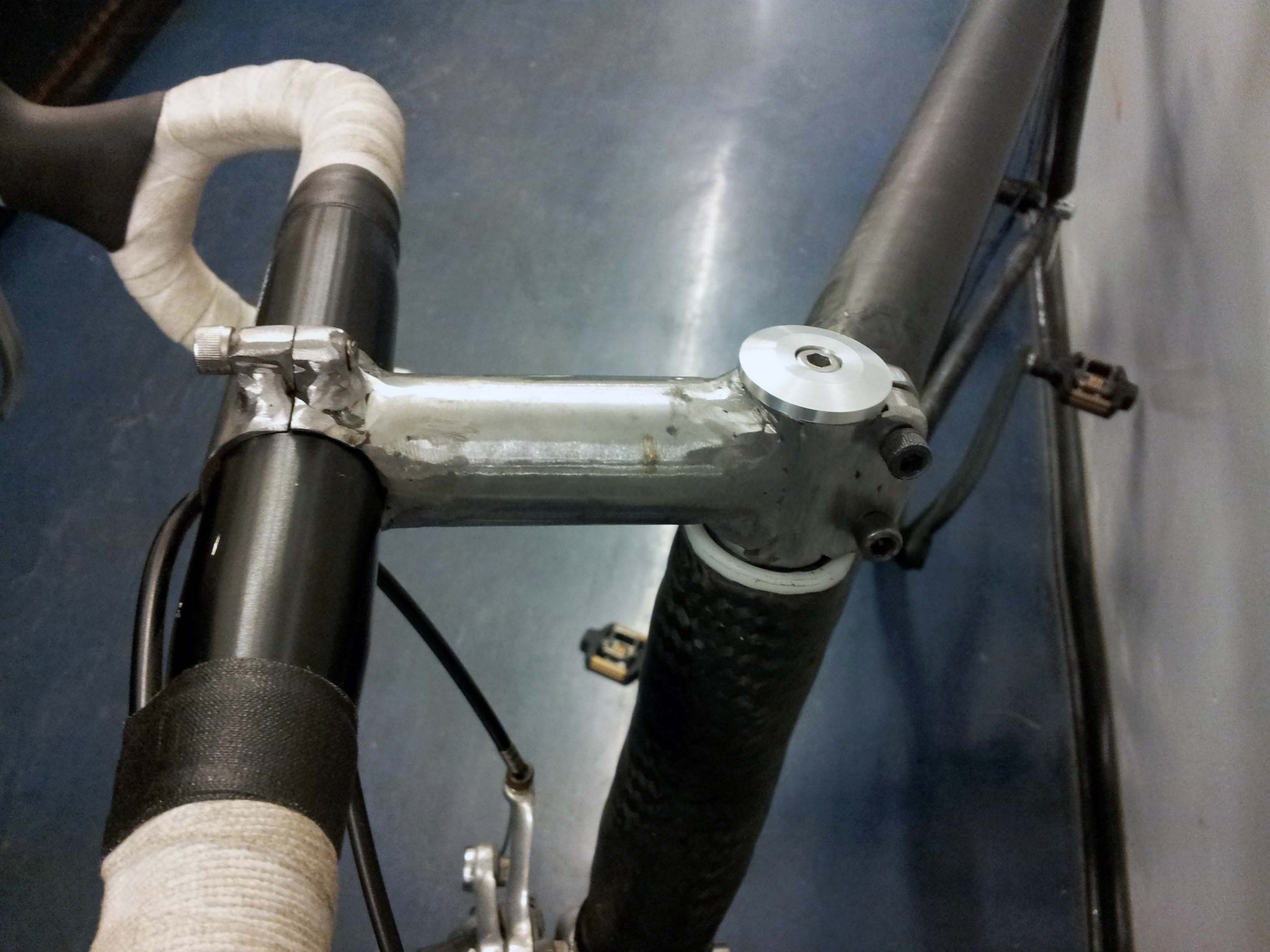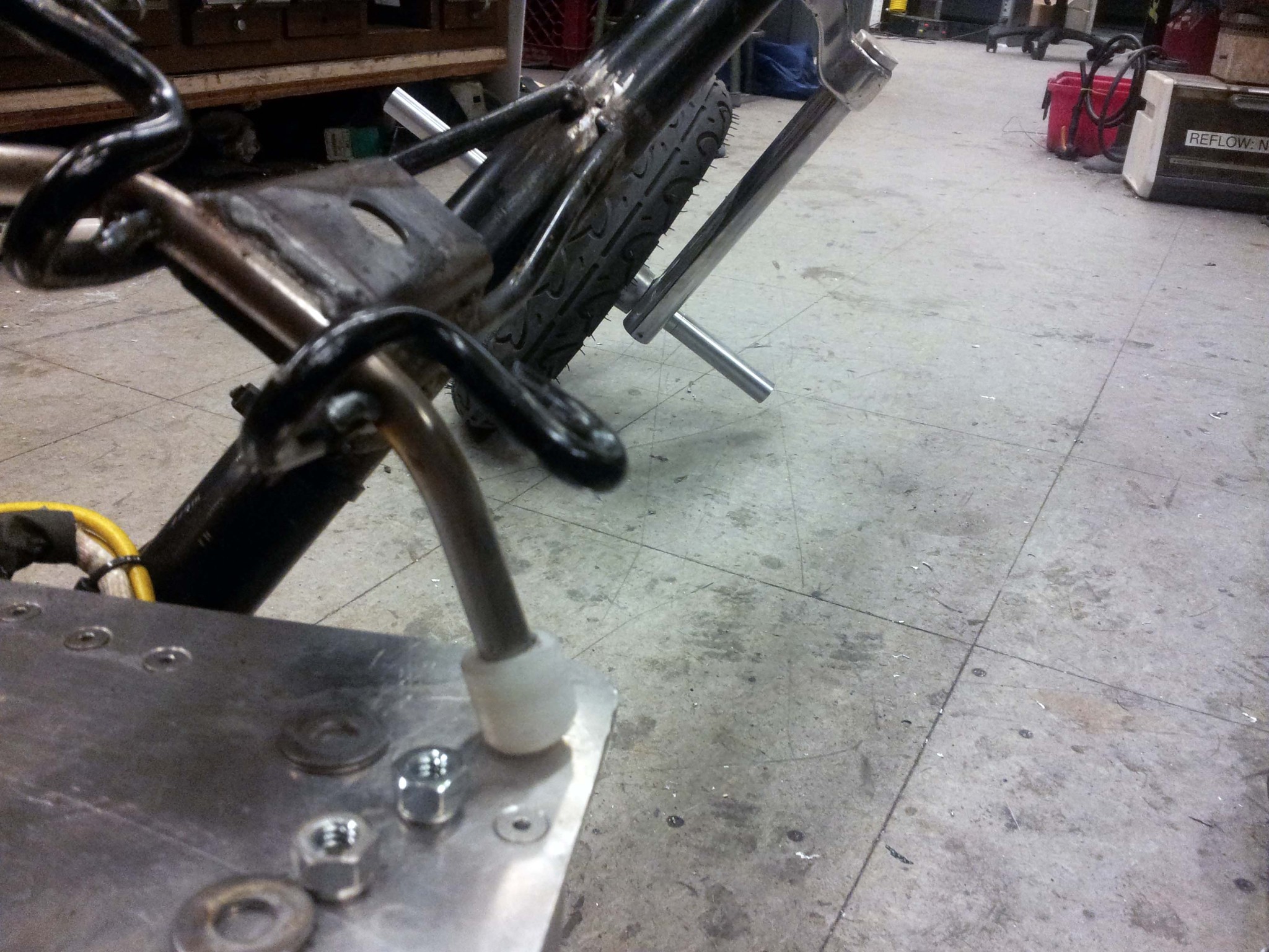 I was not able to scavenge a stem, so I welded up my own out of... steel. When the new TIG welder arrives at MITERS, and I learn how to use it properly, I'll weld up an aluminum one. I did not have a proper set of bearings for the top of the headset, so I made an experimental headset bushing out of Delrin.