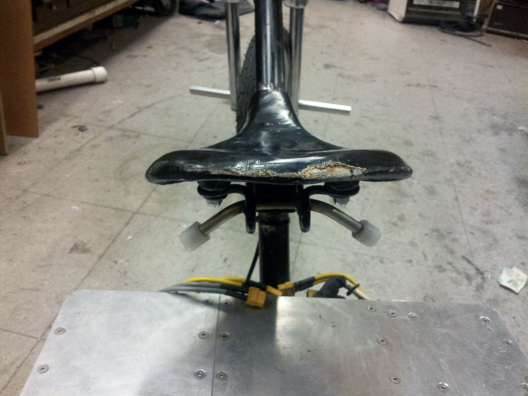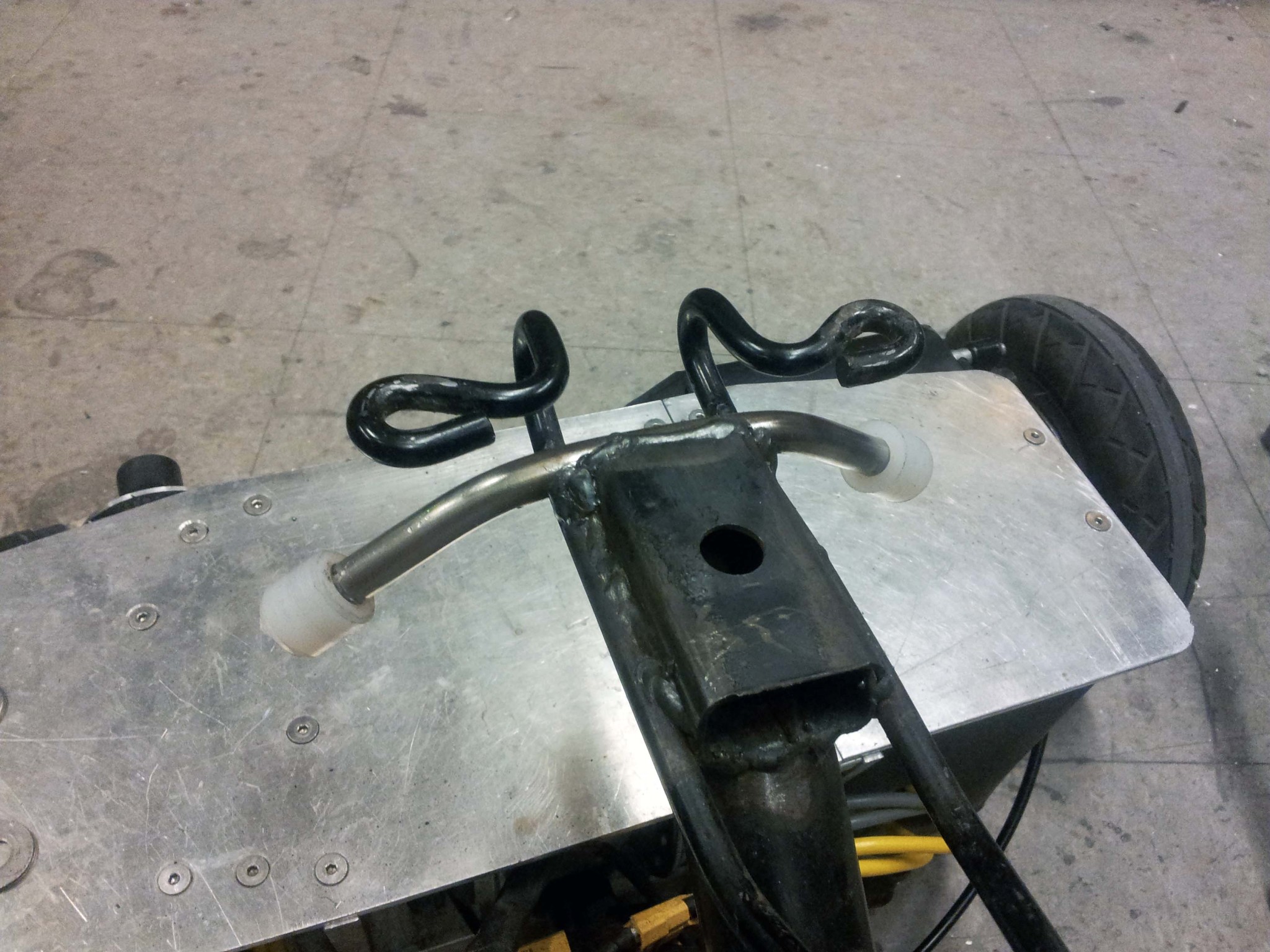 The easiest and least intrusive way to limit leaning was to add stops just under the seat. I bent some thick steel rod, and welded it under the seat frame. I added nylon caps to the ends, so the steel will not gouge into the aluminum.