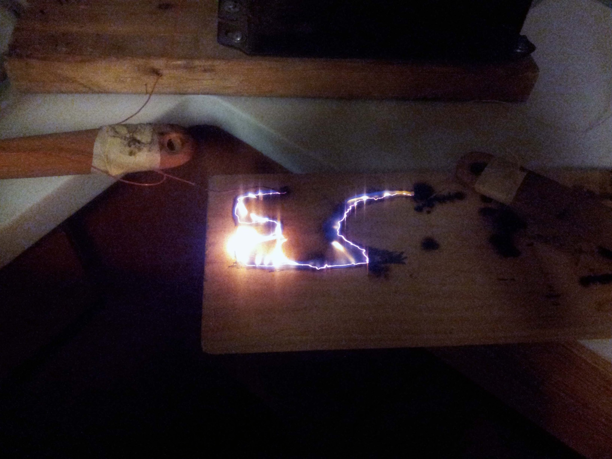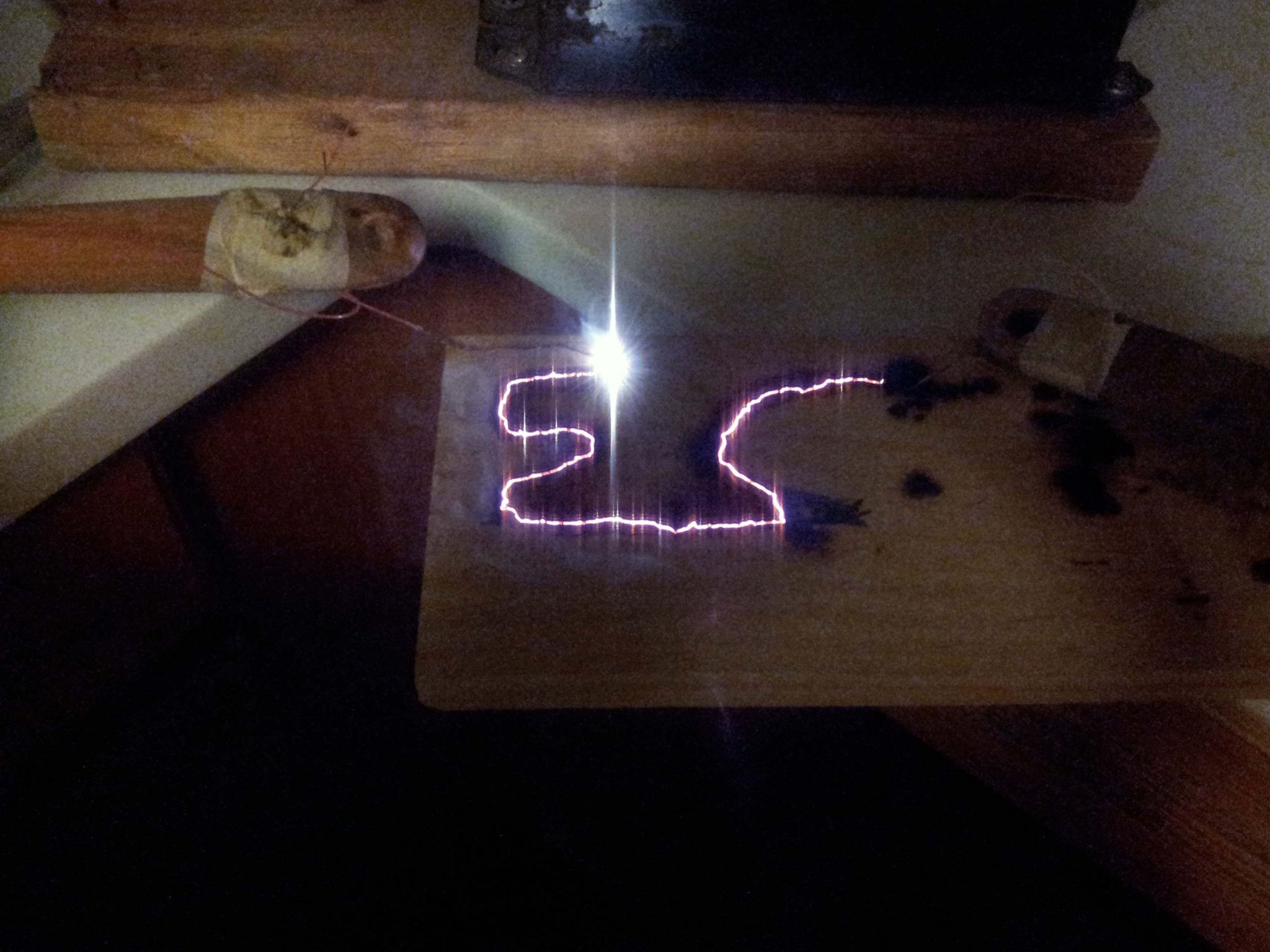Back on Putz, we did some science. It started with left over liquid nitrogen from CryoFAC , and devolved into burning things with a 12 kV neon sign transformer. We found that some interesting things happen when you put twelve thousand volts through damp wood. The electricity slowly burns through the least resistance path in the wood, creating a sort of high-carbon wire that glows bright orange. This effect could be controlled by laying down graphite on the surface of the wood with a pencil. The graphite trace directs the current, which then burns the wood along the trace. Here's what "EC" burned into the wood looks like: