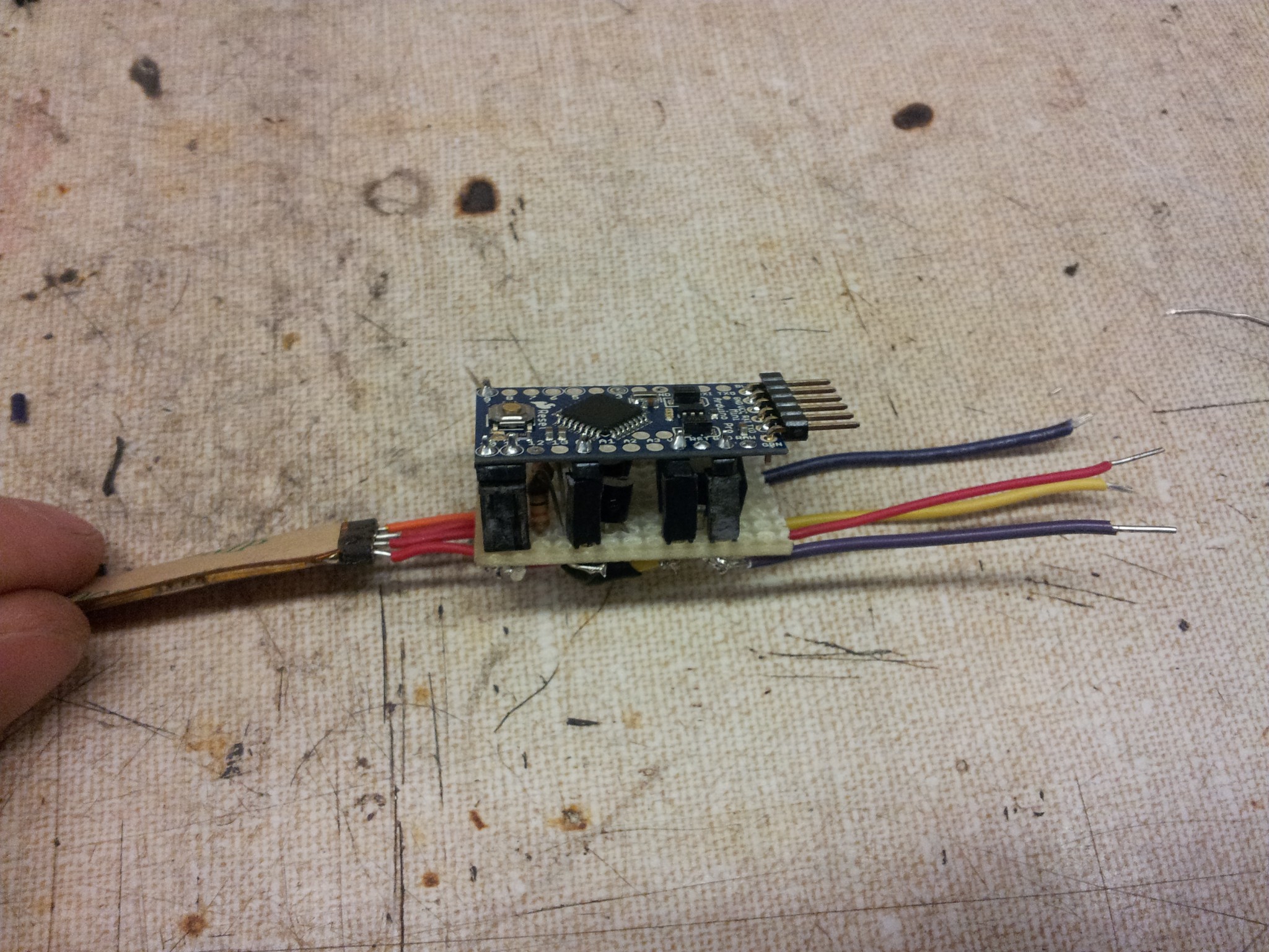 The voltage regulator powers an Arduino pro mini that sits on top of the board. This reads the throttle signal, and converts the throttle position into a color for the LEDs. The LEDs are mapped to the throttle such that the color of the strip shifts through the rainbow as you change the throttle position. To smoothly transition between colors, the Arduino handles an HSV to RGB conversion. The throttle position is just proportional to hue value. The conversion was done with a modified version of this code.