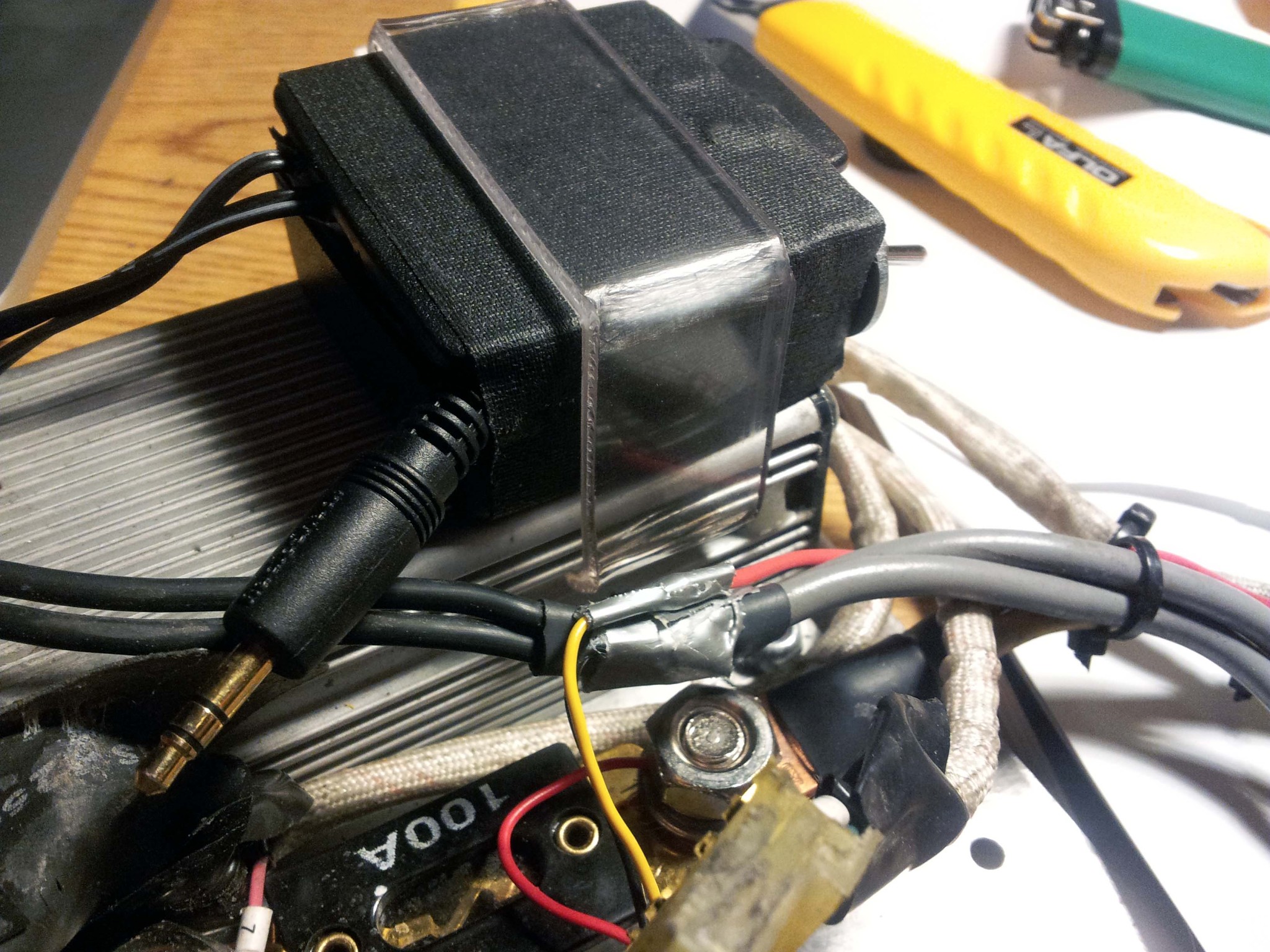 I crammed the Arduino, transistor board, and tiny DC-DC converter into the cut-down plastic casing from a wall wart, and used an audio jack for quick-disconnecting the the power, ground, and signal lines.