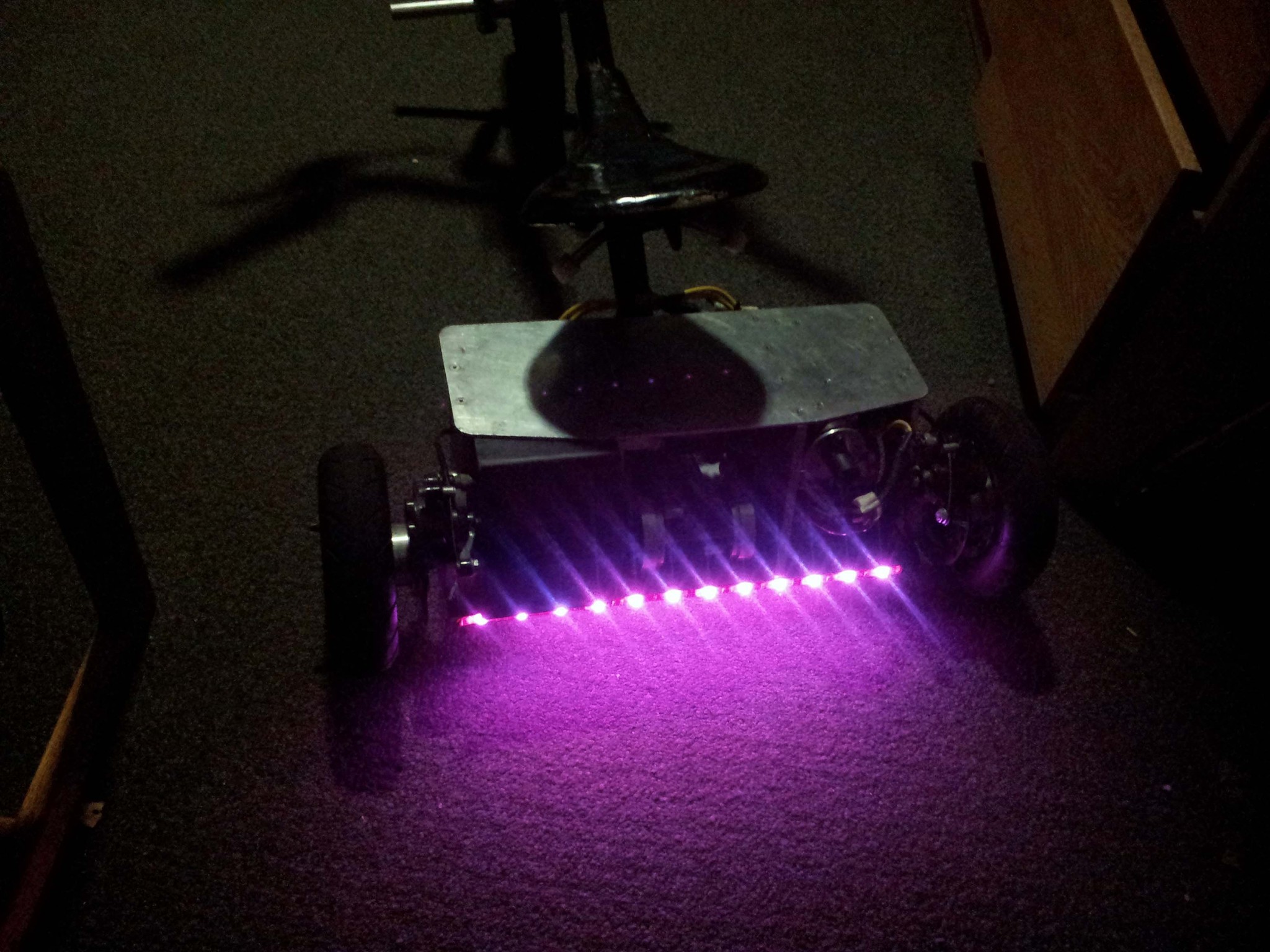 Using a couple feet of RGB LED strips I found in a drawer at MITERS, I made some obnoxiously colorful and bright lights for the tricycle.