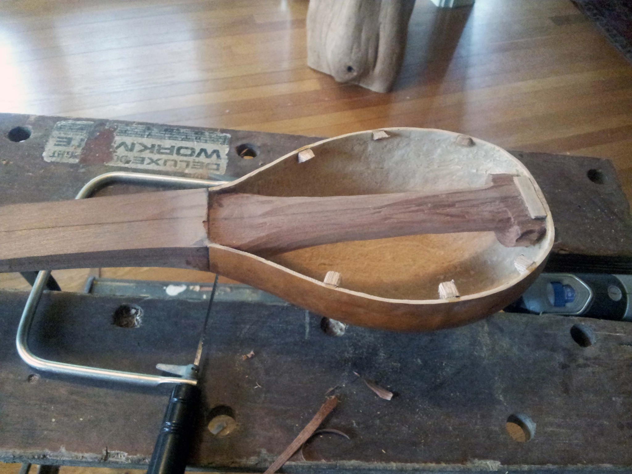 I wanted to get the ukulele to a playable state before I returned to campus, so I bought some violin tuning pegs rather than making my own. I reamed the tapered holes using a combination of drill bits and a pair of scissors with appropriately tapered blades.