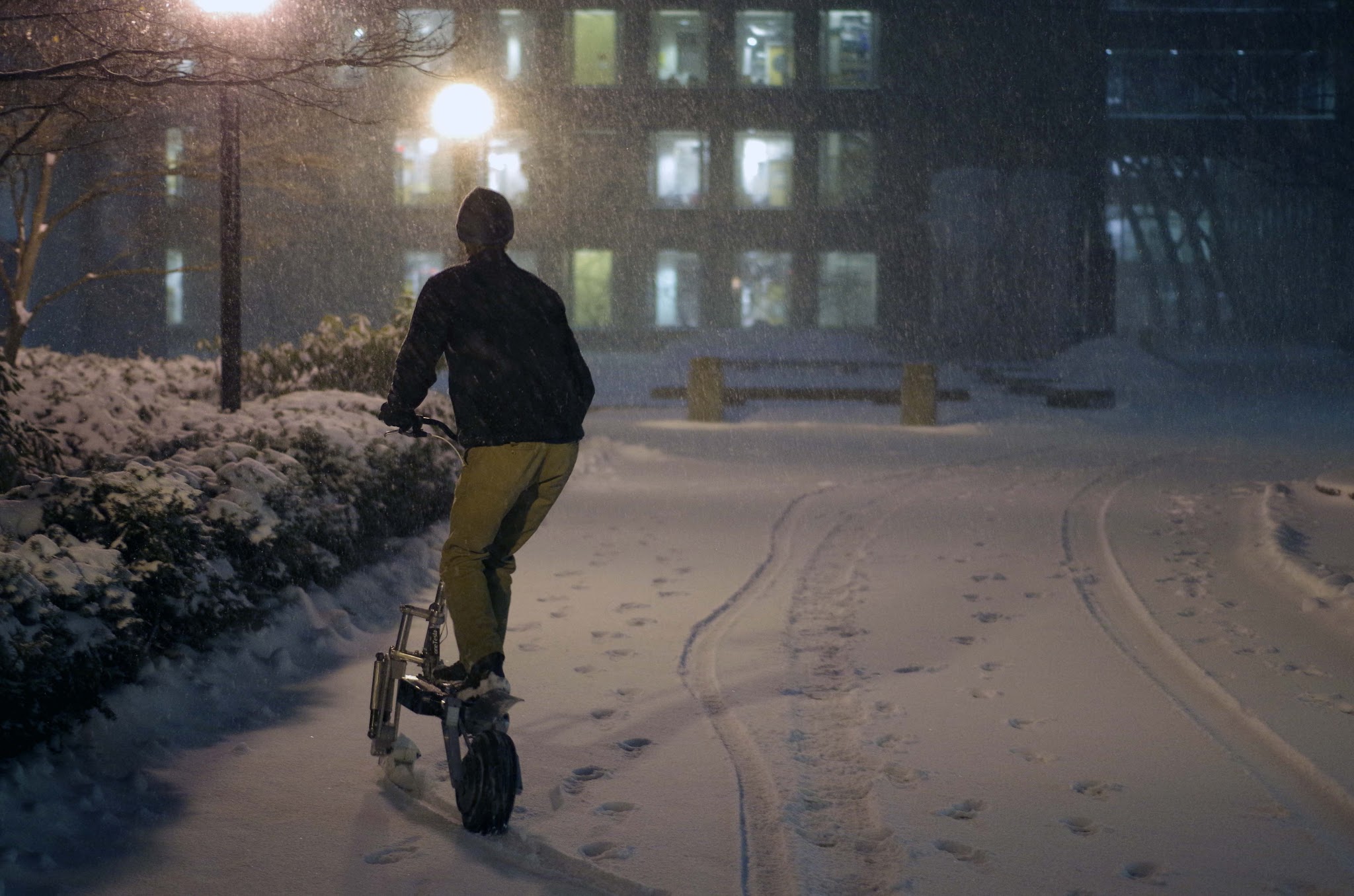 It was definitely a success. Fast turns cause the back wheel to slip out, and at one point I accidentally turned too fast and did a 180 at speed. Fortunately since the ground was covered in snow, it was a pretty soft landing. The brake is pretty much useless, but you can stop quickly shifting your weight forward and going into a sideways slide, like you would on skis.