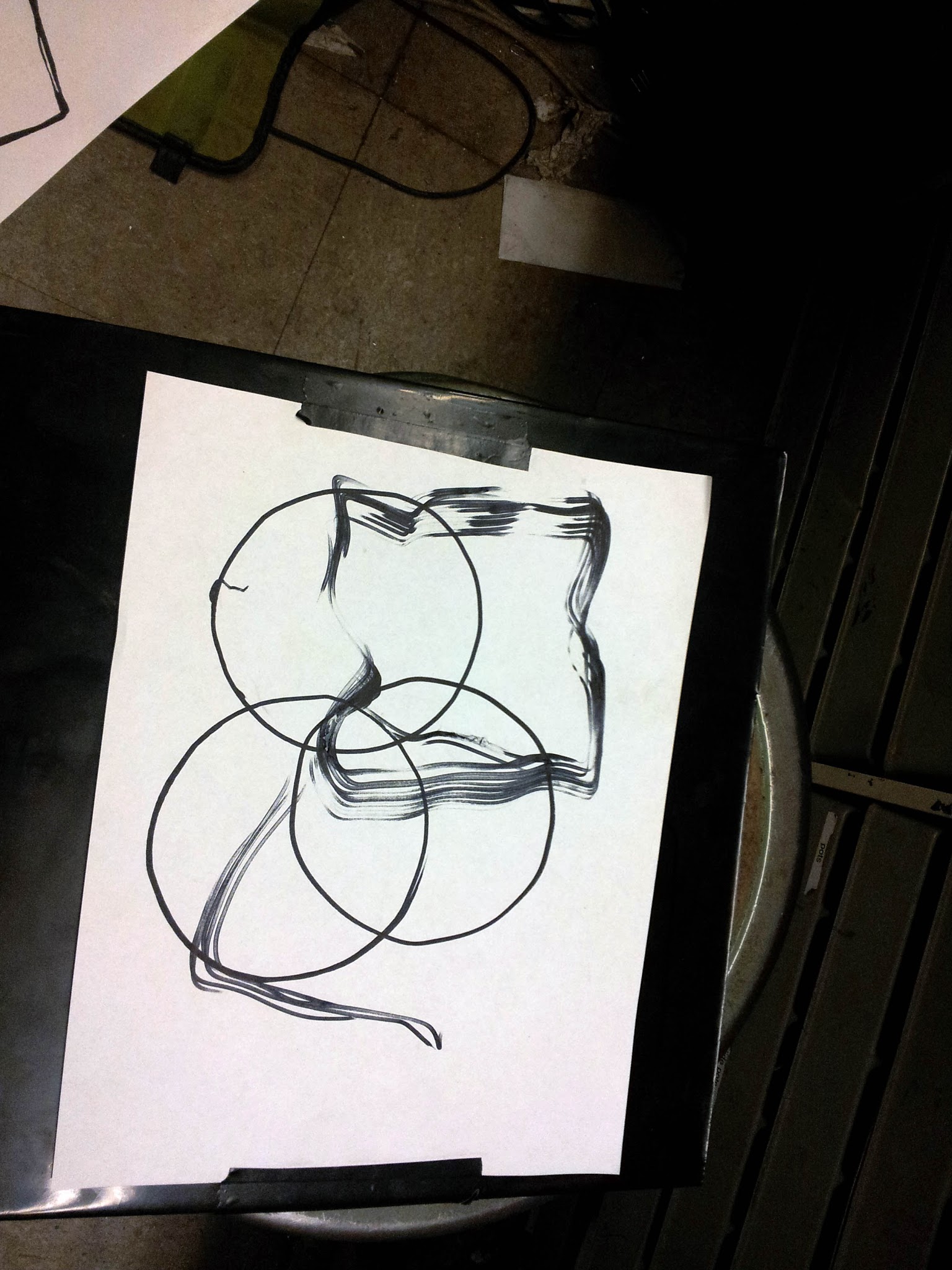 This is what happens when I try to draw 10 cm squares at a few Hz..... the "circles" were also drawn at the same frequency. There are a couple reasons why it looks to terrible. First the robot was shaking the table it was on. Second, the paper was held below the pen by my hands. These two problems were responsible for probably at least 2/3 of the waviness. The remainder was caused (I think) by flexing in the linkage between the second link of the arm and its motor. It might not be reasonable to expect the arm to be able to draw three perfect squares per second, but I can definitely get them a lot better than this.