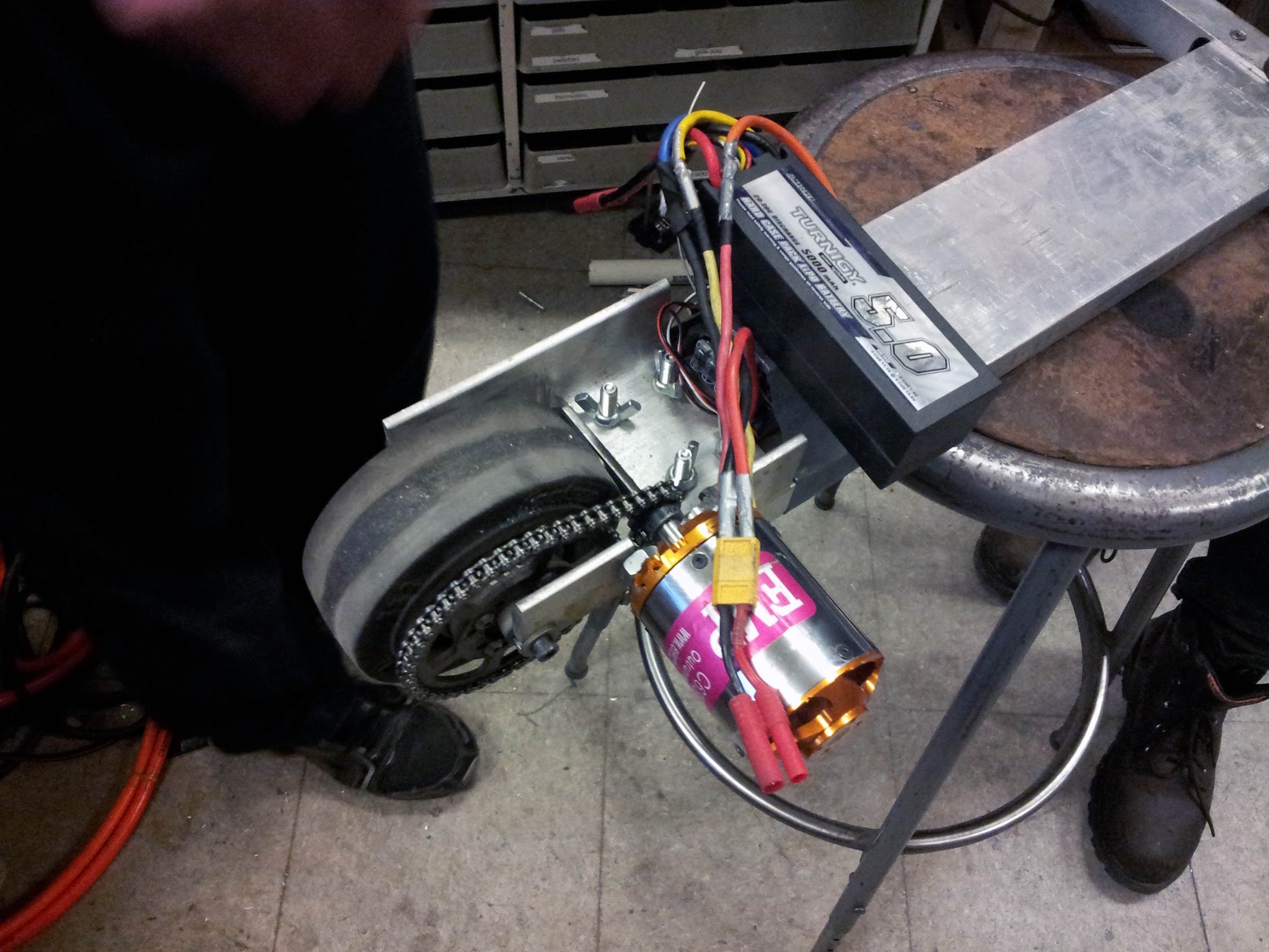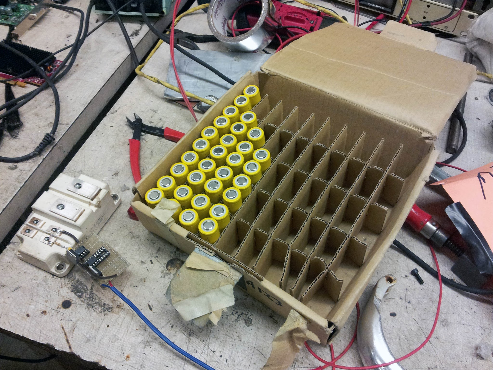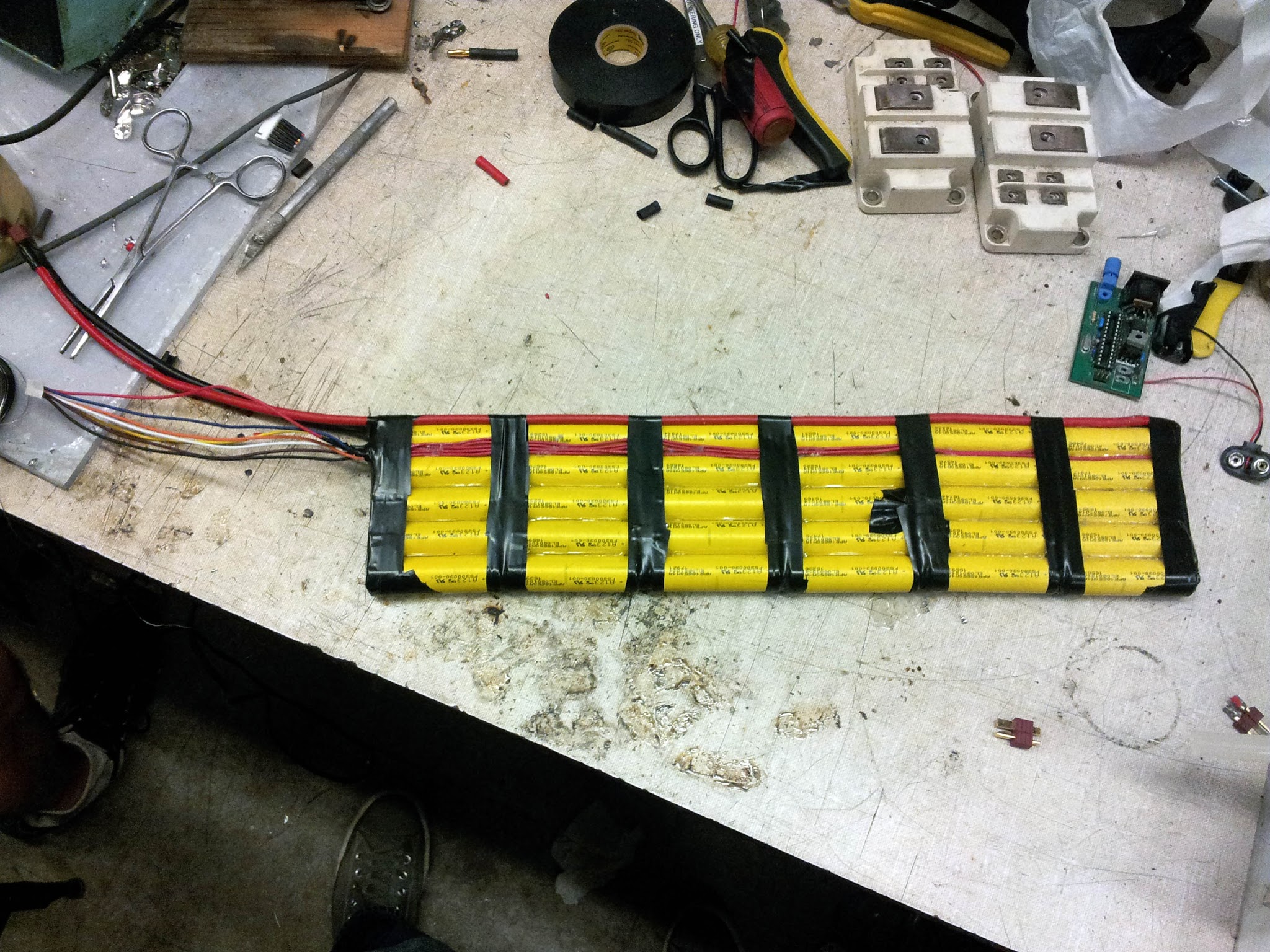 The electrical system was far from ideal, so it was replaced Saturday night and Sunday morning. I worked on assembling the new battery pack, while Mike got the Kelly controller ready and set up one of Charles's hall sensor boards.