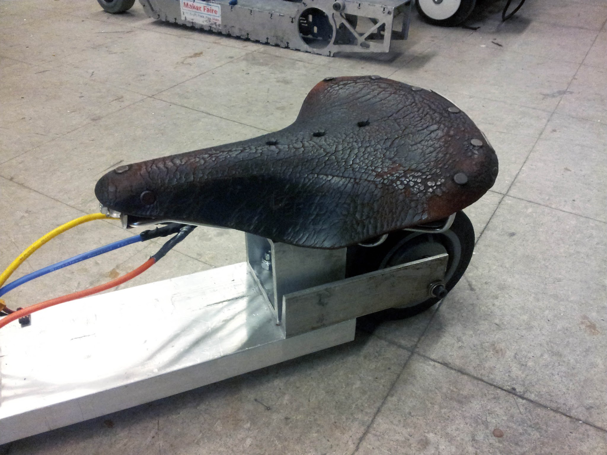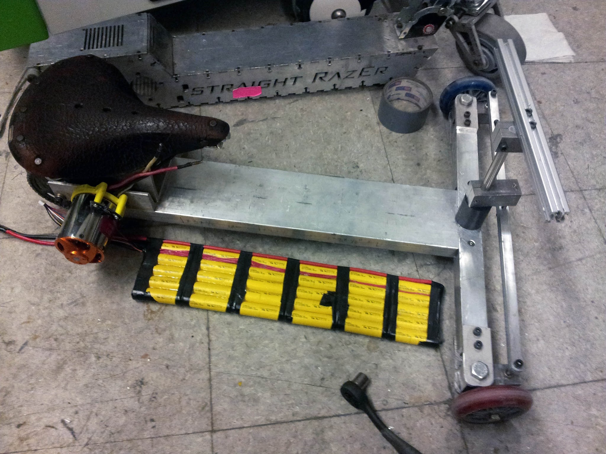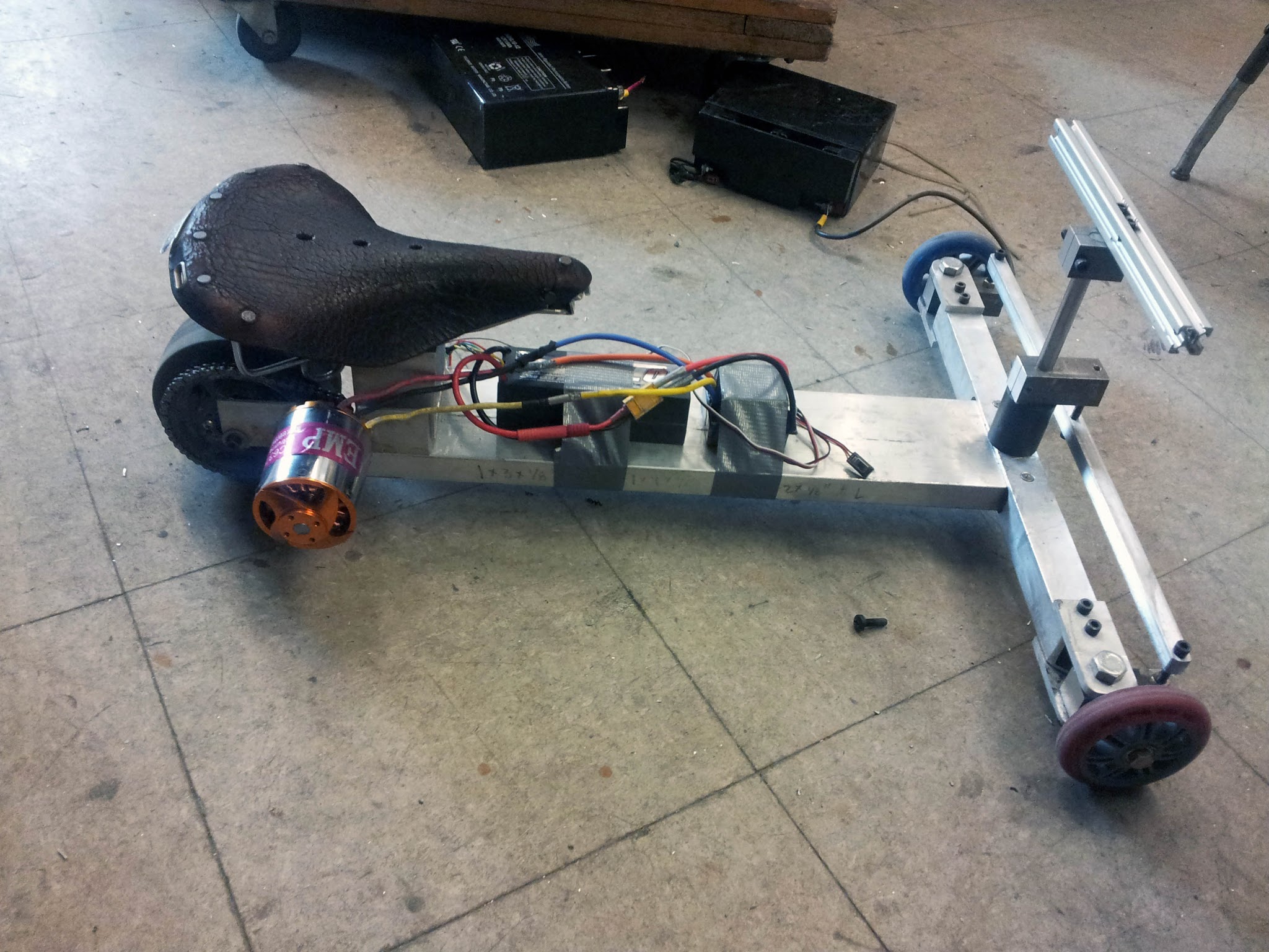 All the parts were scavenged from around MITERS. The motor, controller and saddle were mine, one scooter wheel came from an abandoned kick scooter, one came from Jaguar, the Colson came from the carcass of Straight Razer, and all the metal stock was scrap.