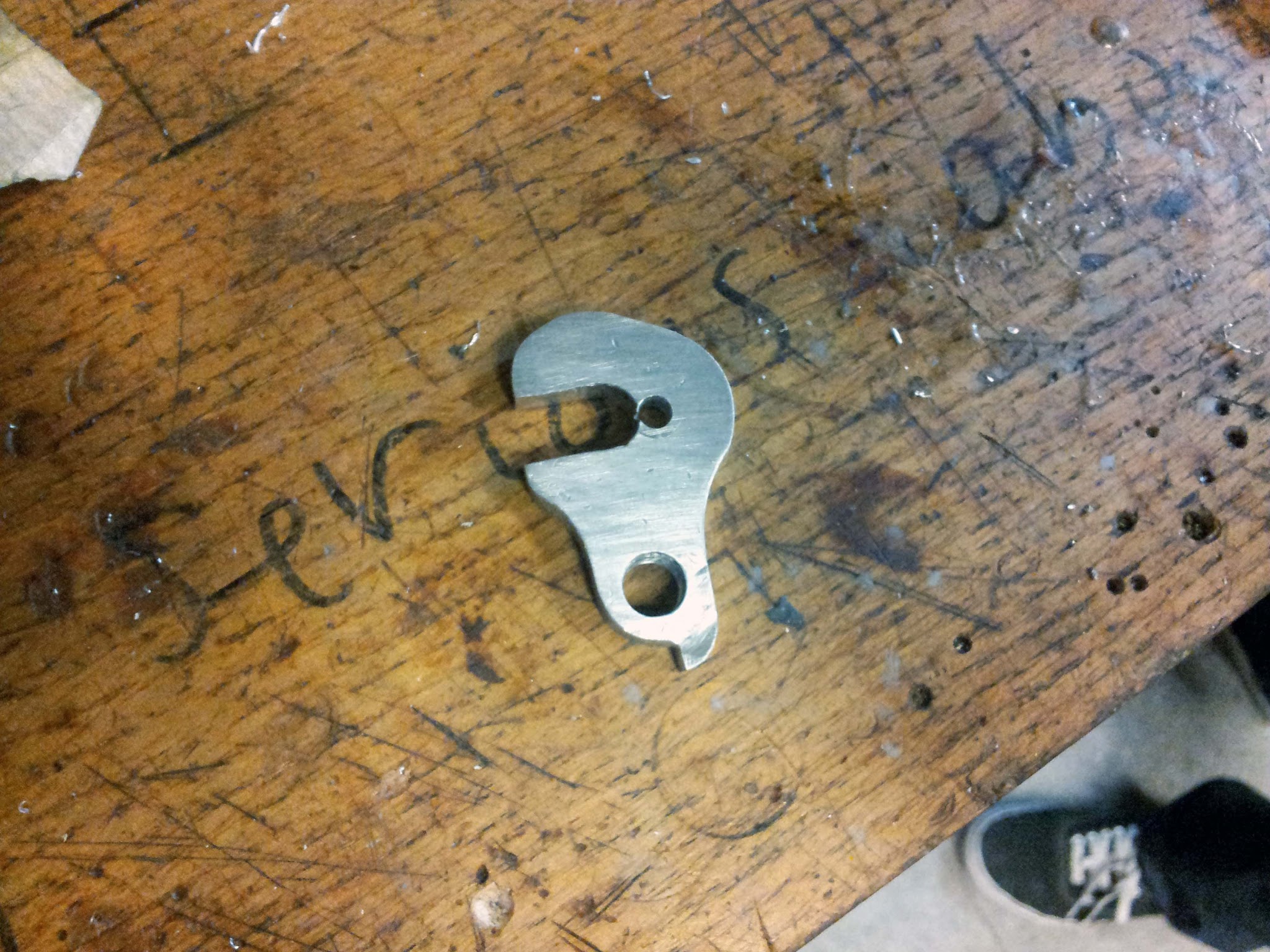 When I milled the dropouts for the original frame, I did not add a derailleur hanger. To attach the derailleur, I machined a clamp-on hanger. This was shaped out of some aluminum bar stock with a bandsaw and some files. Brief aside: I think files are one of the most underrated metalworking tools. Especially on soft metals like aluminum, files can remove material remarkably quickly, but can also make smooth, elegant edges. Bandsaw and filing this part took way less time than CAD and CNC milling this thing, which would be an alternative for making such a weirdly shaped object. Granted, precision was of little importance here.