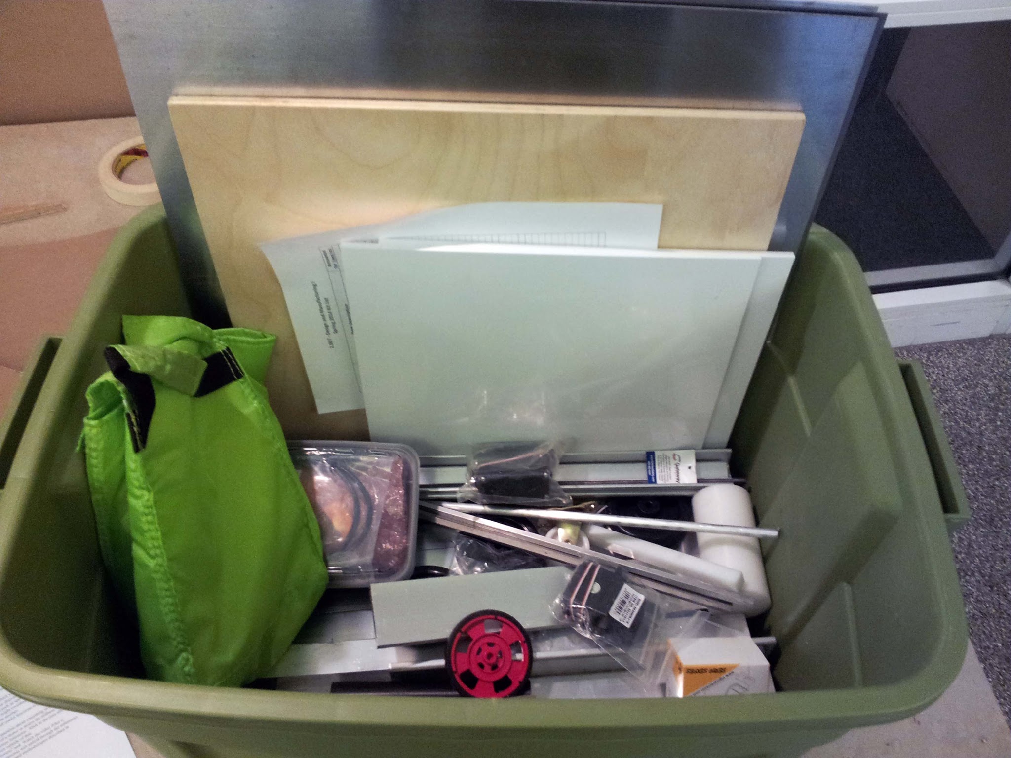 It includes a few thicknesses of steel and aluminum sheet metal, a plywood sheet, some ABS sheet, a few servos, a few gearmotors, square and rectangular aluminum tube extrusions, hex shafts, some chunks of delrin and nylon, and an assortment of other goodies. Although we generally were required to stick to these materials, they did allow some substitutions (such as acrylic for the ABS, for ease of laser cutting), and additions. I managed to incorporate some nice machined chunks of aluminum into my parts without anyone caring.