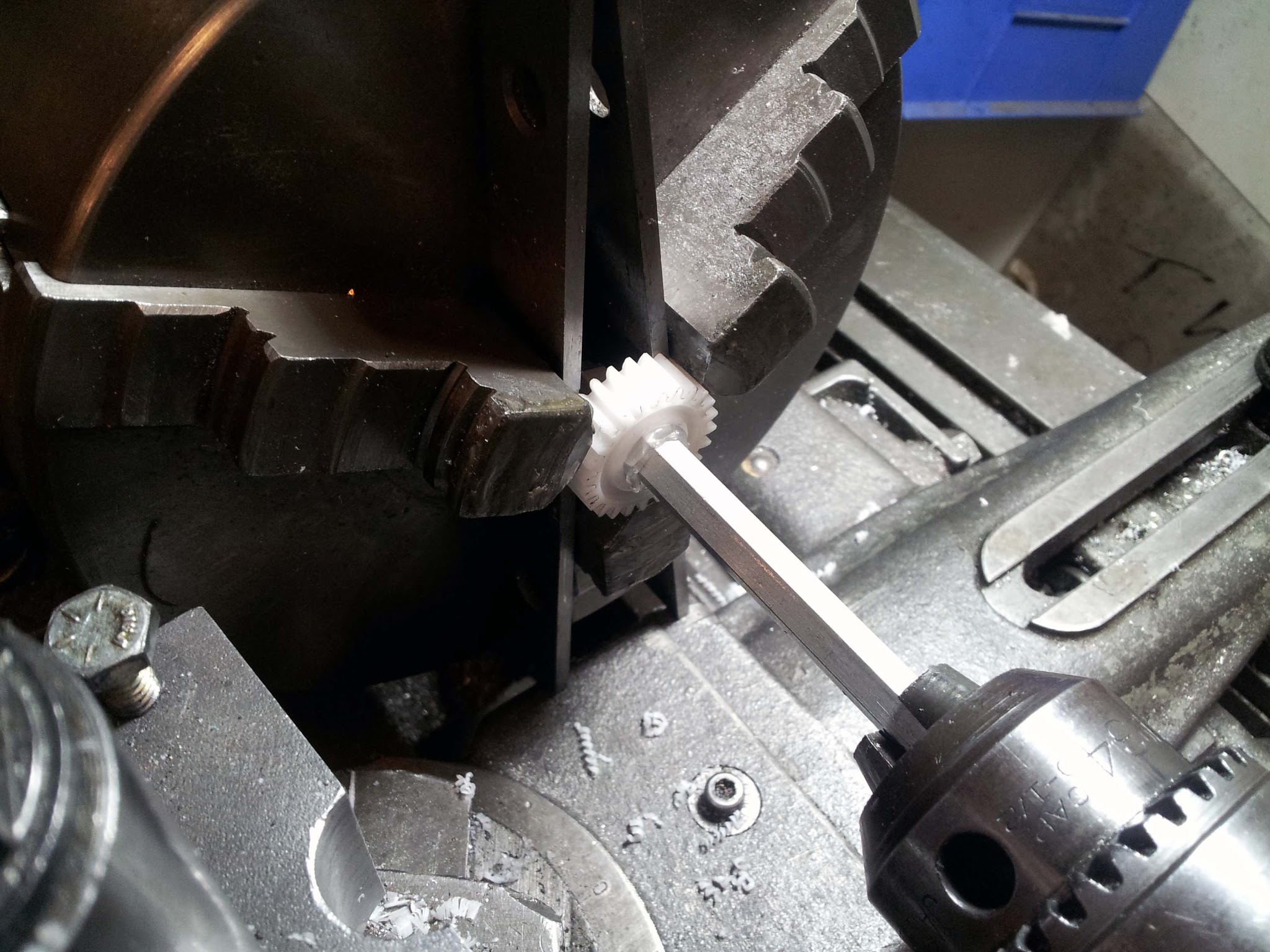 In actually building this thing I took a few tricks from AndyMark (who also make gearboxes combining mis-matched motors). Namely, torque is transmitted through hex shafts everywhere. To make hex bores in all the gears I could have used the fancy broach in MIT's Pappalardo Lab, but they are only open during "real person hours" (7:30 pm to 5:00 pm, or something like that), so as usual I opted to build everything at MITERS. So my method for making for making the hex bores was infinitely sketchier than using a broach. I first chucked the nylon gears into the lathe, and chucked a piece of aluminum hex shaft into the tailstock. Then I whipped out a propane torch: