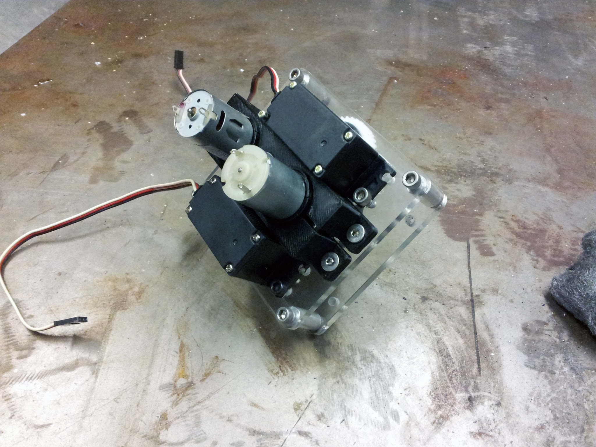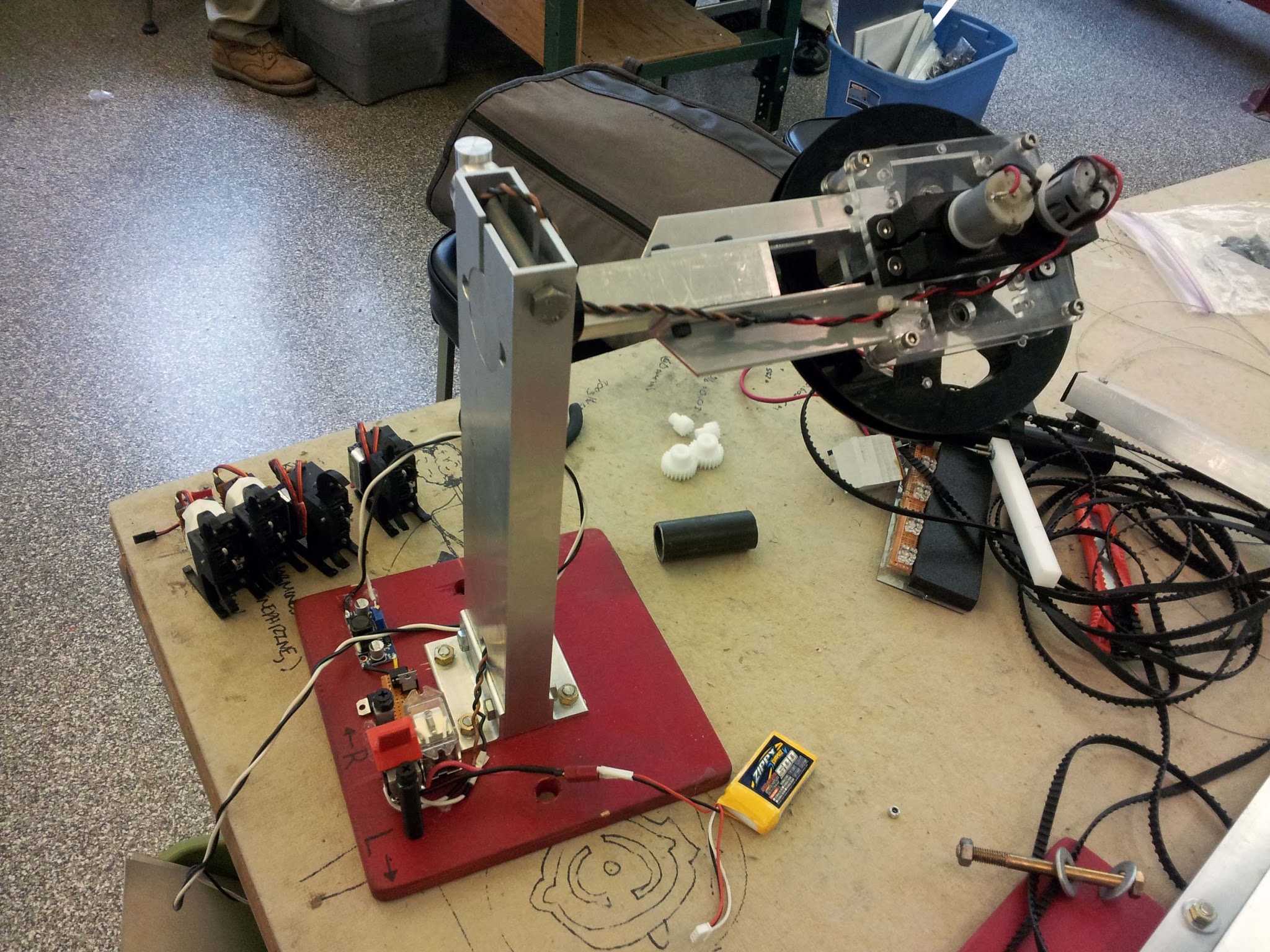 In terms of electronics, you could do pretty much whatever you wanted. The class provided you with an arduino nano and a carrier board to go with it, and a little 500 mAh 2S LiPo battery, but you could bring in other electronics if you wanted to. However, total energy stored by your system (be it in the form of batteries or mechanical energy storage) was limited to 30 kJ.