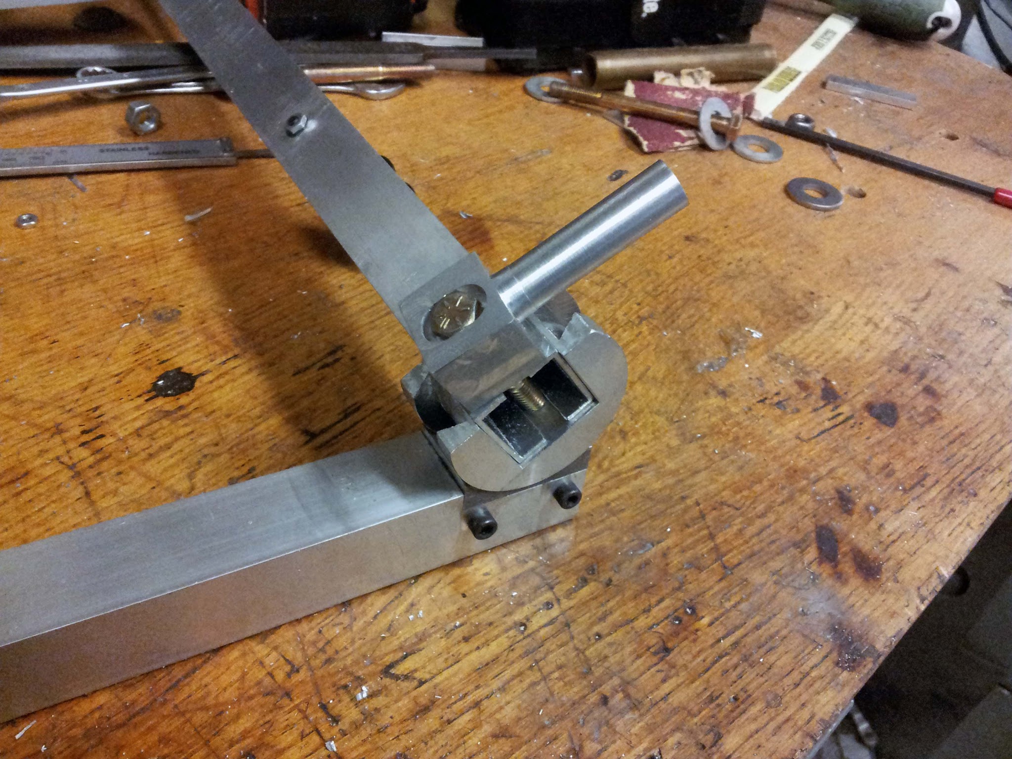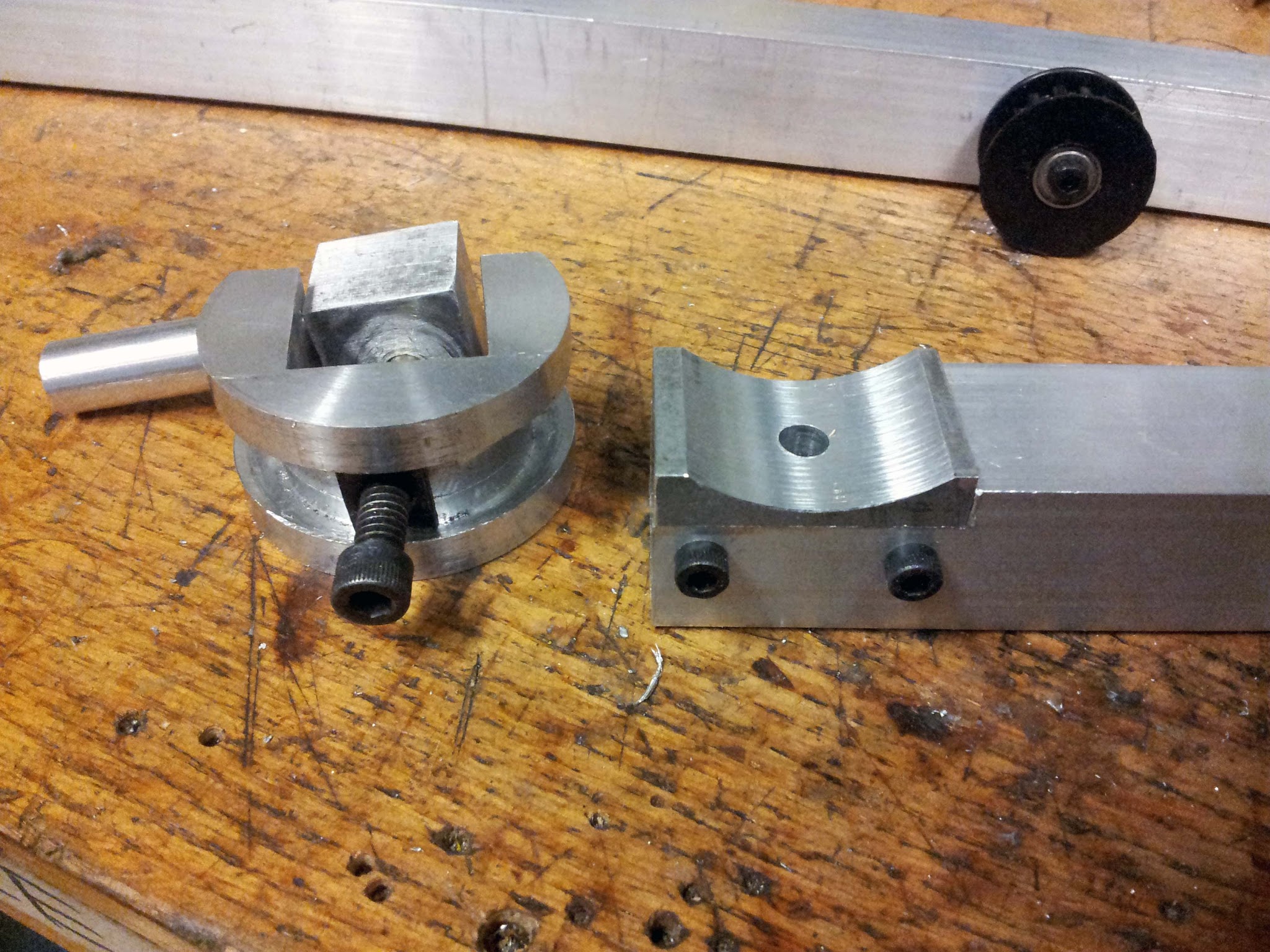 This piece fits into the clamping mechanism. It holds a 1" square piece of aluminum tubing, with a threaded rod through the center.