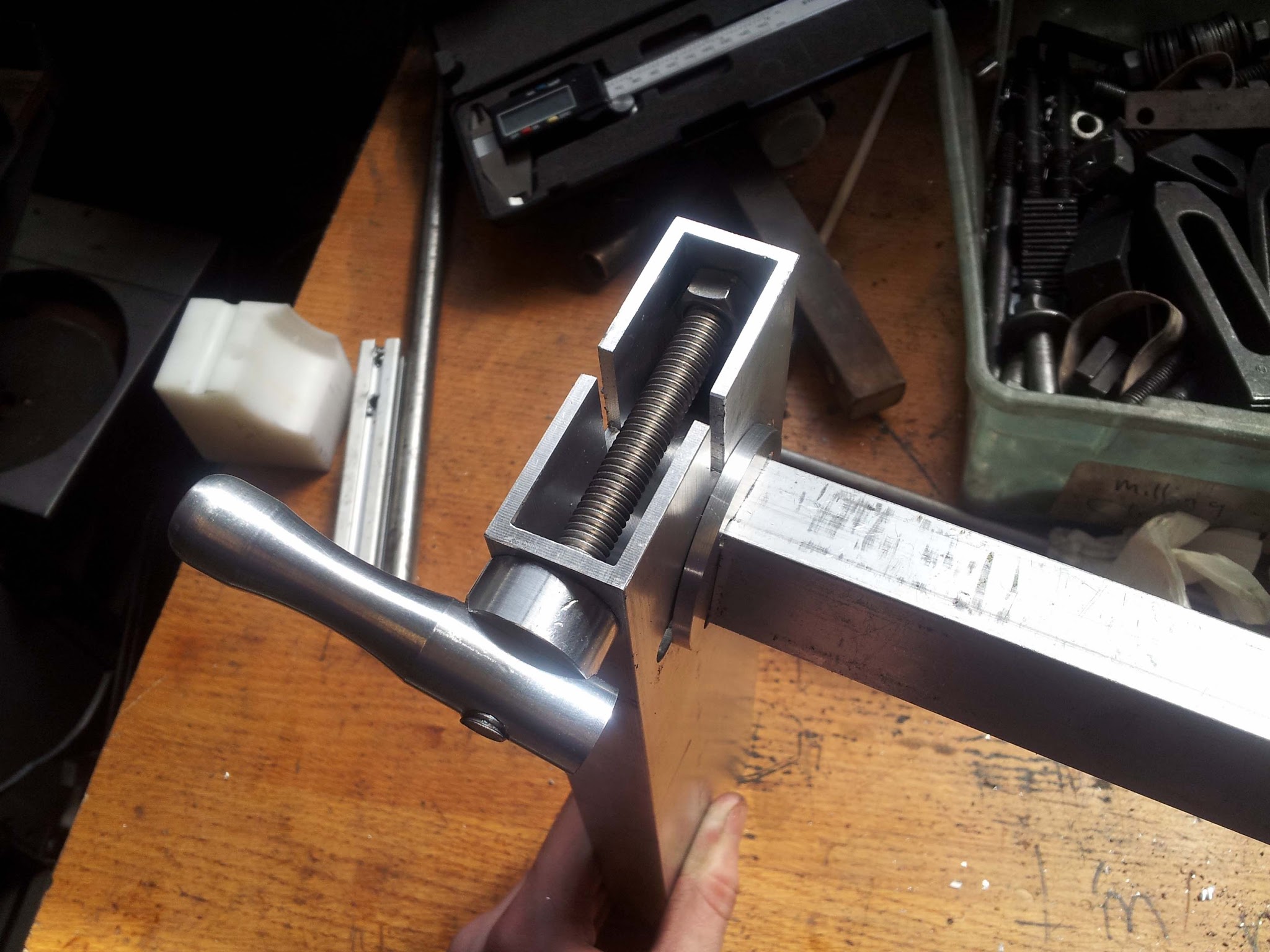 The top half of the lift got even more ridiculous. The lift's supporting tower was made from a foot of 3"x1" hollow aluminum extrusion. I made a big clamping mechanism through the top of it. I got into a shiny knob making phase for this and a few other random projects, so I made another shiny handle to adjust the clamp.