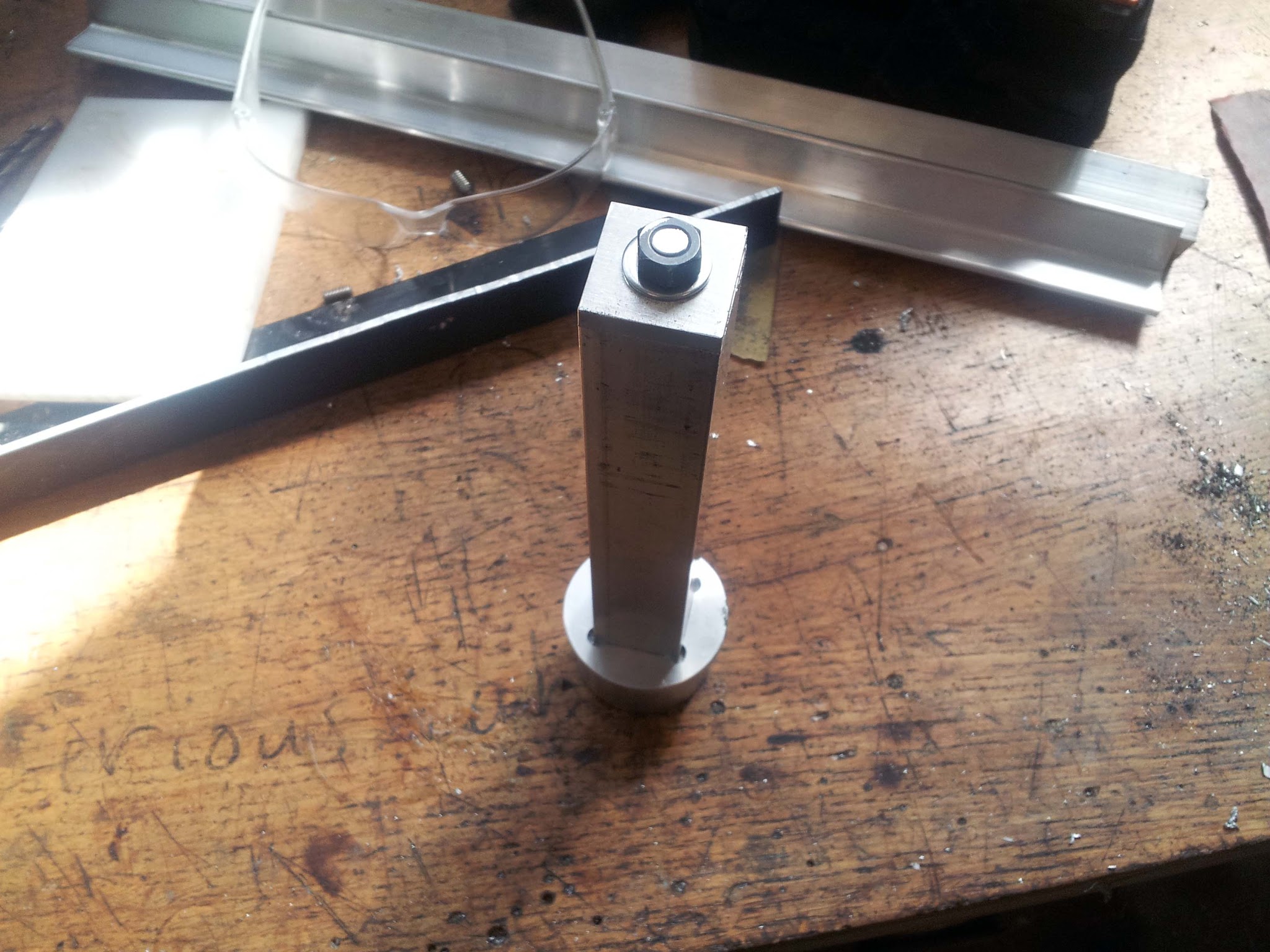 The assembled tube-and-threaded-rod part. The nut on top is cranked down into the square cap I machined for the tube, clamping the tube into the cylindrical base.