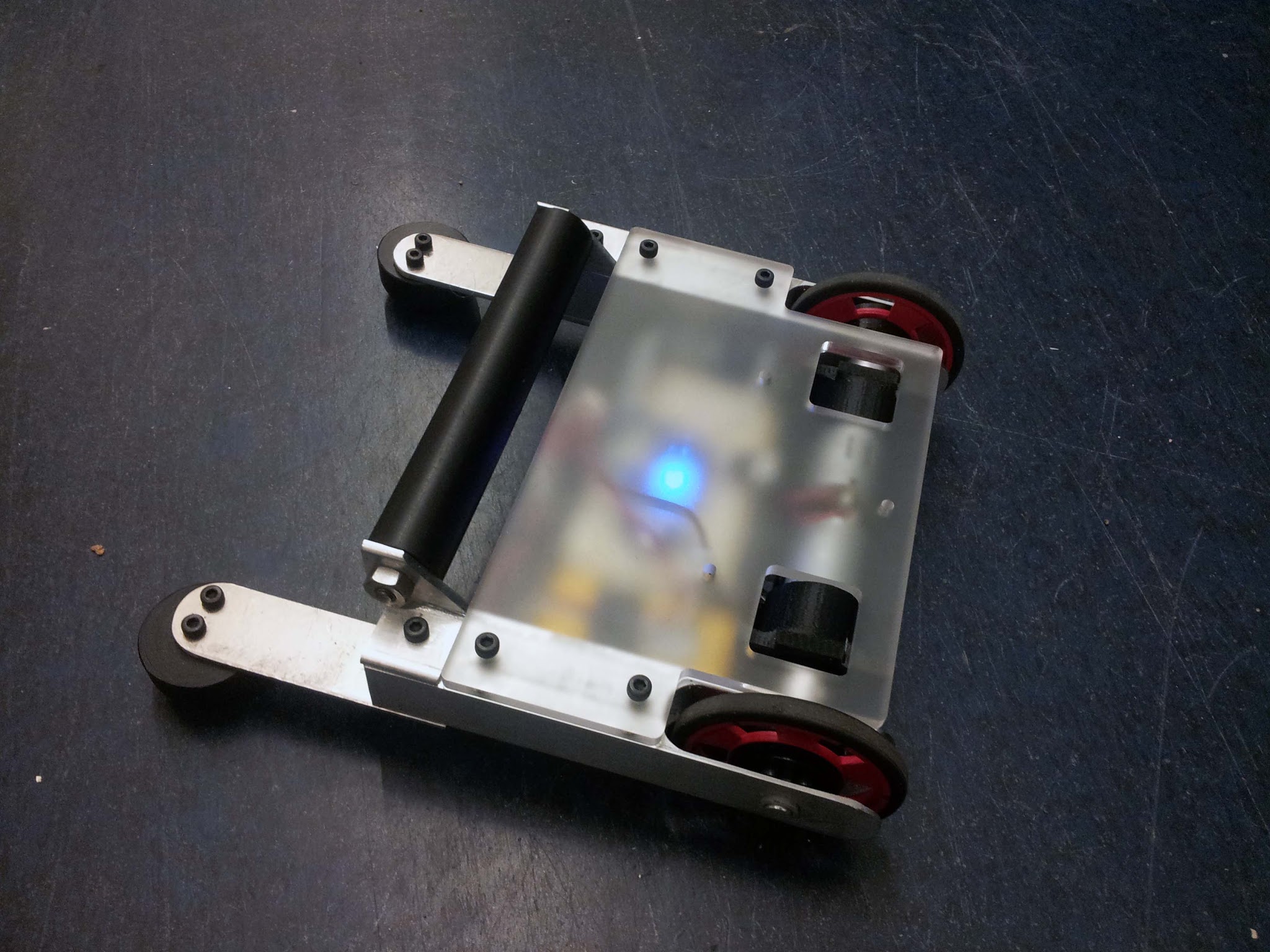 Wheel assemblies. The servo wheels are bolted to laser cut hex-bored hubs, and have aluminum hex axles which pass through nylon bushings in the aluminum frame.