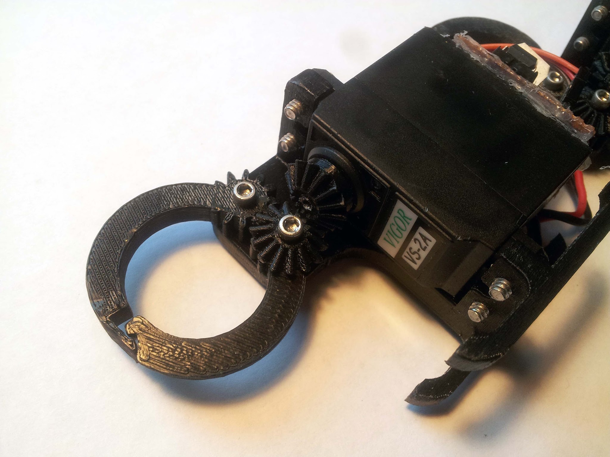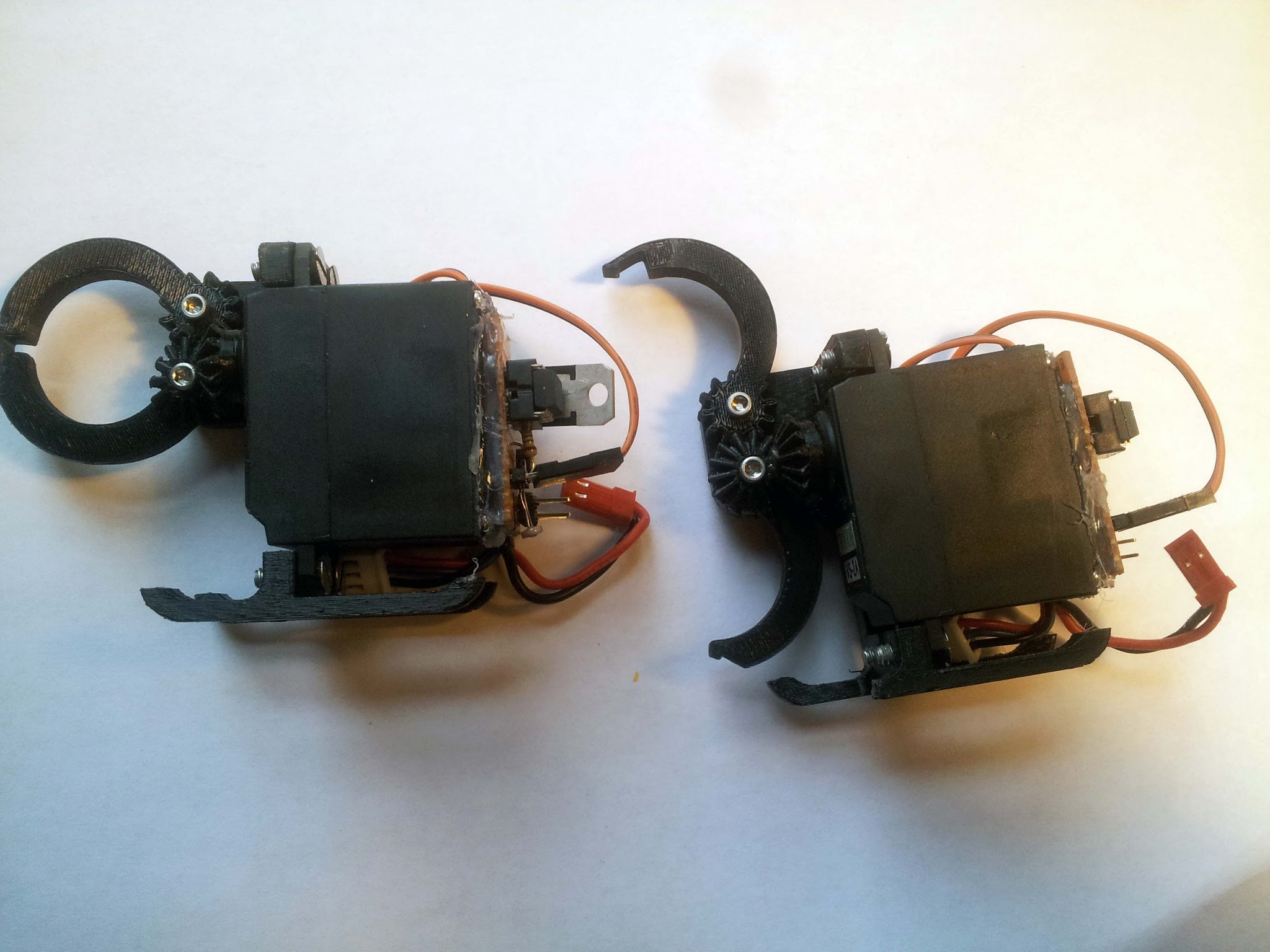 To make them compact, there's a right-angle bevel gear drive between the servo and gripper. Also each of the grippers has a little latch at the end, to help prevent them from opening up accidentally during the competition.