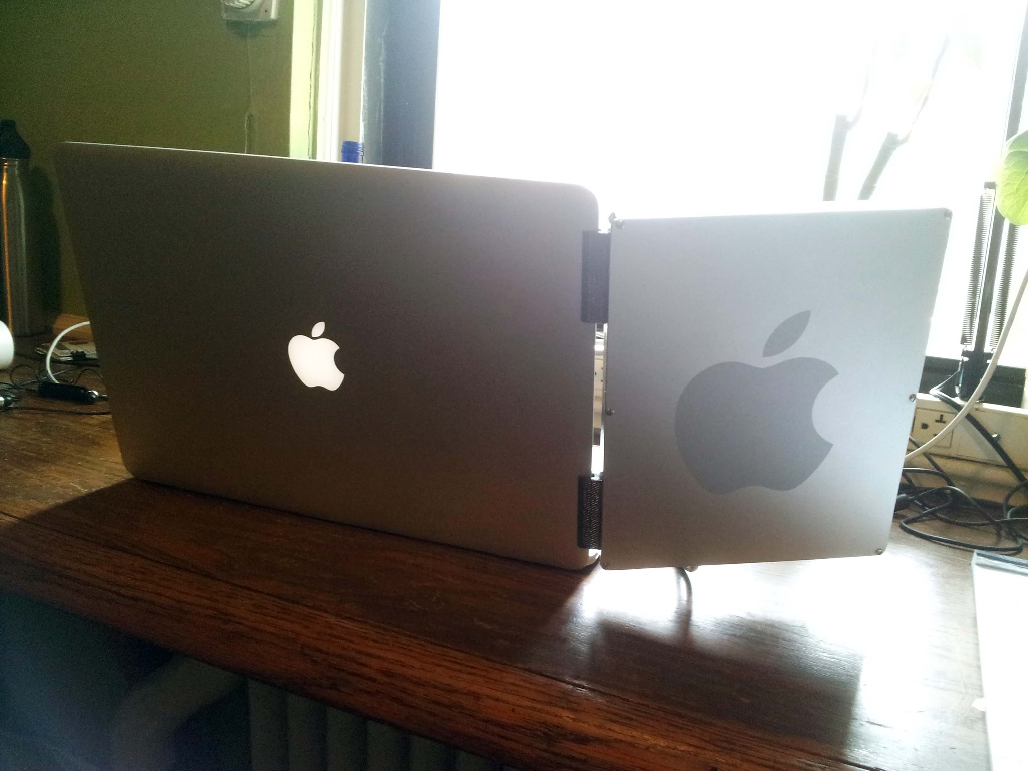 Two summers ago I bought an iPad 3 LCD off ebay. These are 9.7" 2048 x 1536 IPS panels, which use an internal DisplayPort interface. In May, I finally got around to building an external display out of the panel, which can be clipped directly onto the side of my Macbook Pro's screen, and is powered by a USB port.