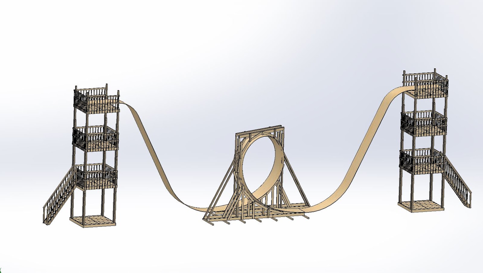 Having two towers would have been great, because it would have solved the problem of needing to get the cart back around the loop after each run. In retrospect, there's probably no way we would have actually been able to build this design in a week.