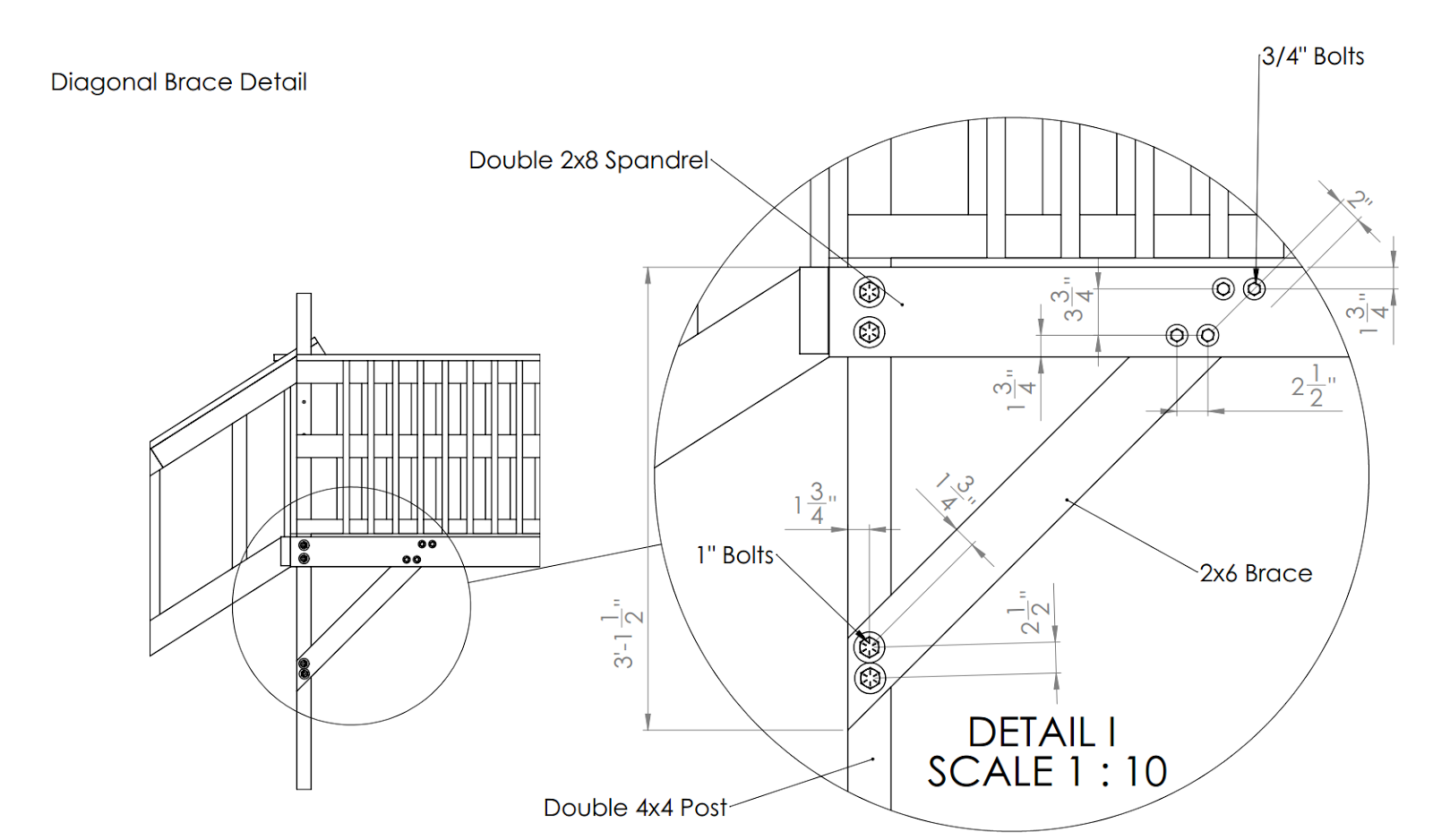 The diagonal braces on the tower also had to be significantly beefed-up. In the past, these have consisted of sketchily screwed in chunks of 2x4. Now, they had to have 2 1" bolts at the post, and 4(!) 3/4" bolts at the spandrel. Seriously, why don't we just build this out of solid steel next year?