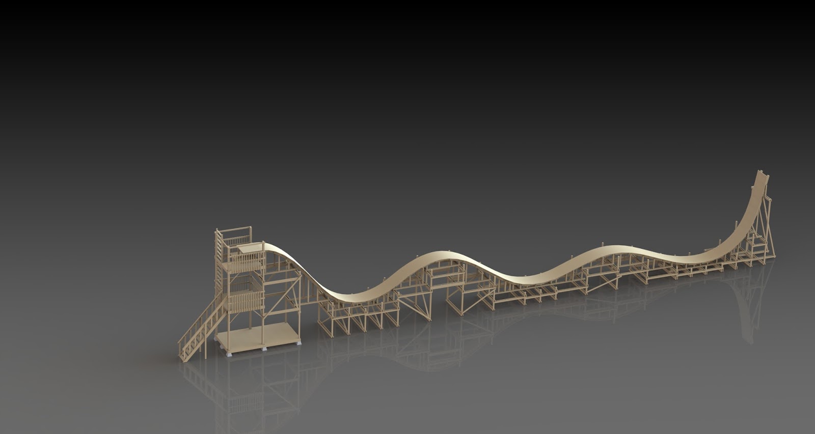 As you can see from the above rendering, the roller coaster's frame also had built-in work platforms, so the track could be assembled without ladders or scaffolding. In the final construction these platforms had railings which were not shown in the rendering.