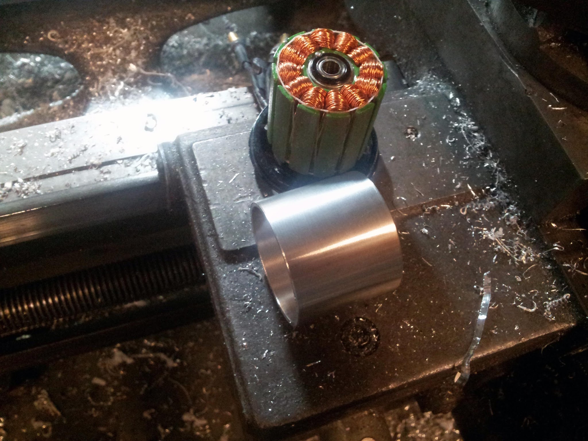Because why not. A few months ago, Jamison brought a pile of small brushless motor stators down to MITERS. I decided last night I should turn one of them into a tiny induction outrunner. Basically, I replaced the permanent magnet rotor with an aluminum can shoved inside a steel can. It's as simple as an induction motor can get; it doesn't even have a squirrel cage rotor. Although a rudimentary squirrel cage could be easily made by milling slots in the aluminum can.