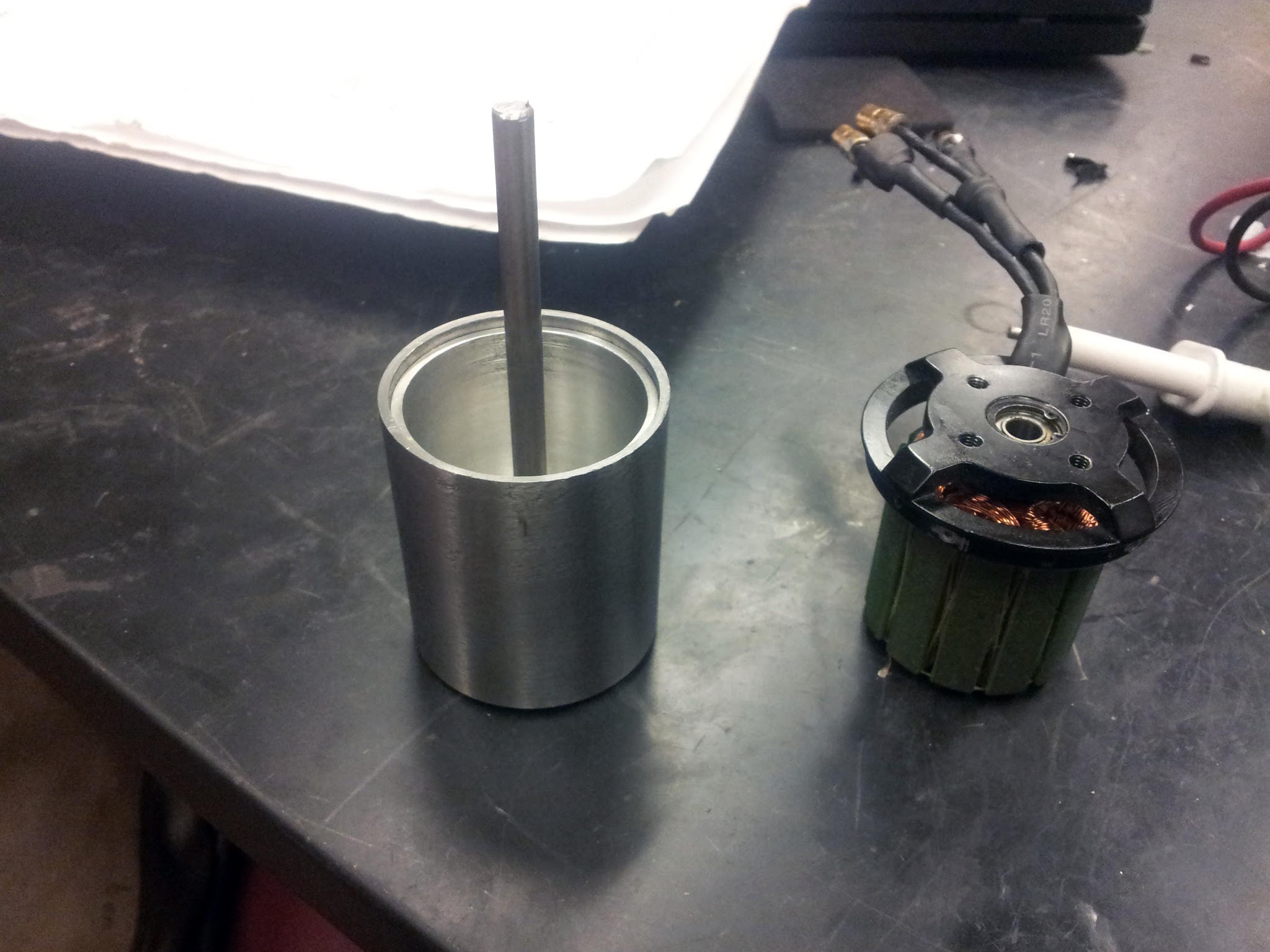 I turned a steel can, which the aluminum can is press fit into. An aluminum end cap was attached to a steel shaft with a set screw, and was then also pressed into the steel can. The rotor's shaft is made from fairly soft steel, and the motor has no can bearings, so any real load on the can will make the rotor rub the stator. Definitely not made for anything other than testing purposes.