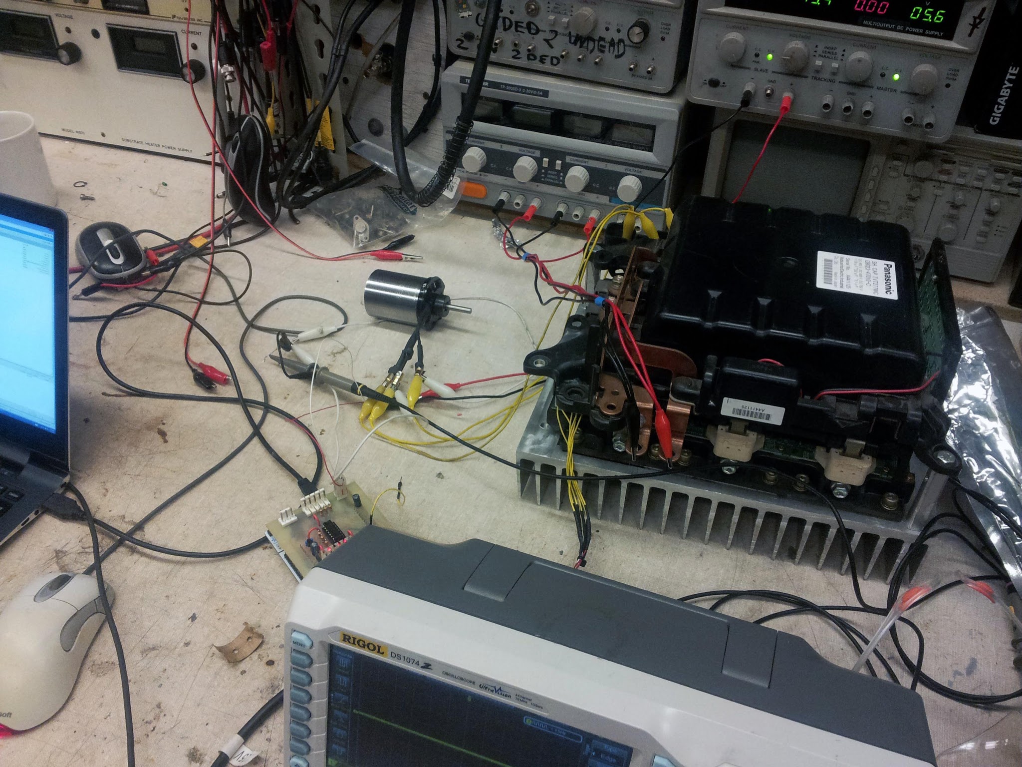 To drive the motor, Bayley and I hooked it up to this monstrosity, with some of his own sine-wave drive code. I think the motor controller to motor ratio is a little off here: