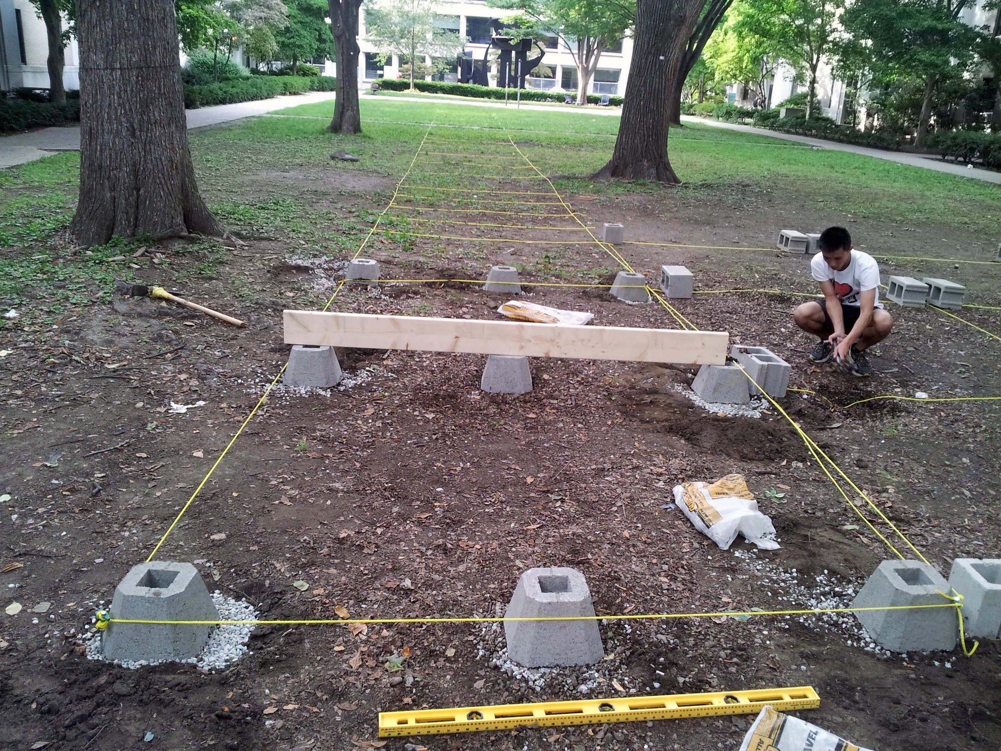 The night before the first load of Home Depot wood arrived, we marked out the foundation of the roller coaster in cheap yellow rope and tent stakes. The next day, we dug small pits for each of the concrete footers and filled them with gravel. We then leveled all the blocks and started assembling the base platform: