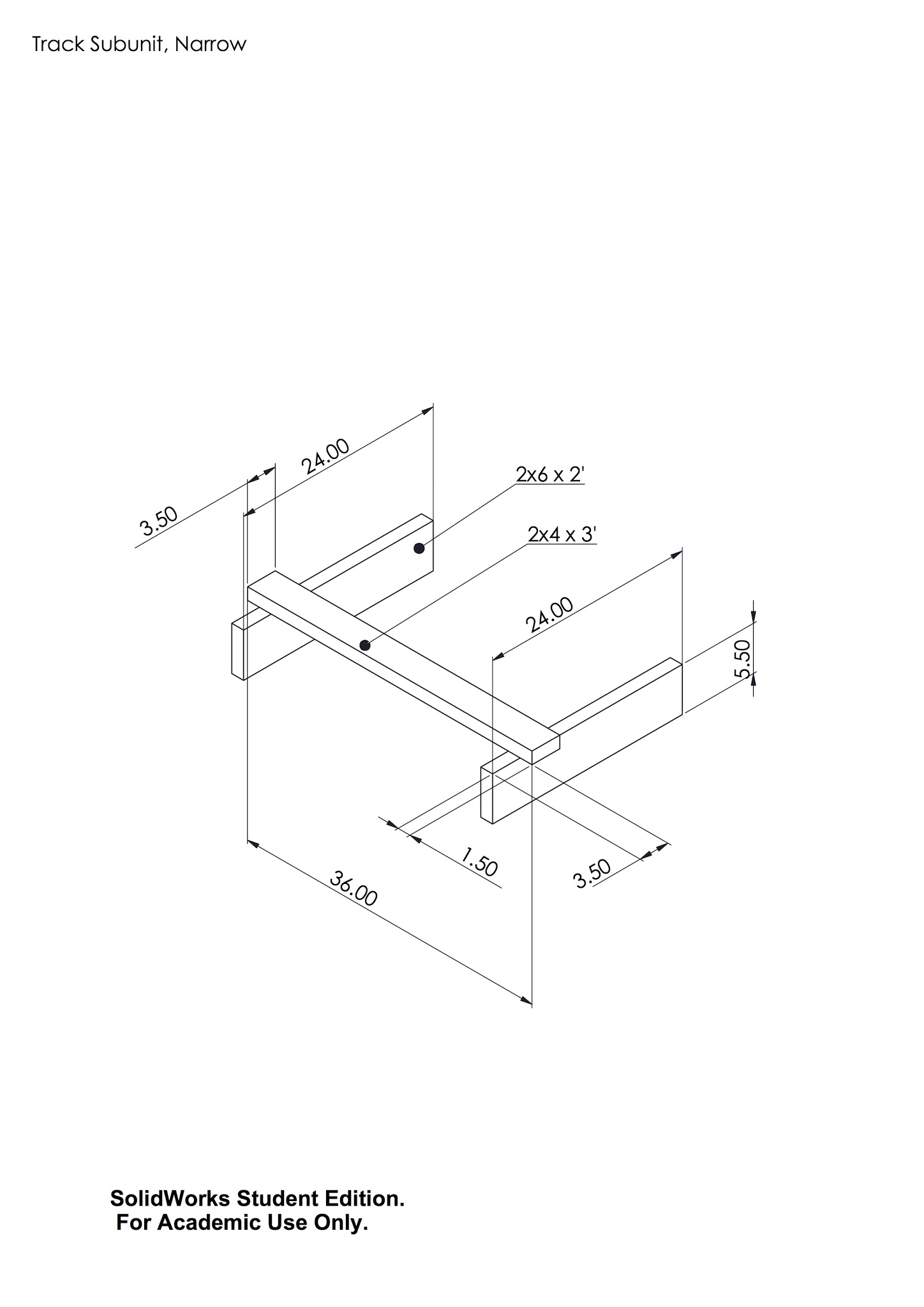 The frame directly beneath the track was made from two types of assembly which alternated and fit together kind of like a roller chain (wide link, narrow link, wide link, etc). We built jigs for both the cutting of the 2x6s and 2x4s as well as assembly jigs, since many of each were needed. Then the job was handed off to a crew of enthusiastic freshman who had never really used power tools before.
