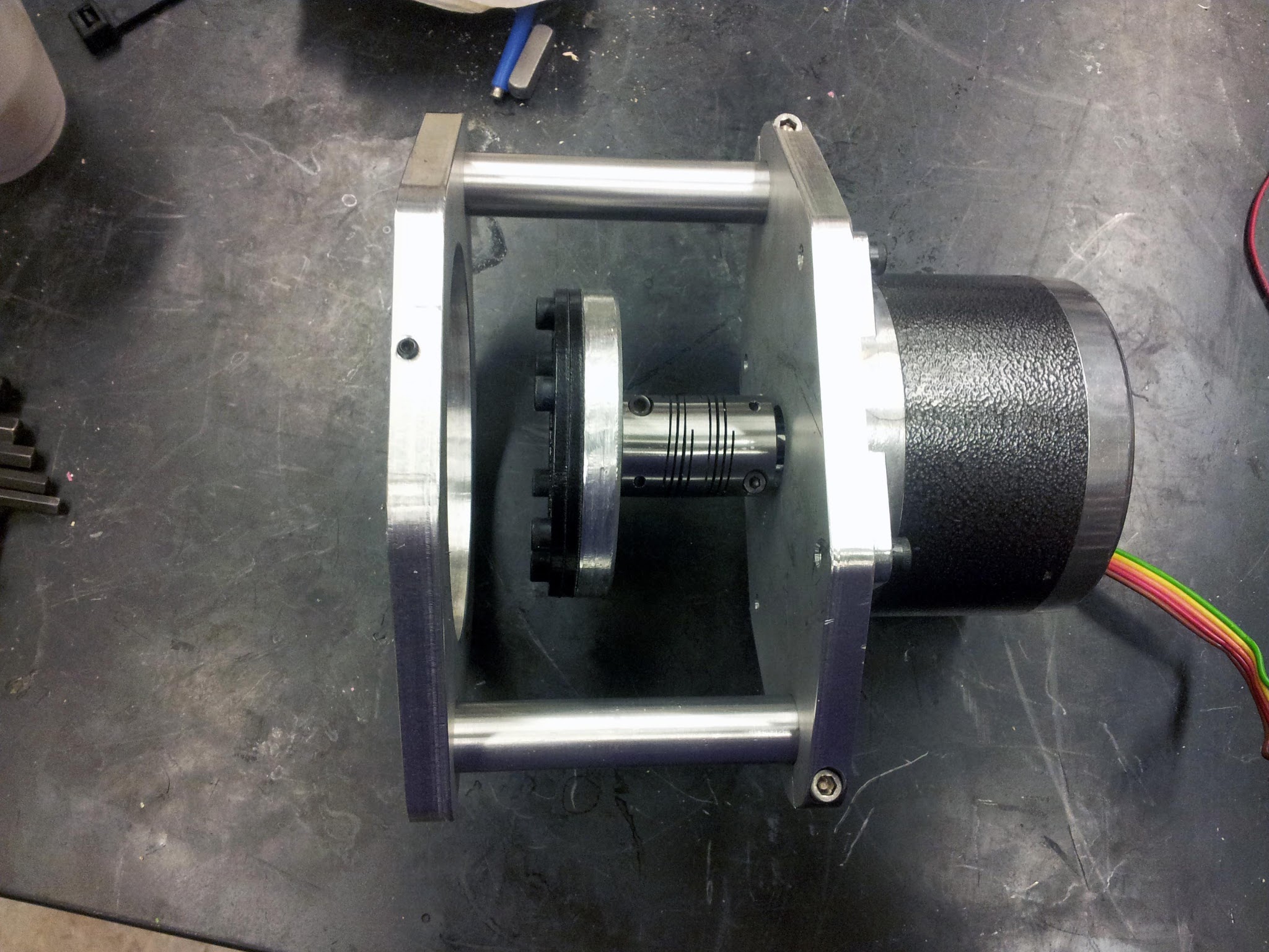 Two aluminum rods are press-fit into the front plate. A set screw in the front can be tightened into the ring around the lock's dial, to prevent anything from rotating. The spacing of the motor can be adjusted using the two clamps around the shafts on the motor plate.