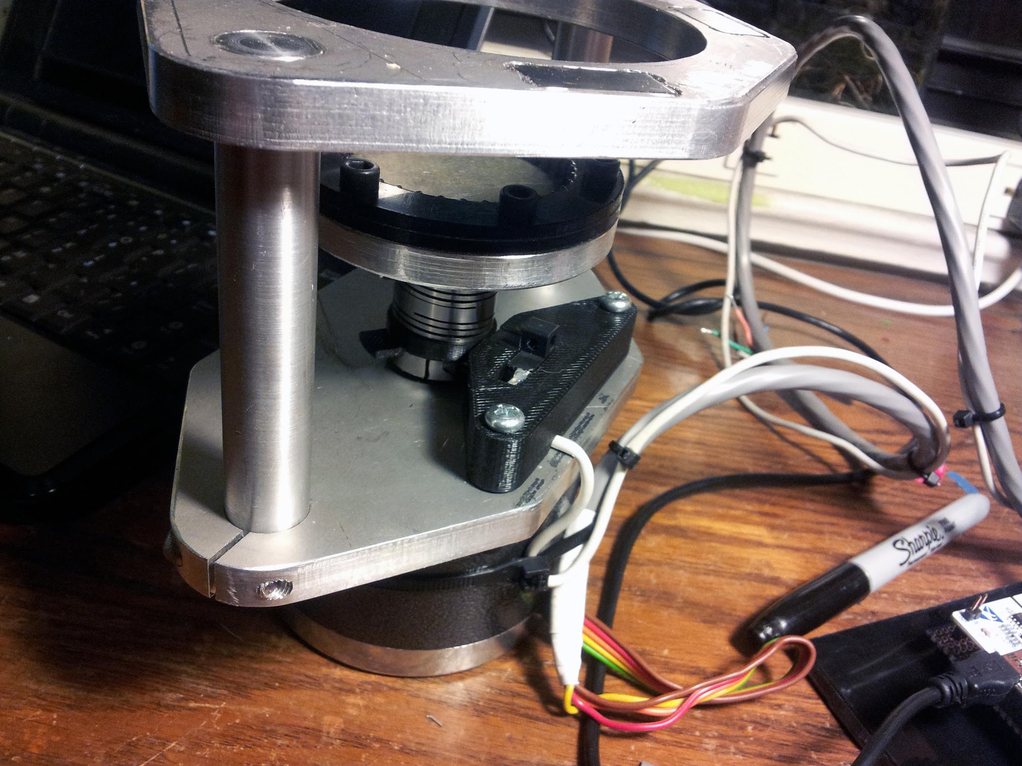 - It's very loud. This is caused by the half stepping limitation of the stepper driver used, and lack of mechanical isolation between the motor and frame. I fixed the latter by adding some squishy rubber between the motor and it's aluminum plate, and securing it with Structural Zip Ties rather than steel screws. Stepping noise was reduced by switching to a fancier stepper driver with 32x microstepping.