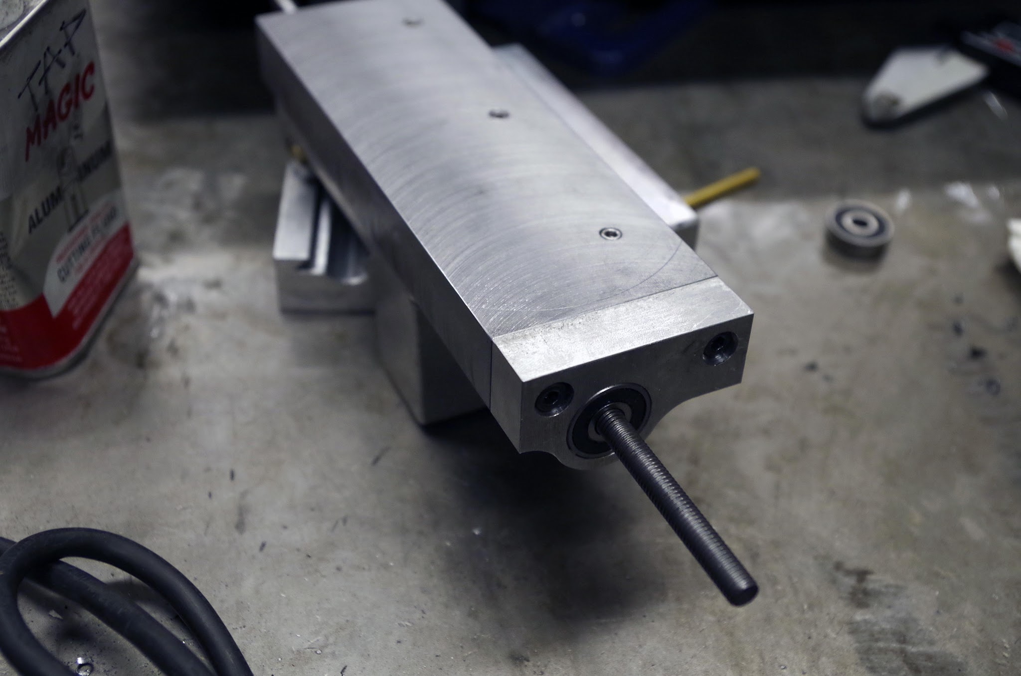 Bearing holders for the ballscrew were milled on the MITERS CNC mill. The ballscrew is retained radially by a single ball bearing, and axially by a pair of needle thrust bearings (not shown here):