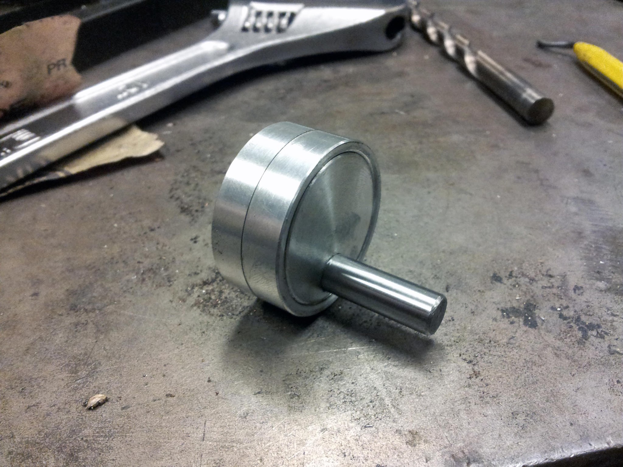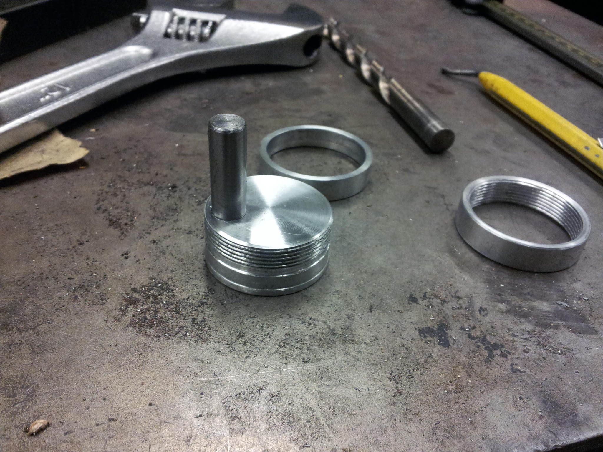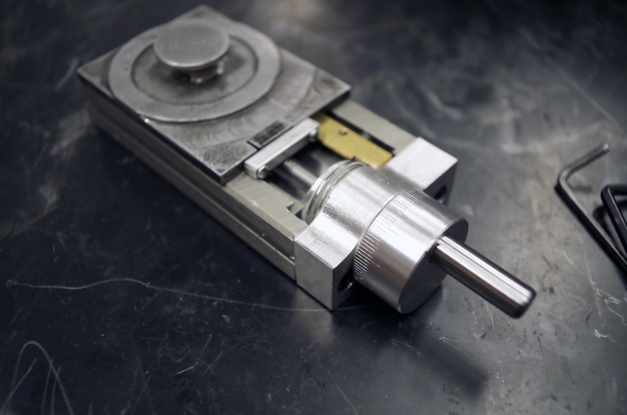 My first idea was to have a system vaguely like Bridgeport mill dials. There would be a ring with scribed markings on it which could be rotated and locked down by another threaded ring. Here's what the parts look like: A simple aluminum handwheel, with a solid stainless steel handle press fit into it. I really don't like the type with freely rotating handles - if there's any slop they feel cheap.